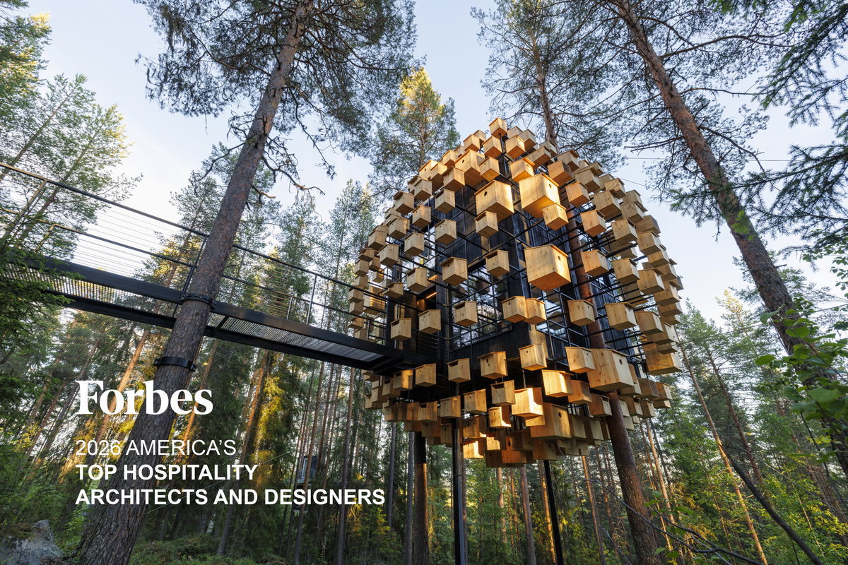 Forbes has included BIG on their inaugural list of America’s Top Hospitality Architects & Designers, recognizing the firms that are shaping the future of hospitality design. The list highlights BIG’s Biosphere project, the eighth room at the Treehotel in Swedish Lapland – a hotel known for its uniquely designed cabins, each with a distinct identity that responds to and interacts with the surrounding forest. Designed in collaboration with Treehotel and Swedish ornithologist Ulf Öhman, the Biosphere cabin is enveloped by 350 bird houses, aiming to decrease the downward spiral of the bird population in the region while immersing guests in nature.