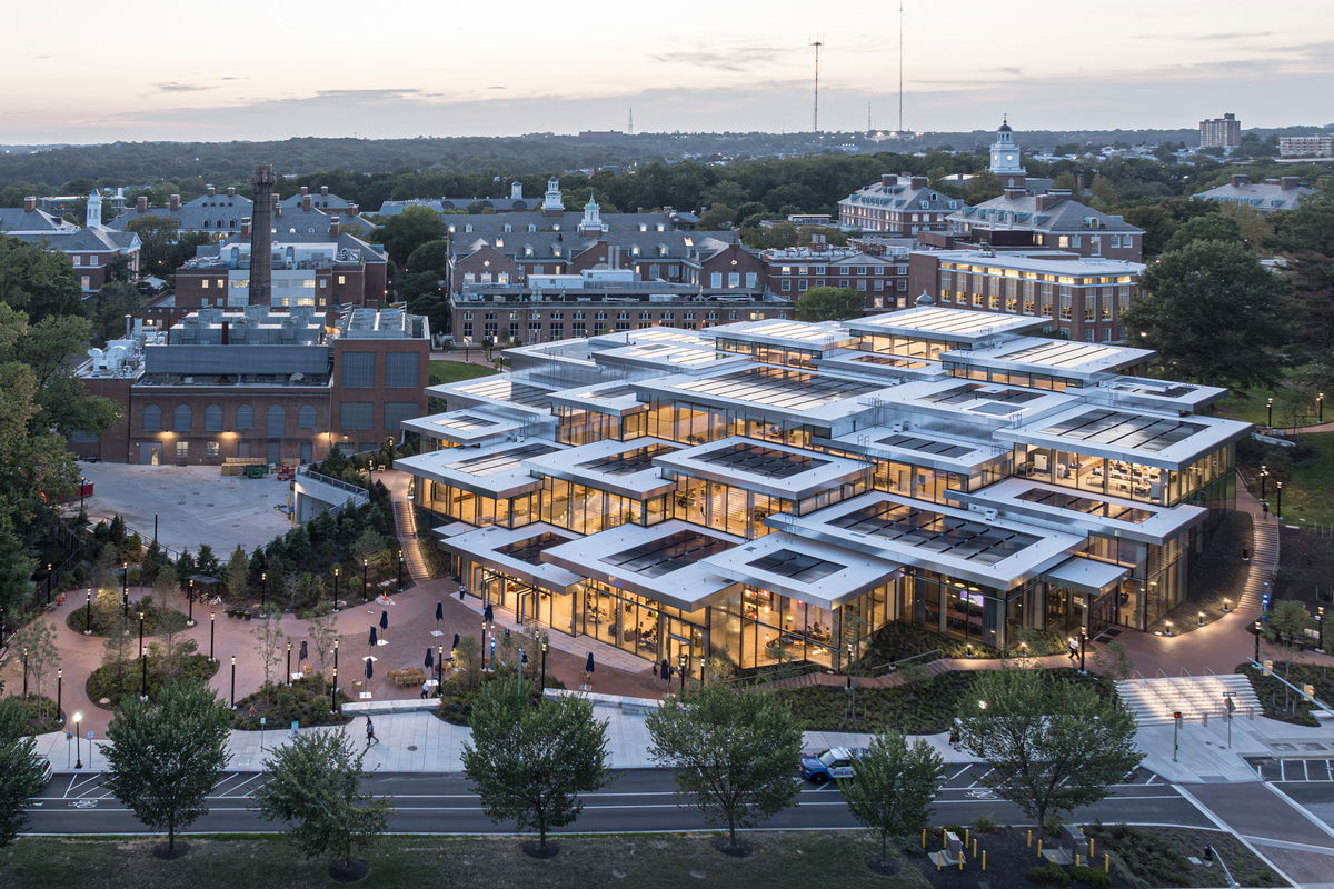 A new era of student life has begun at Johns Hopkins University with the opening of the Bloomberg Student Center, a mass timber village designed in collaboration with Shepley Bulfinch and Rockwell Group. As the first student center for Johns Hopkins University, the 150,000-sq-ft building provides a central gathering space for the university’s Homewood campus, featuring 29 “floating” cantilevered roof planes integrated with nearly 1,000 photovoltaic panels. The mass timber structure combines a digital media center, a 250-seat performance space, art and dance studios, music rehearsal spaces, a dining hall, and more all under one roof. Shaped through in-depth research into the students’ needs, the building is transparent by design, welcoming daylight from all sides and offering views into the ever-changing mosaic of student life within. “Where student activities at Johns Hopkins University were once dispersed all over campus and all over town, they are now collected and clustered at the Bloomberg Student Center – a village of timber pavilions climbing the natural hill on the university’s edge. Like the indoor counterpart of The Beach – the circular sloping front lawn of the Homewood campus – the Student Center is open and inviting in all directions. Tugged into the topography, the center is a four-story building where every floor is directly accessible from the outside, from every side. As the individual timber pavilions join together, they leave generous openings in between, allowing daylight and views to reach every corner of the building. At its heart – underneath the solar paneled rooftops – the creative commons is a cascading, four seasons meeting space for students and faculty – academic, cultural, and social activities alike. The mass timber construction not only substantially reduces the embodied carbon footprint of the building, but also provides an atmosphere of welcoming warmth and inviting informality.” – Bjarke Ingels, Founder & Creative Director, BIG
