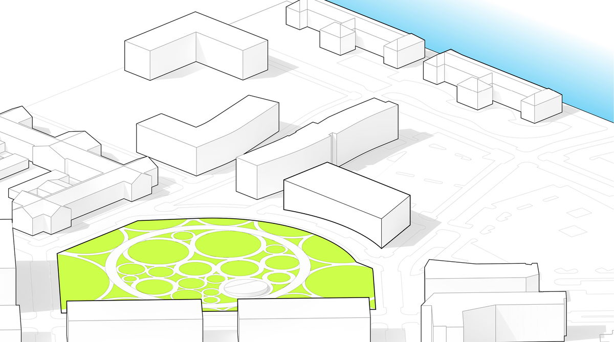 Context — The form responds to the adjacent Central Green, flexing inwards along its curvature to strengthen the connection between building and park.