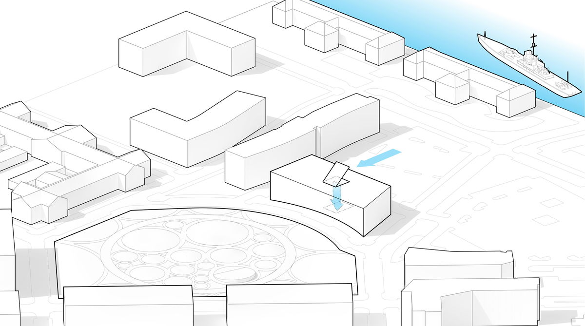 “The ‘shock wave’ of the public space spreads like rings in the water, invading the footprint of the building to create a generous urban canopy at the entrance. The resultant double-curved façade echoes the complex yet rational geometries of maritime architecture. Inside, the elevator lobby forms an actual periscope, allowing people to admire the mothballed ships at the adjacent docks.”Bjarke Ingels - Founder & Creative Director, BIG