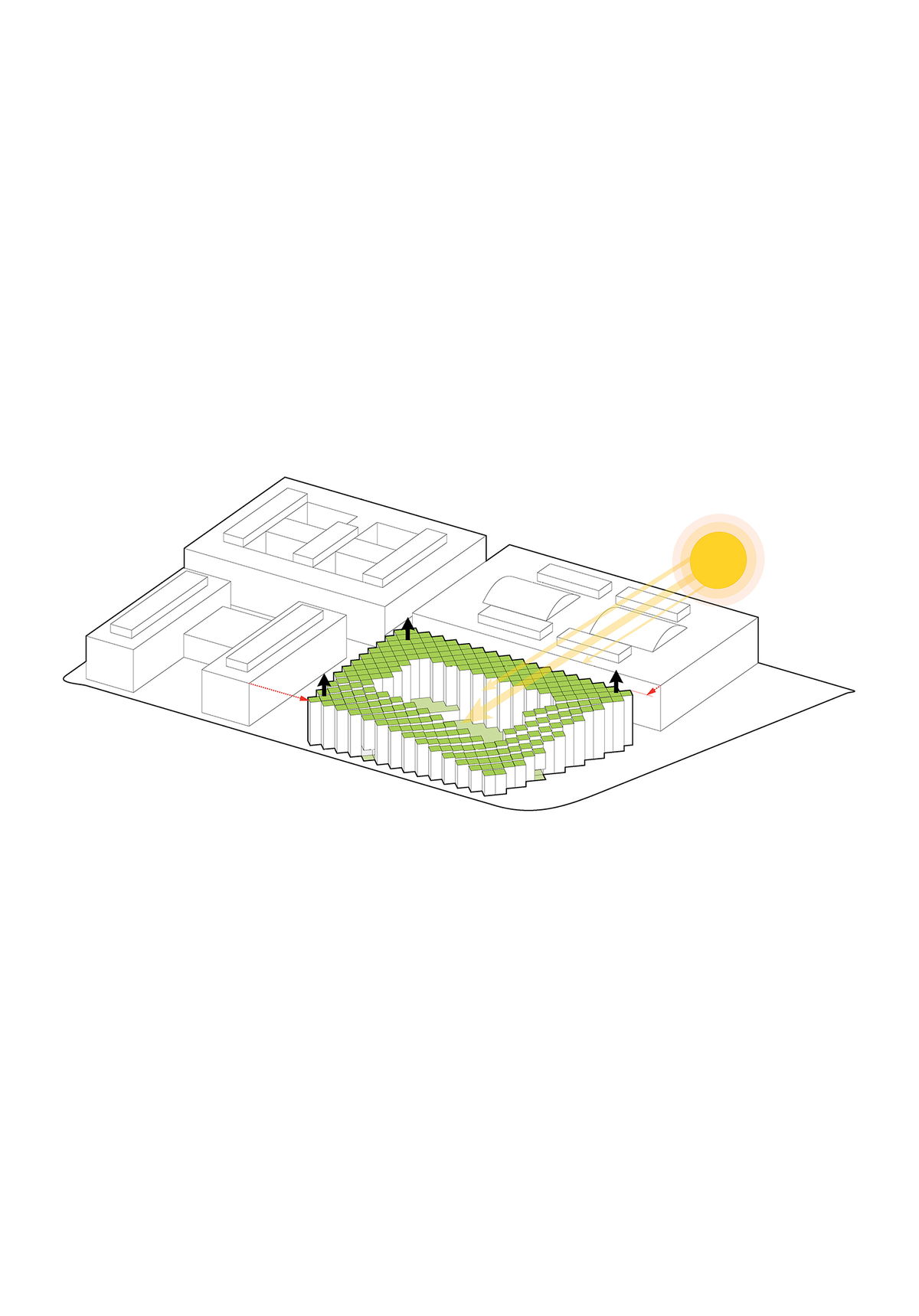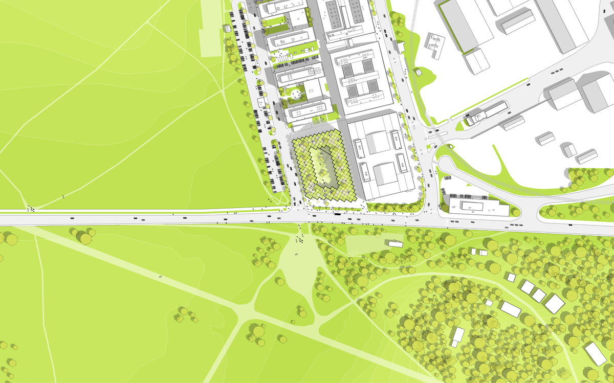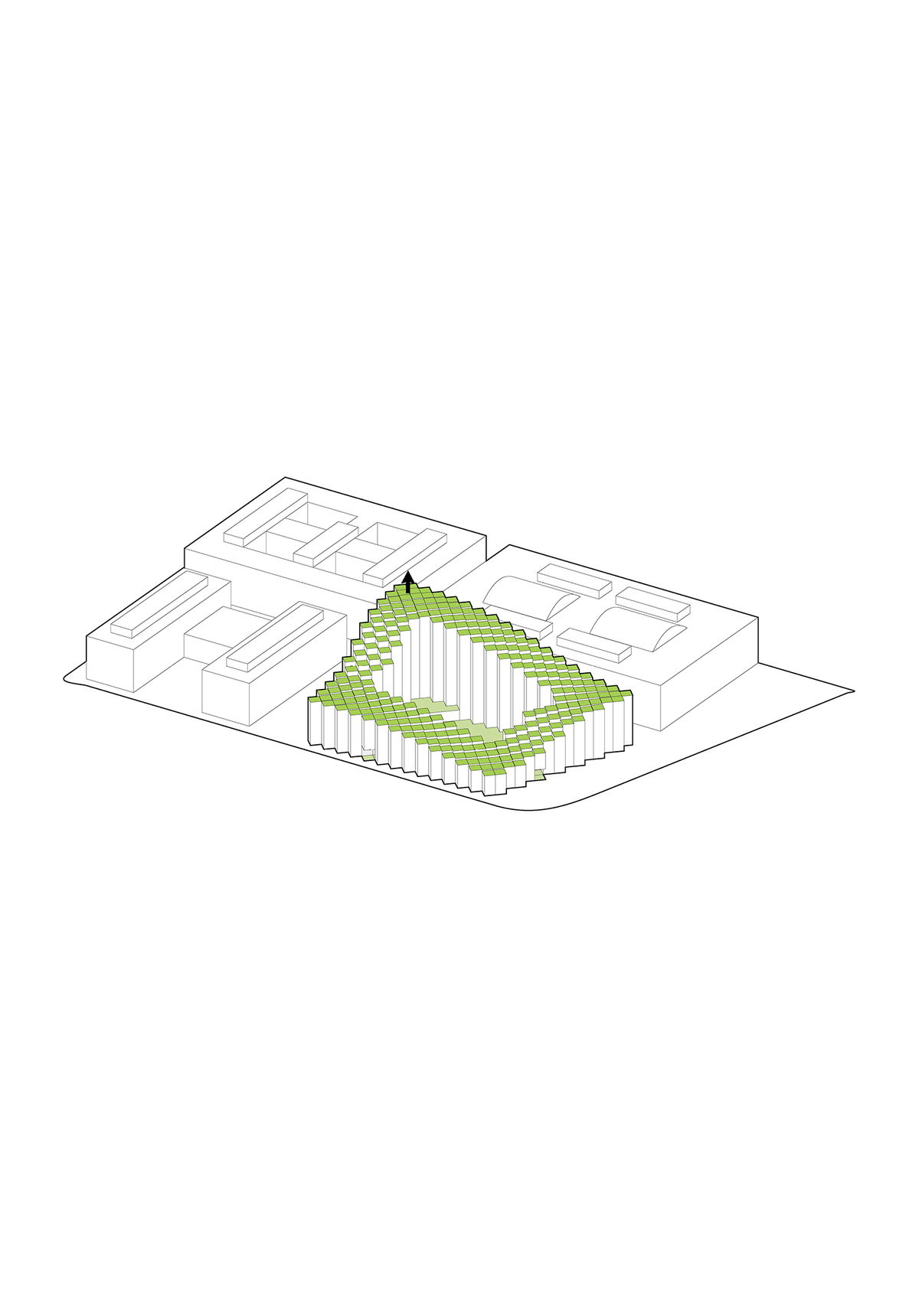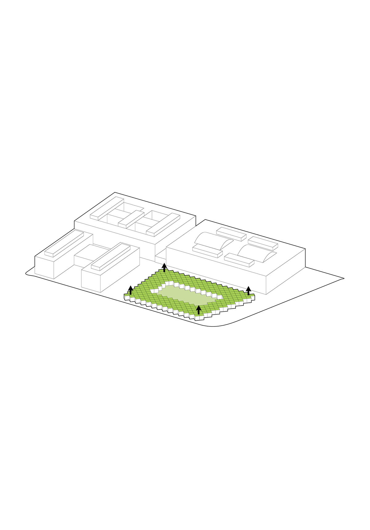EXTRUSION — A regular grid of squares is extruded to create a perimeter block that borders the site.