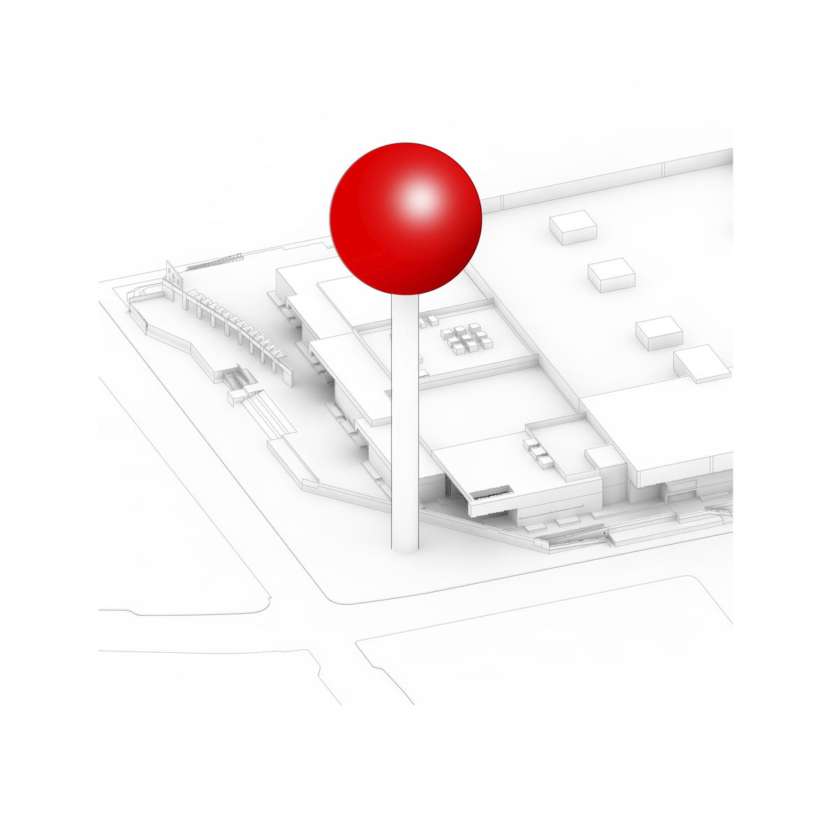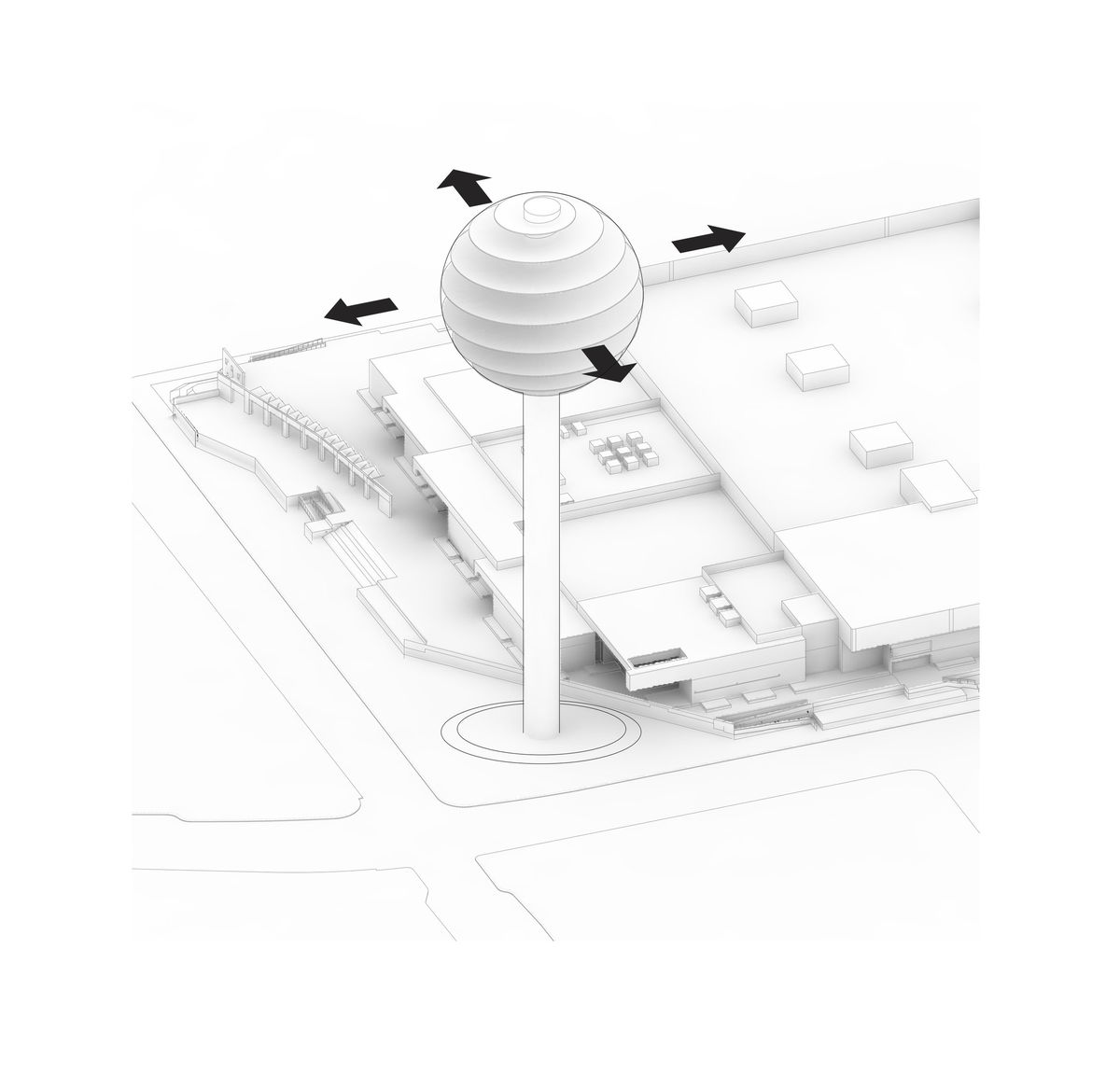 The Pin — The massing of the tower is a simple sphere on a stick, a metaphorical pin on a map firmly marking the location. It is instantly iconic, an extremely "local" and at the same time universal symbol.