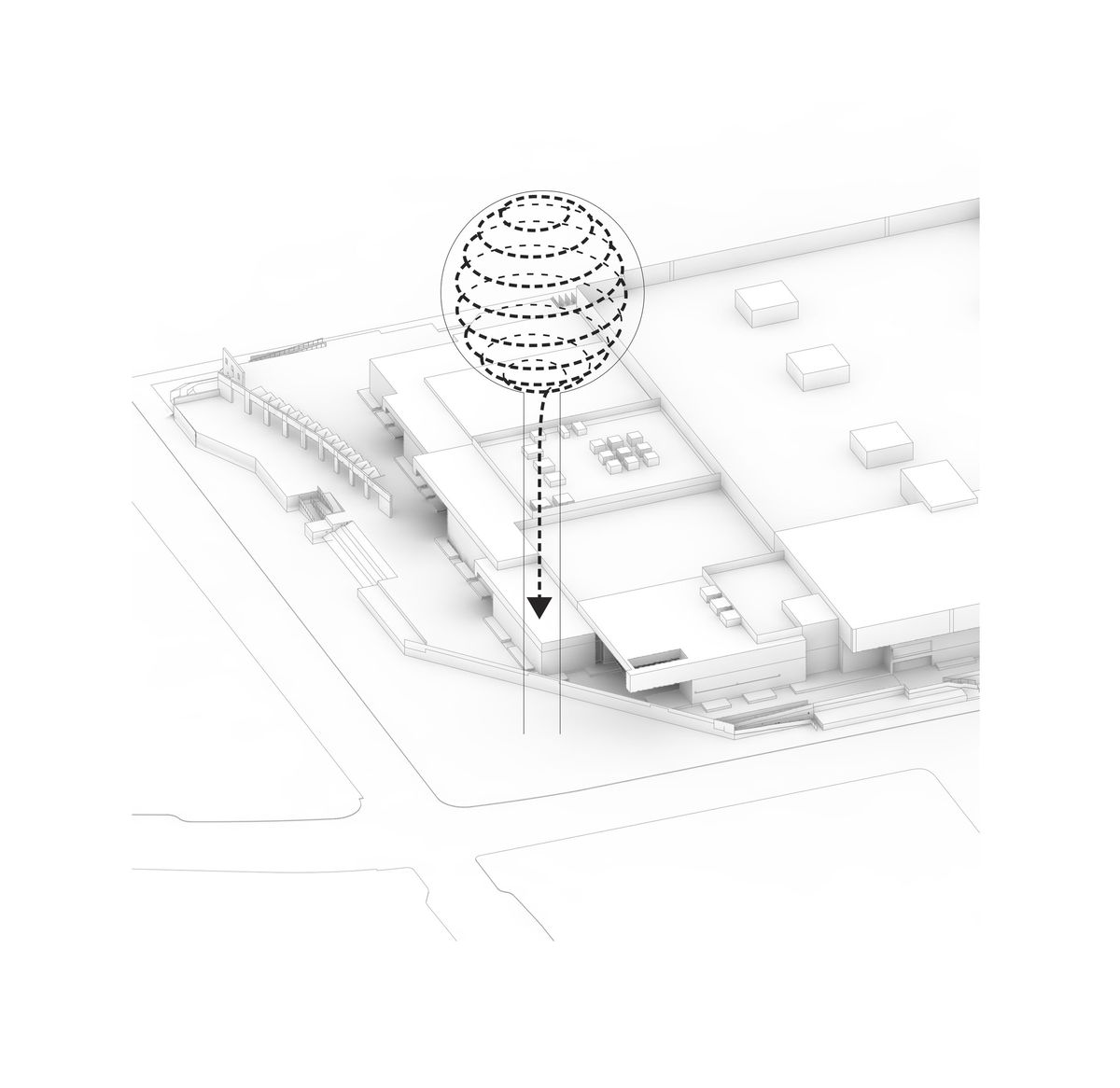 PROGRAM — The programs are organized in a linear sequence of spaces coiled up in a spiral making program and circulation inseparable.