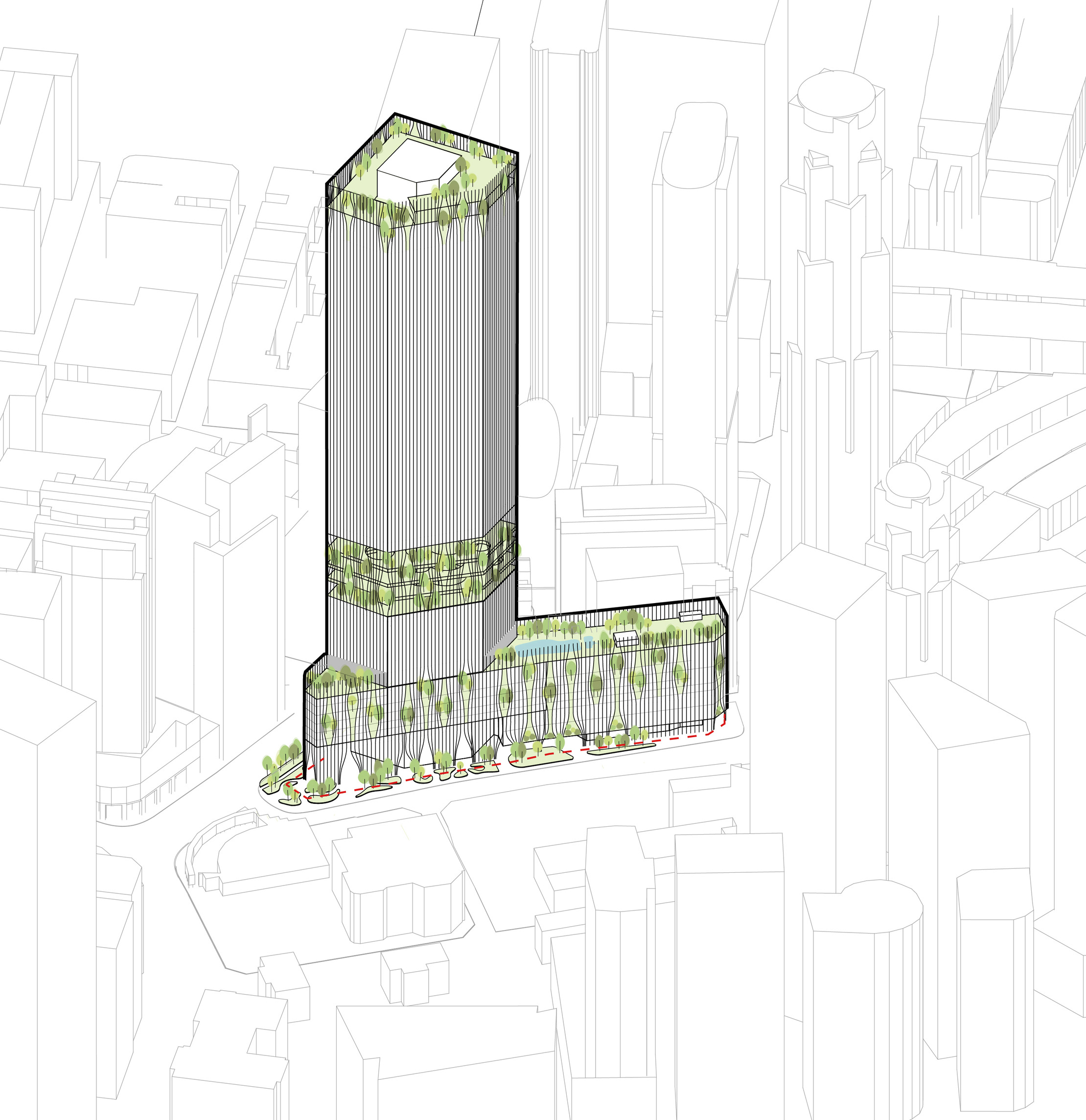 A vertical park is inserted in the middle of the tower in the form of a spiraling promenade ascending among tropical tree trunks and canopies.