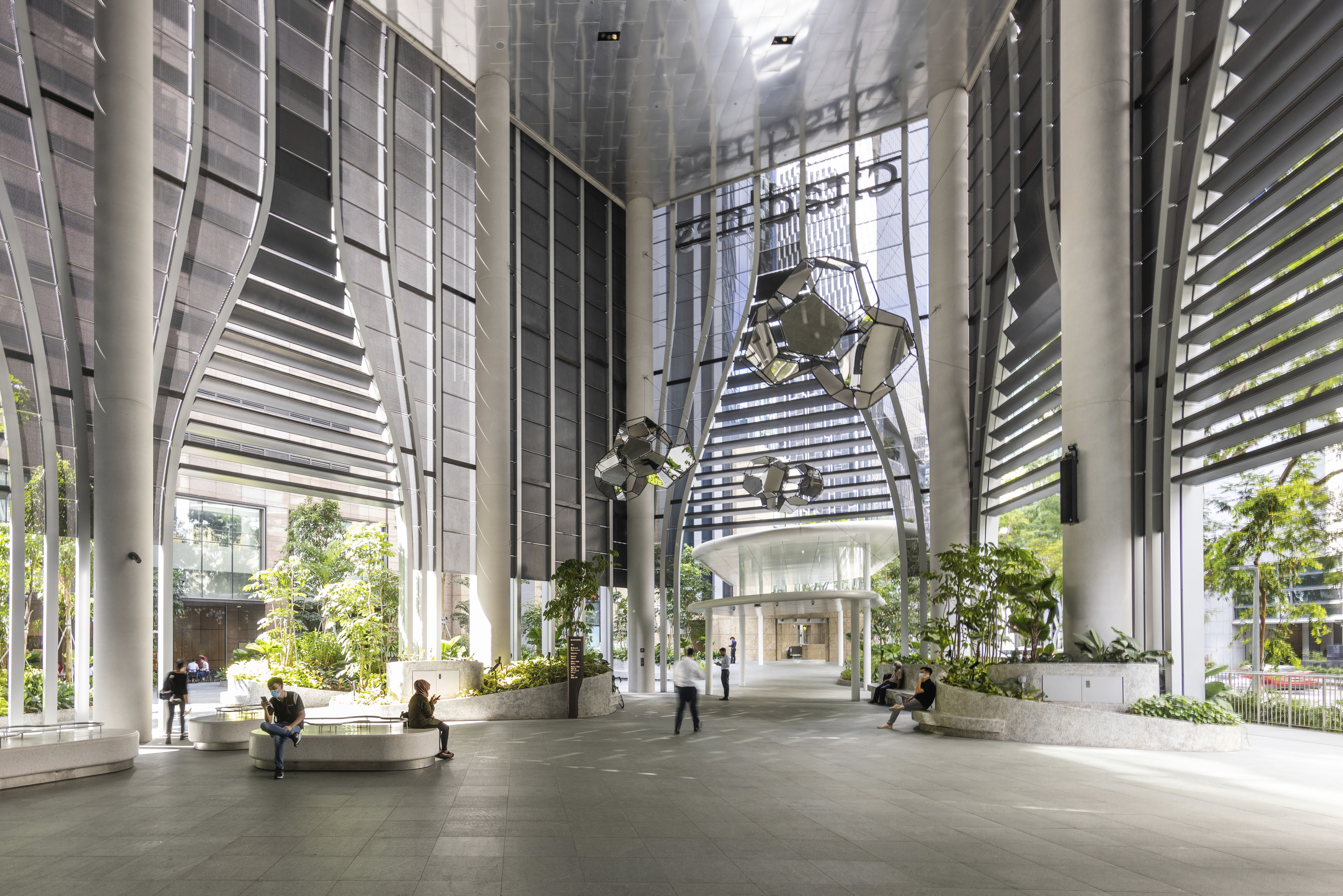 At the ground floor, visitors are met by a new linear public rainforest plaza and park. Meandering garden paths and covered passages create natural entryways into the City Room, a 19 m high generous open space at the foot of the tower.