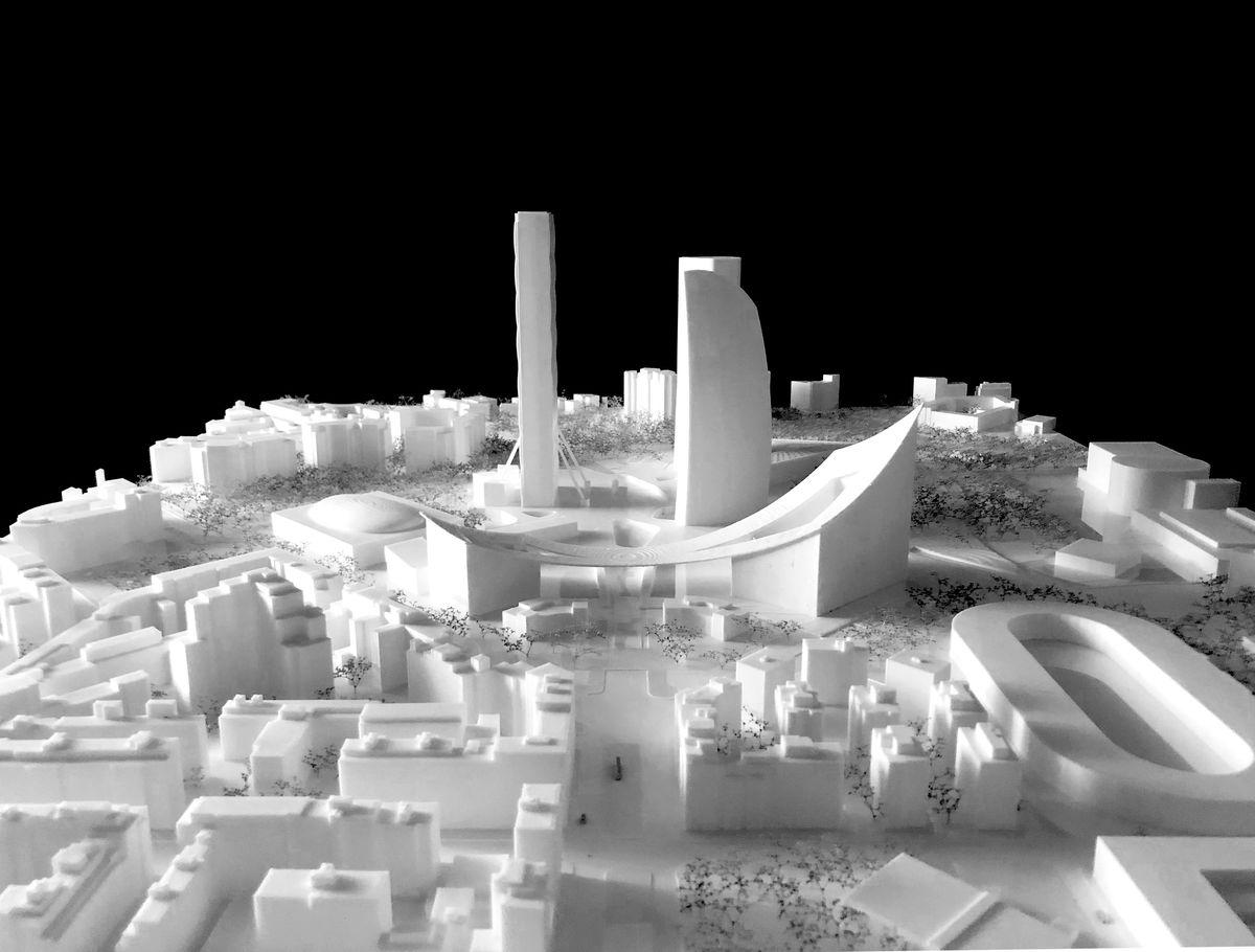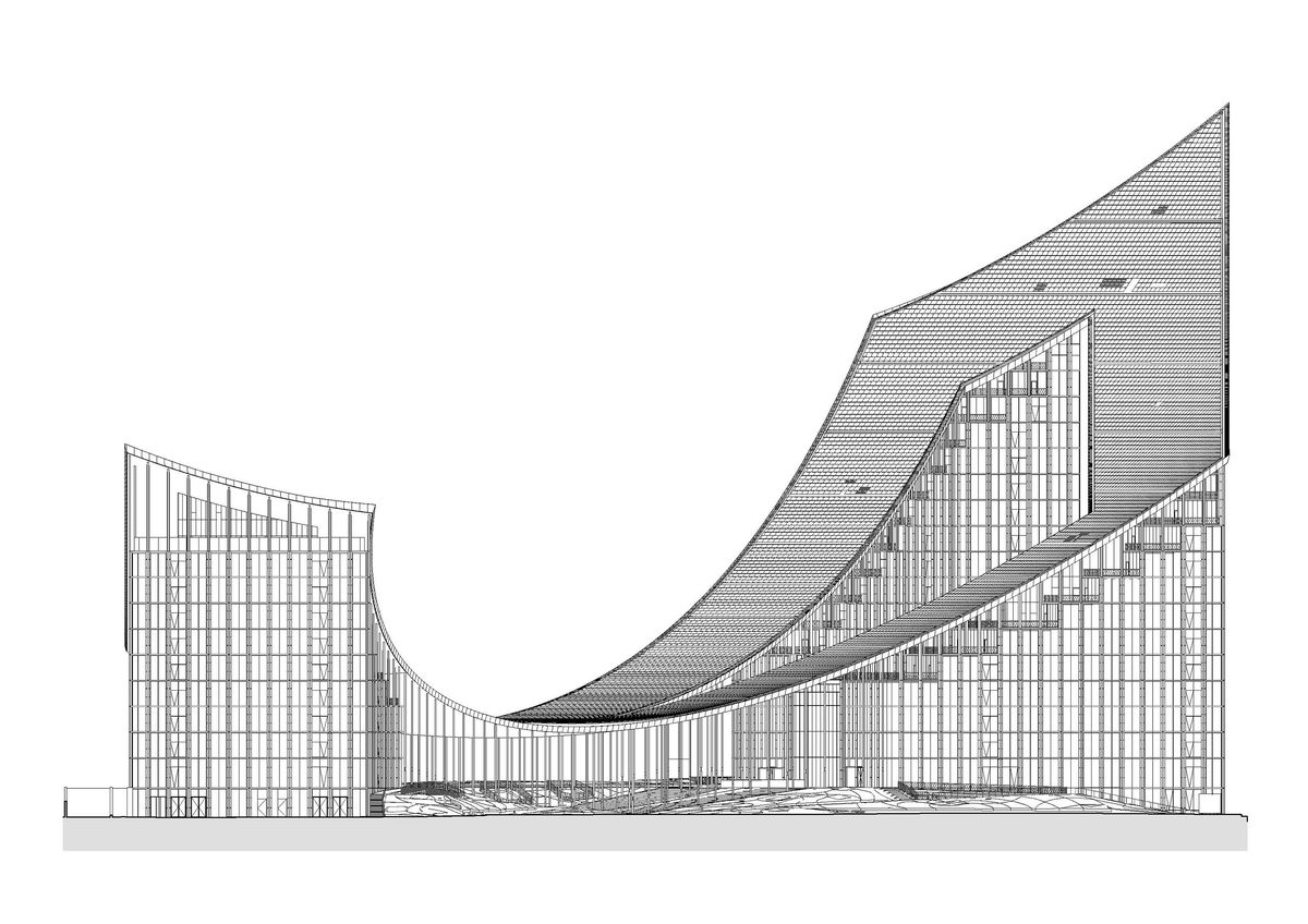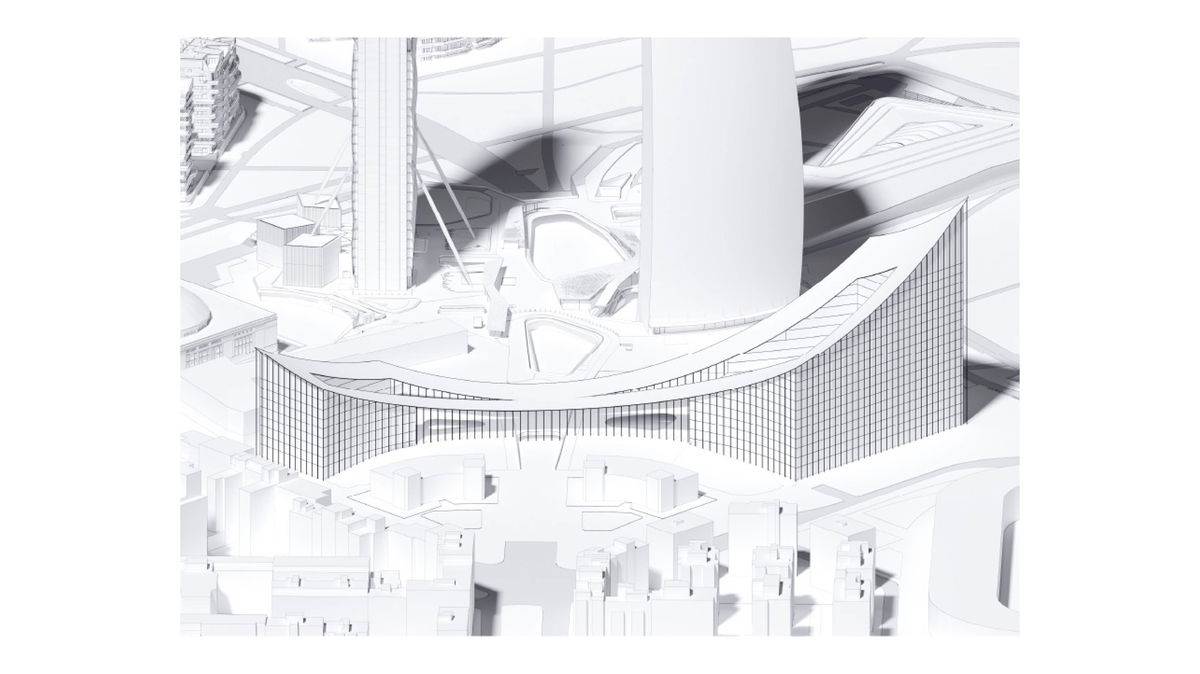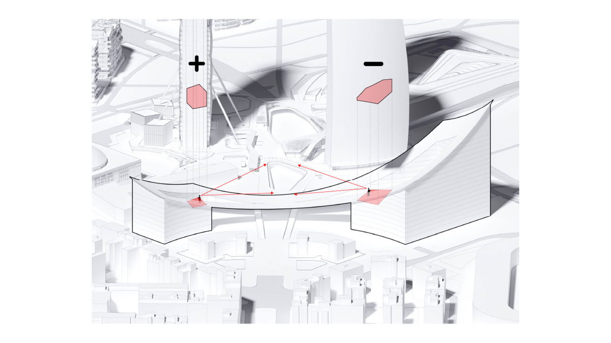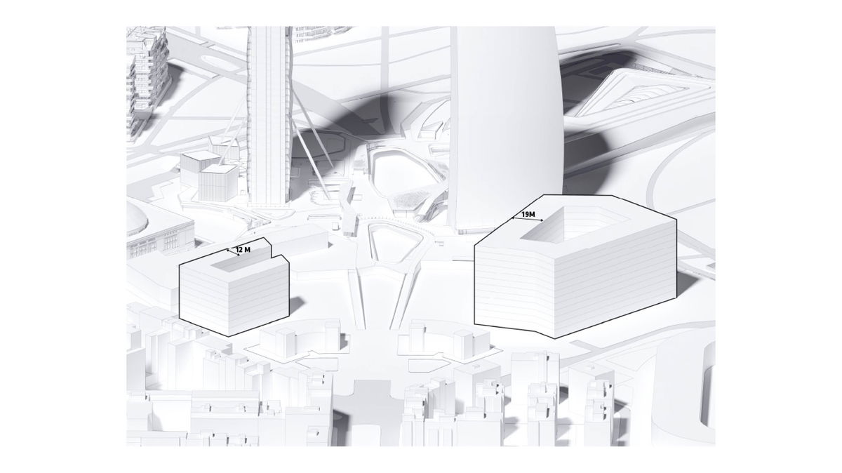 RELATIONSHIP TO THE AXIS — To unify the two irregularly shaped plots, we generate two simple curves formed by circles on each side: one created by the end of the axis and the other by Piazza Tre Torri, the epicentre of the site. The geometry of the roof is generated as a wedge of a sphere, resulting in a massing that reads as a single gesture. The profile of the roof emphasizes the axis by lifting up the edges and lowering towards the centre. With this move, we unite the two buildings into a single form. The two buildings reach 105 m and 53 m, respectively, at their highest points.