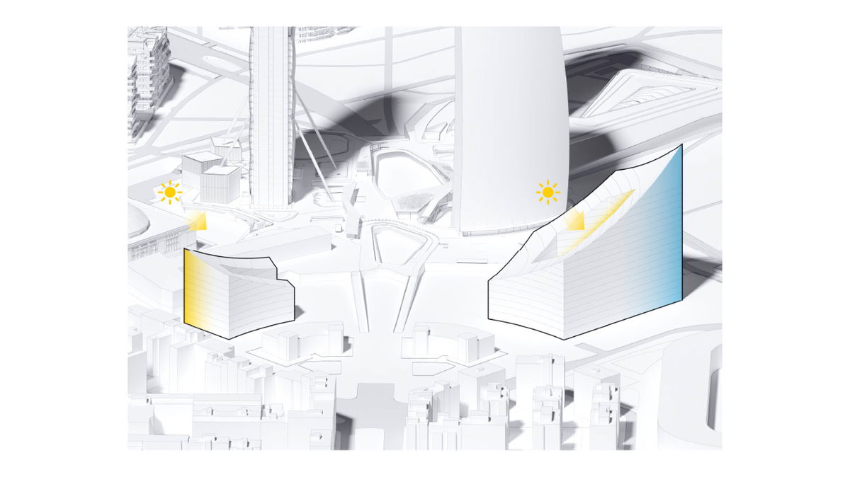 BIG'S PROPOSAL — Instead, BIG proposed a new typology for the city: a continuous canopy structure that unifies two buildings, divided by a shaded pedestrian plaza at the centre.
