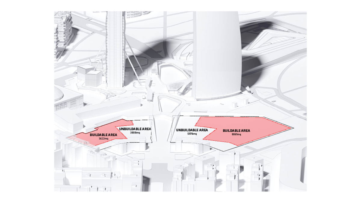 SITE — The site of the competition is comprised of two distinct plots facing each other. The Domodossola axis separates and restricts the buildable area for both plots at the street level, while below ground, the tunnel for the Line 5 metro demarcates the two plots.