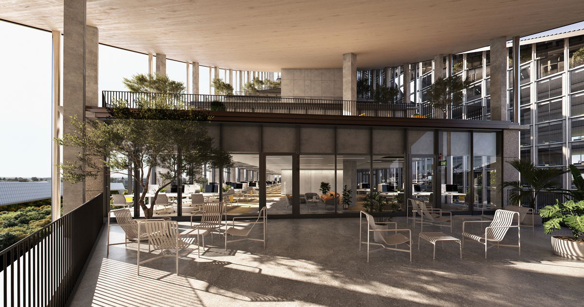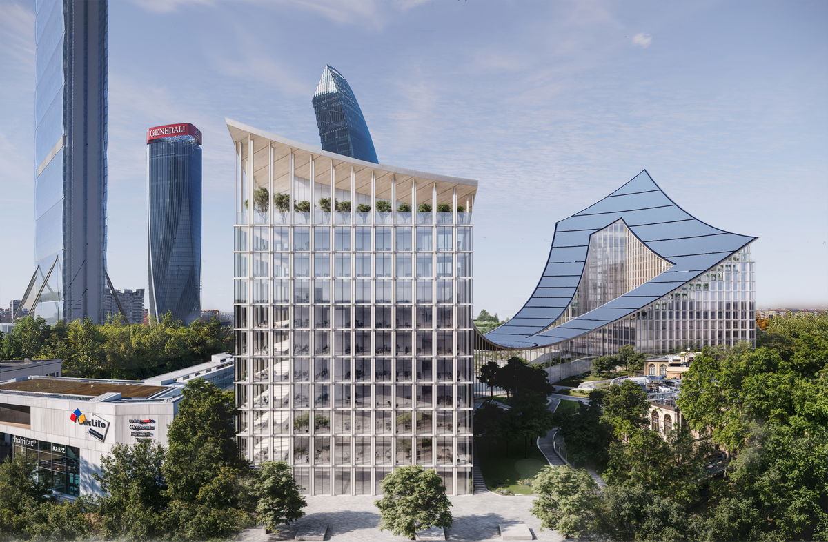TERRACES — A portion of the one tower's closed courtyard is removed to create an outdoor terrace, while a portion of the other tower's courtyard is added back to the massing to enclose the atrium. This creates extraordinary office terraces that visually connect all the amenities, the other building, the three towers, and the entire CityLife park.