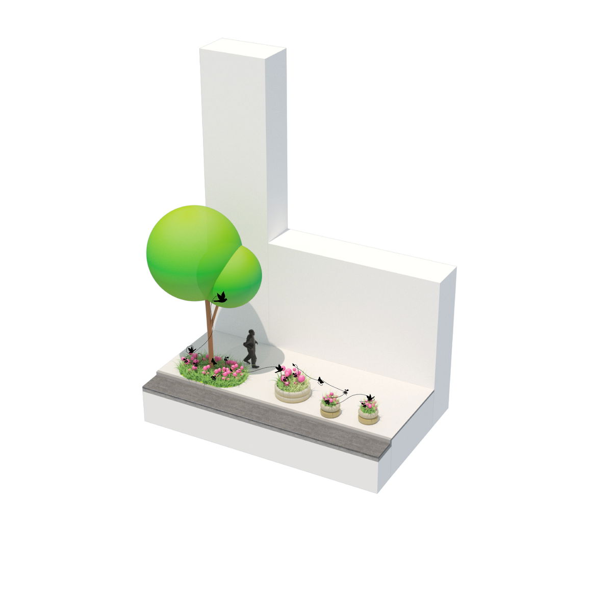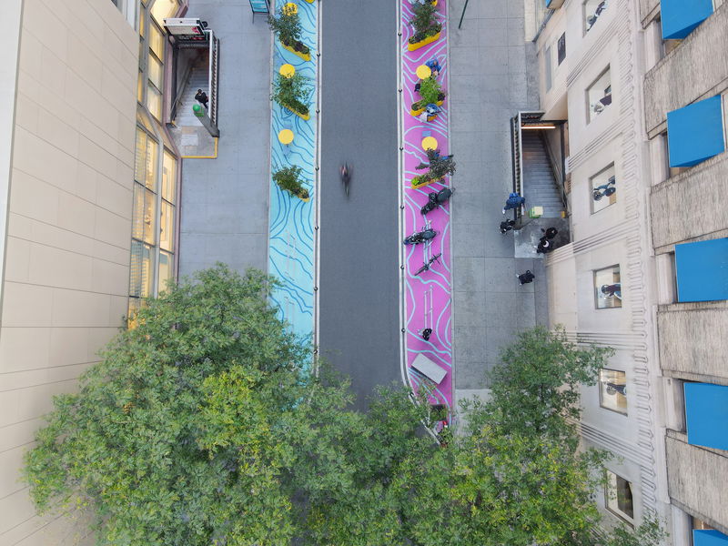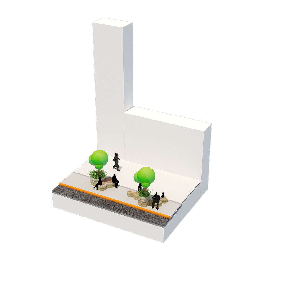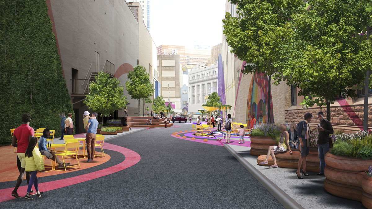 SHARED STREET — The sidewalk characters overlap in the shared streets, where the removal of curbs allows the softened edges to extend across the roadway.