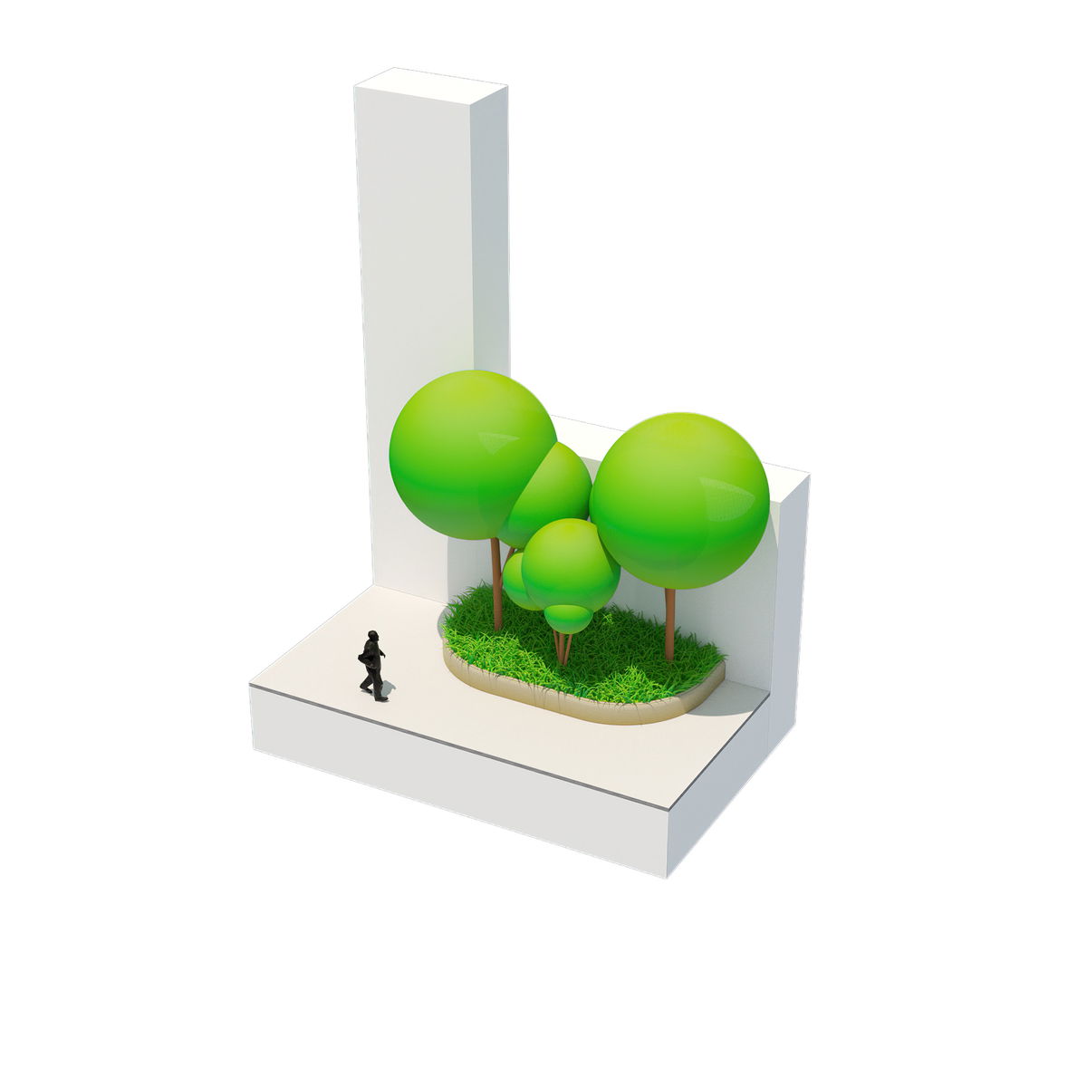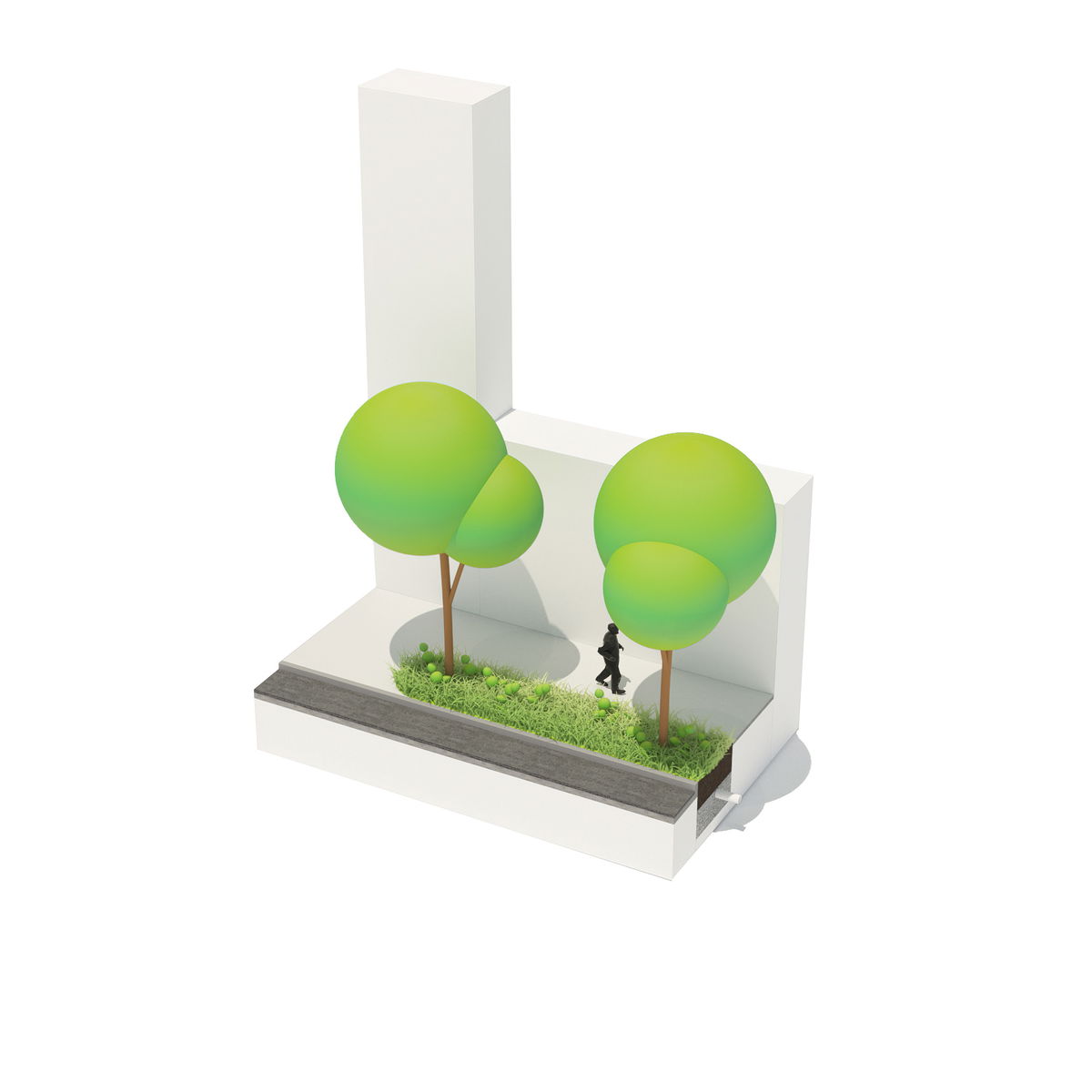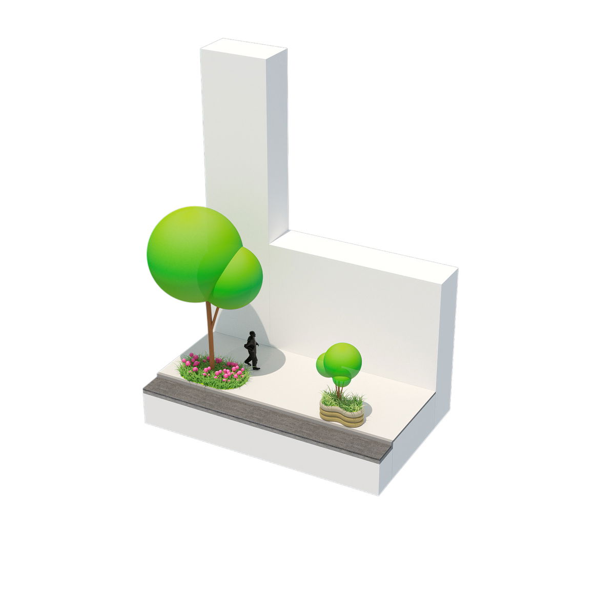 SHARED STREET — The sidewalk characters overlap in the shared streets, where the removal of curbs allows the softened edges to extend across the roadway.