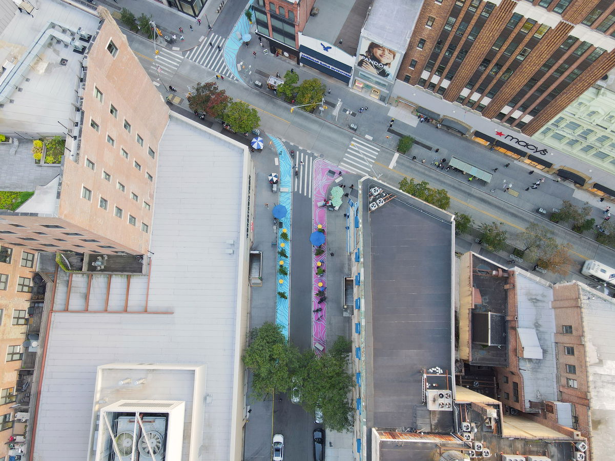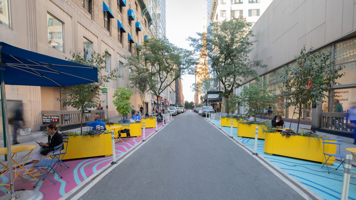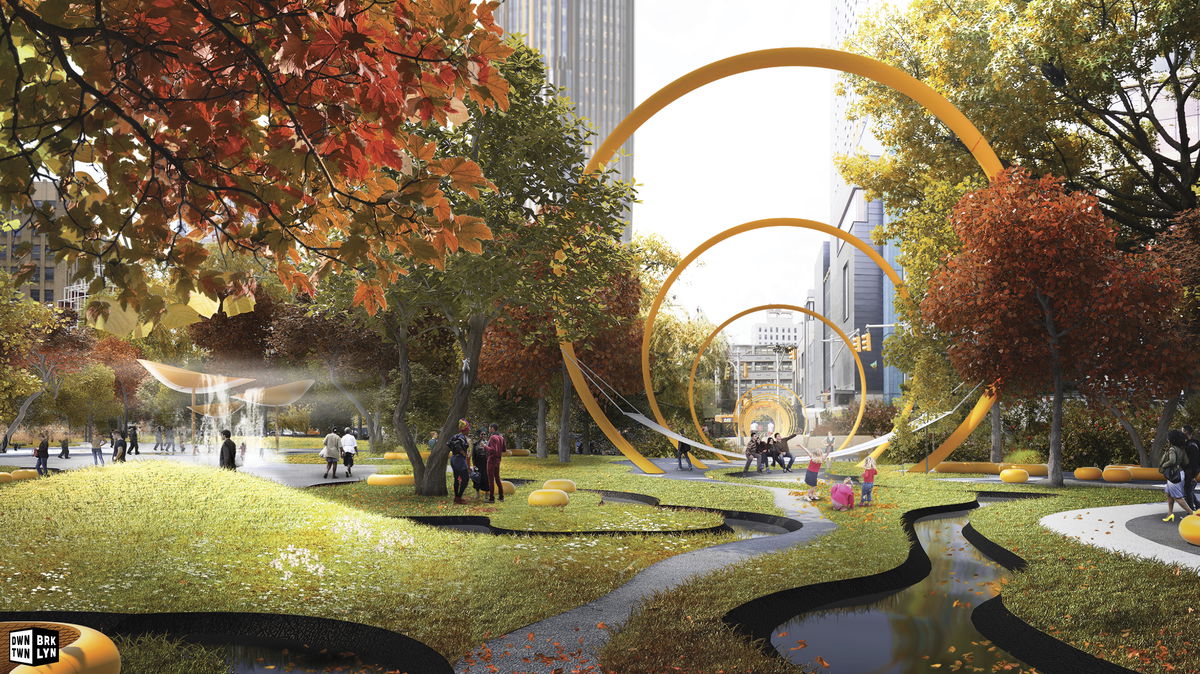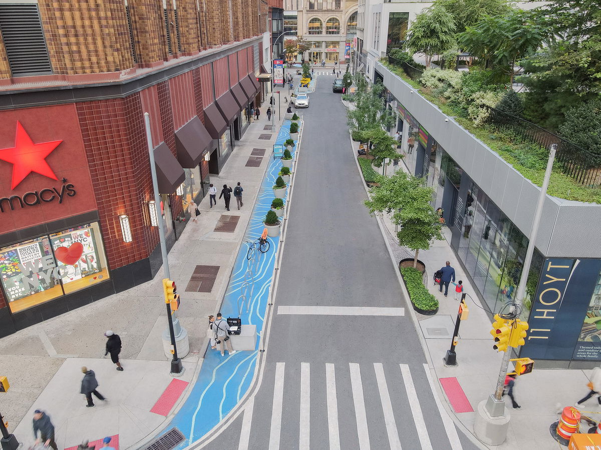 BUS LANE — Along Fulton Mall, the sidewalk pattern extends over the road to define the bike and bus lanes.