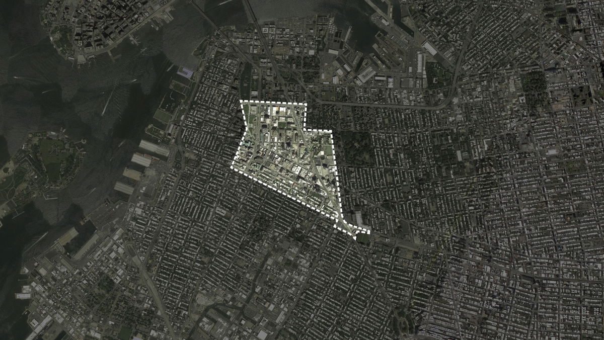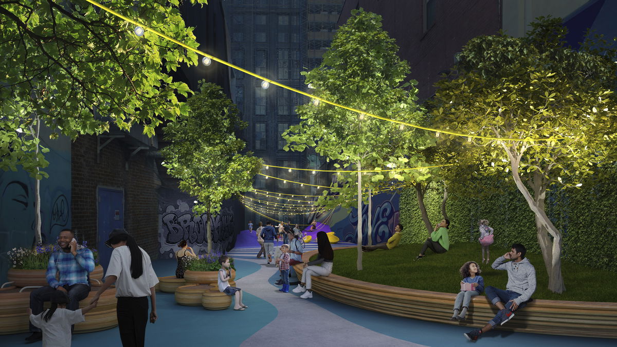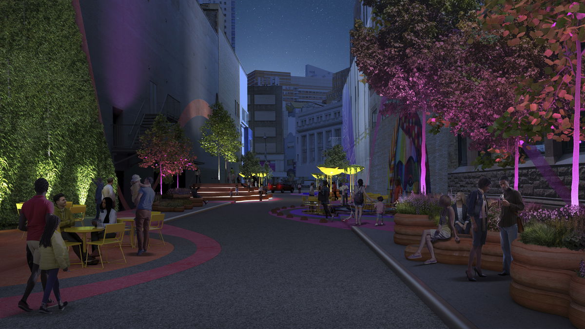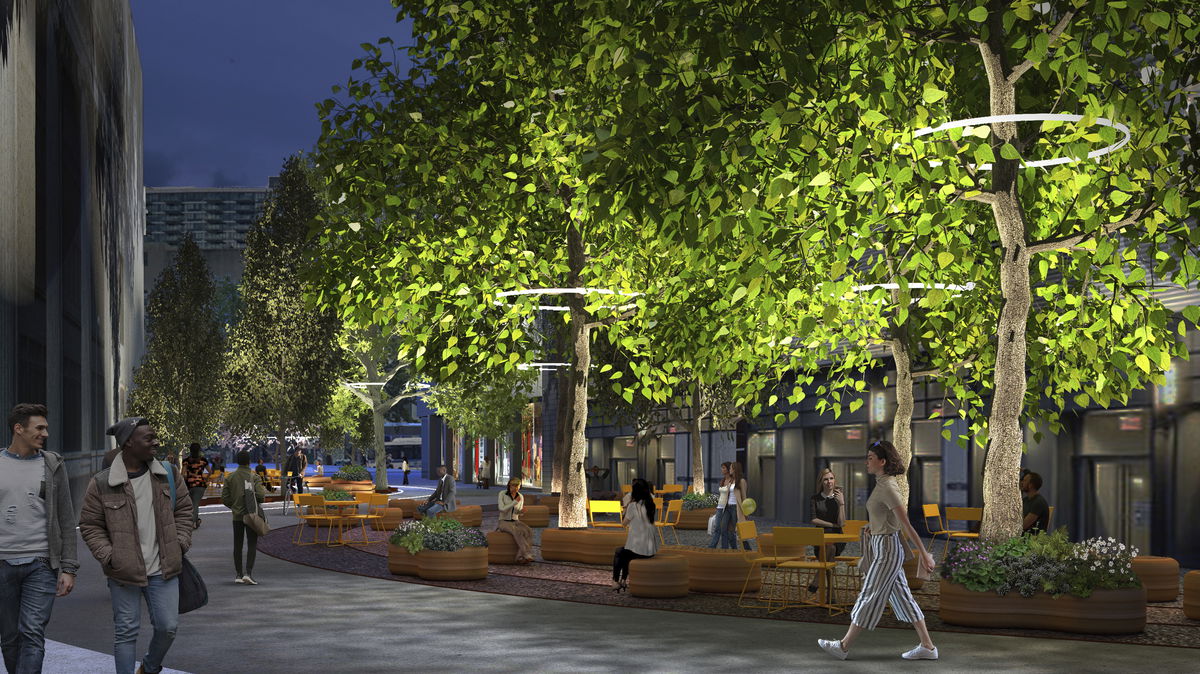 BUS LANE — Along Fulton Mall, the sidewalk pattern extends over the road to define the bike and bus lanes.
