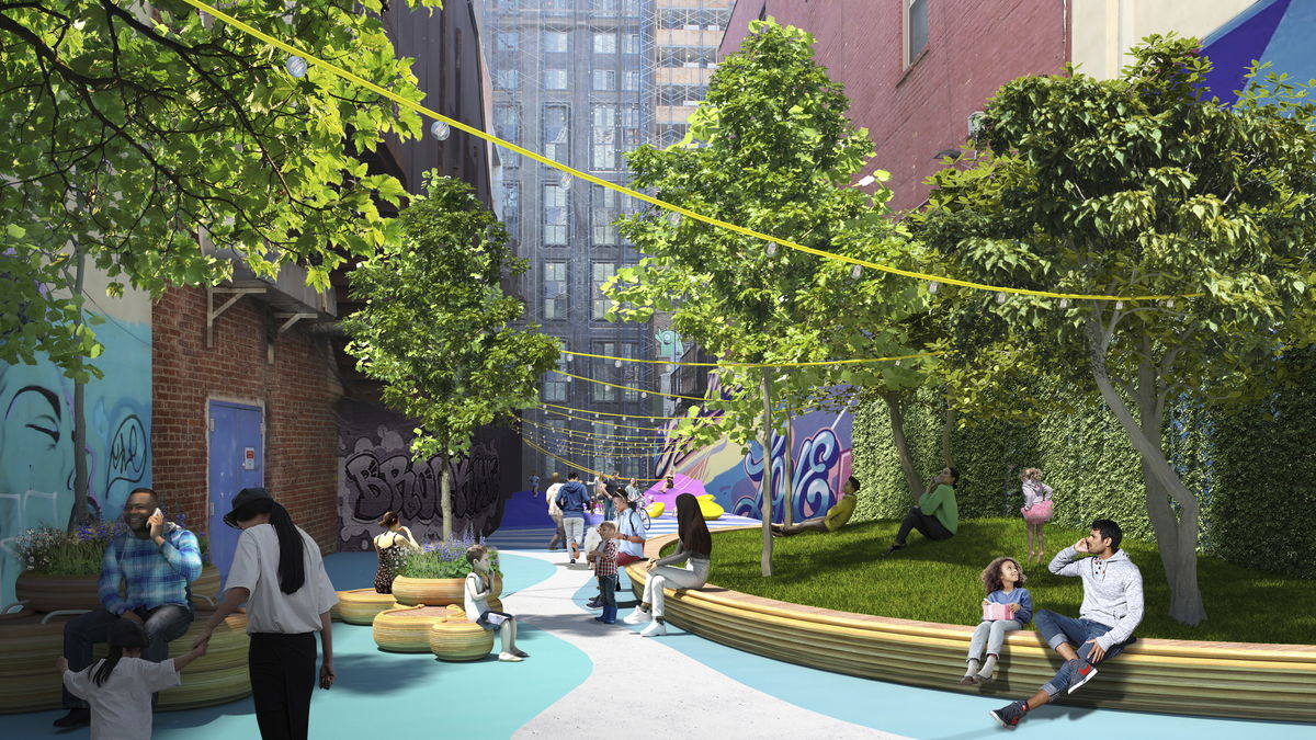 SOFTENED SIDEWALK — By smoothing the corners and removing curbs in potential shared streets, the sidewalks become a place to gather rather than just a walkway.