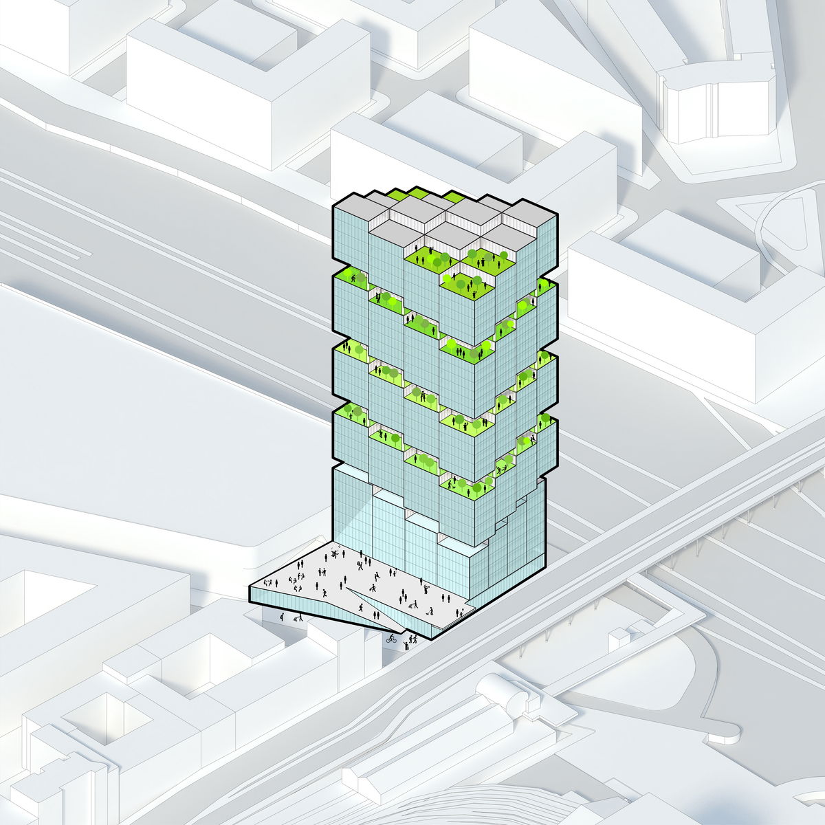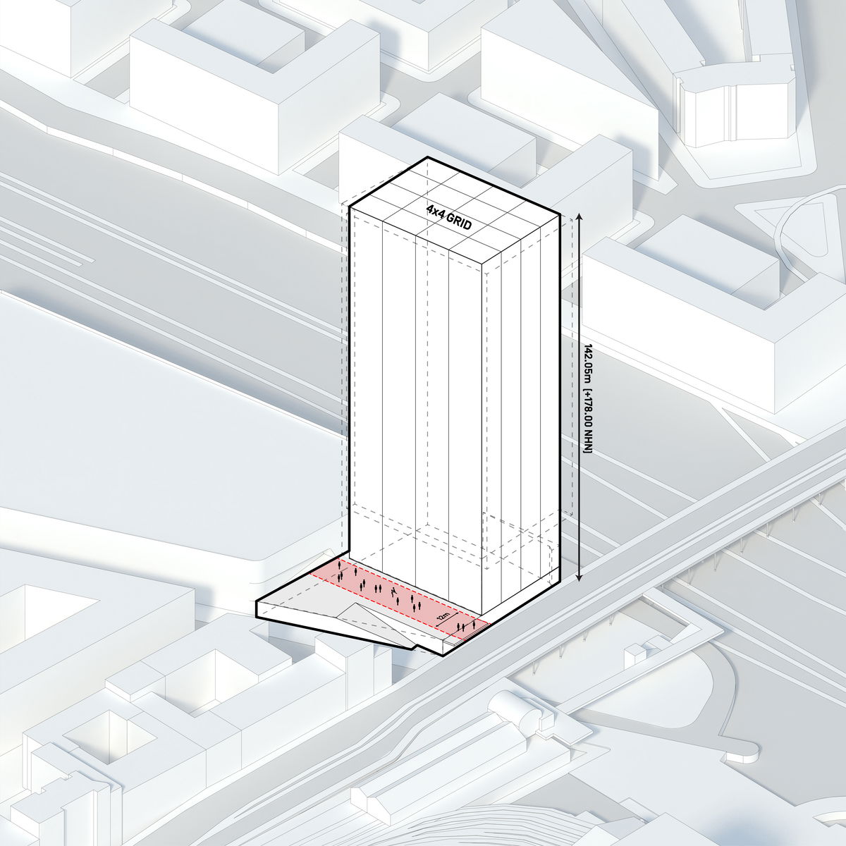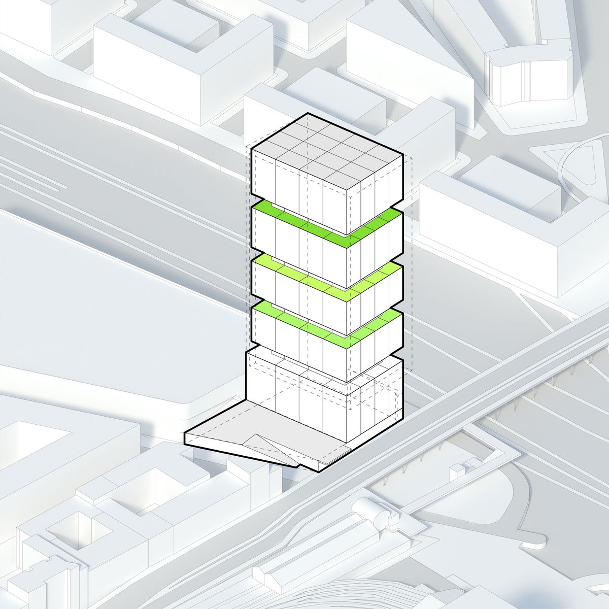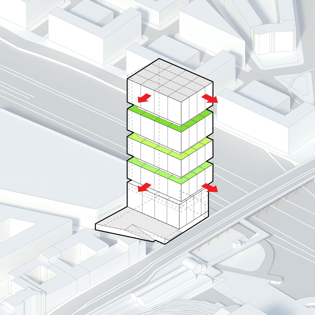 — With 80,560 m2 of available development area and limitations due to the train station access across the building, extruding the base area upwards maximises the available volume and defines the scale of the tower.