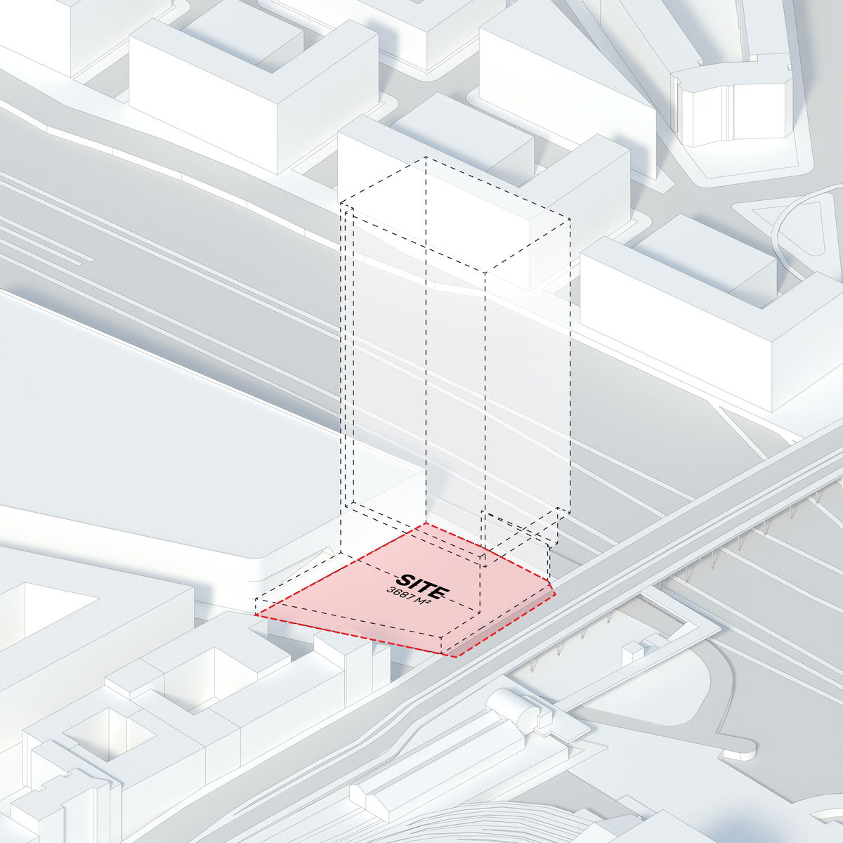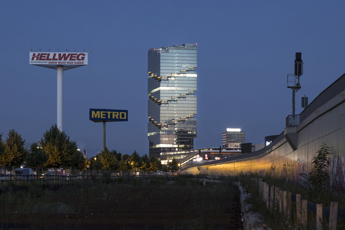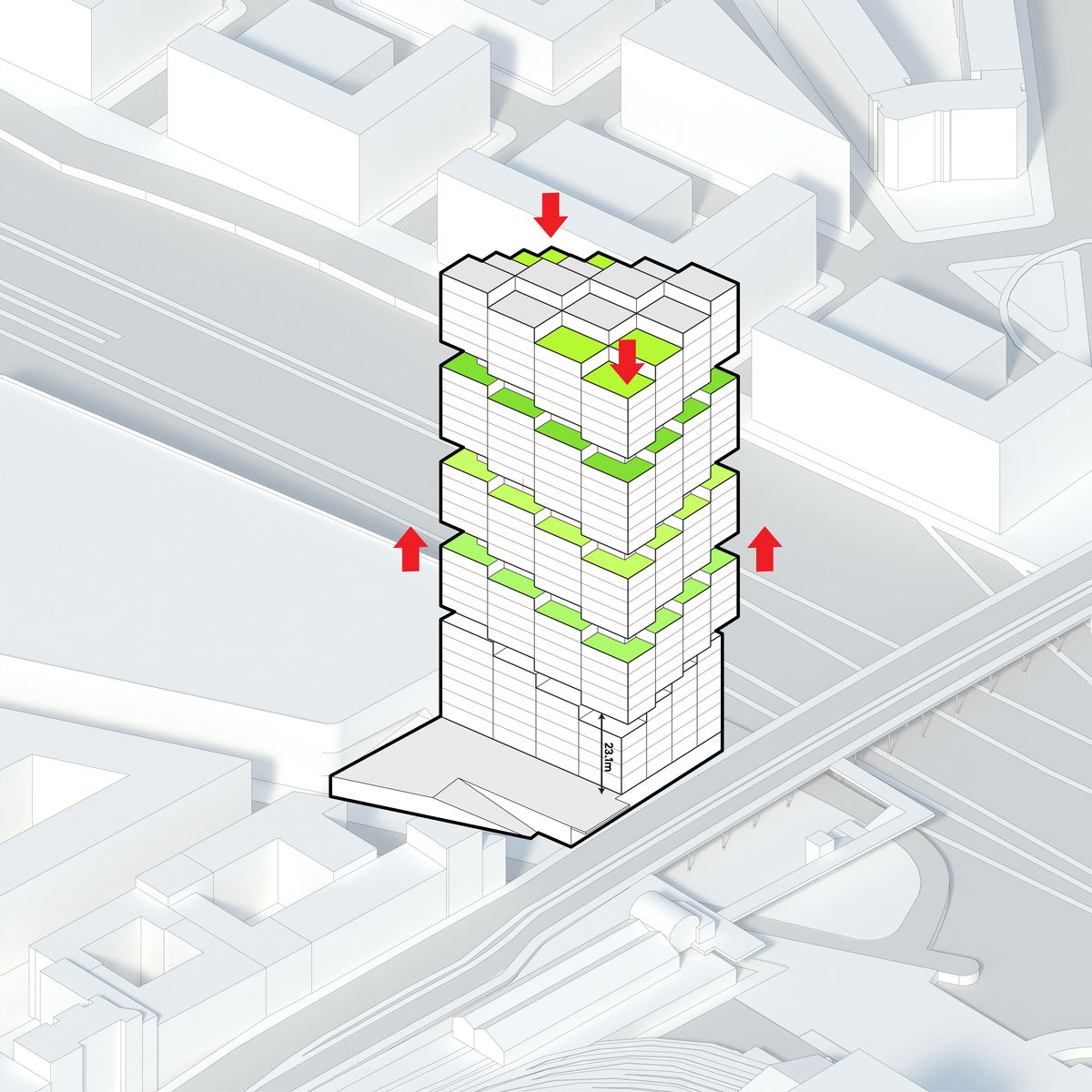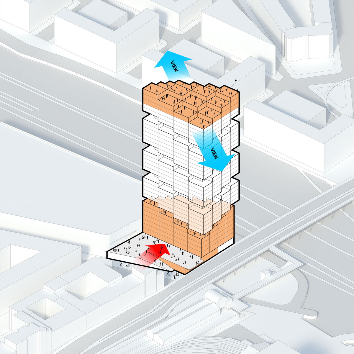 — With 80,560 m2 of available development area and limitations due to the train station access across the building, extruding the base area upwards maximises the available volume and defines the scale of the tower.