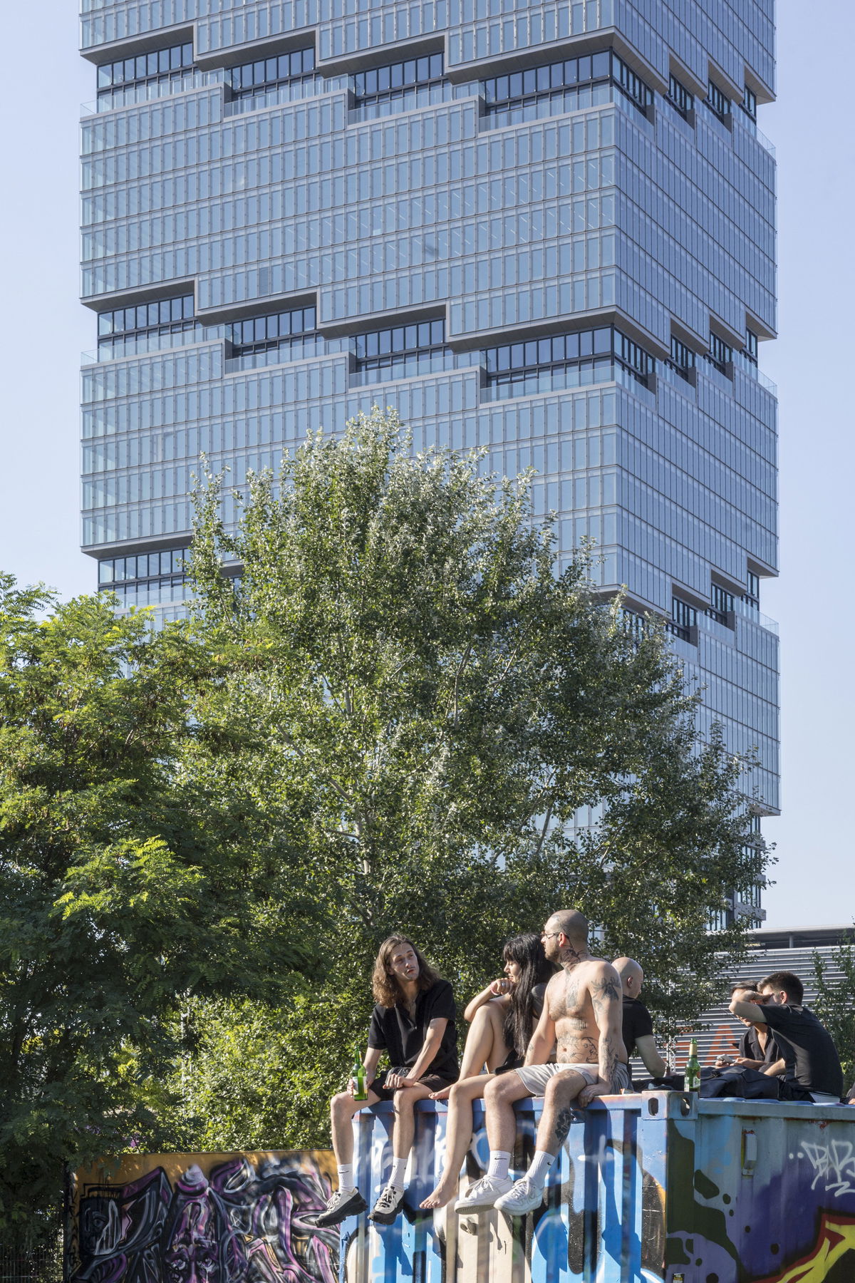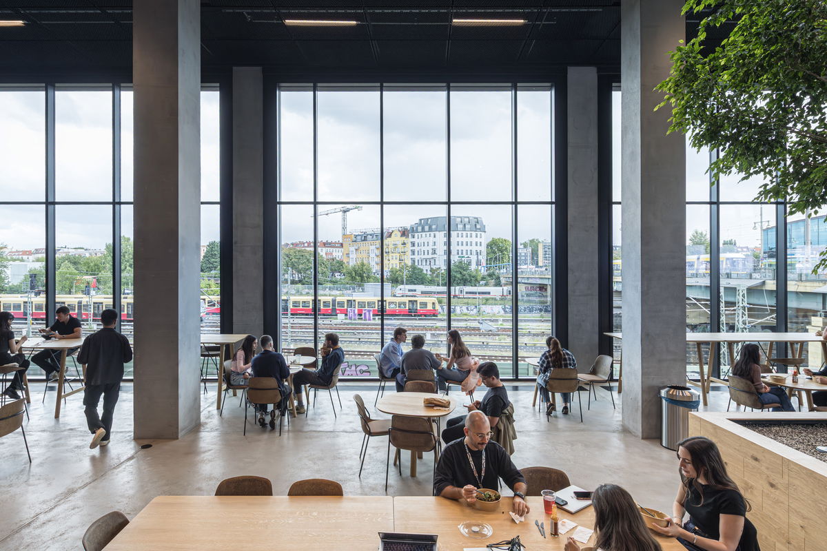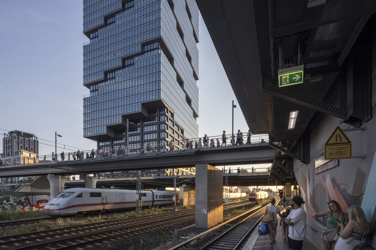 — EDGE East Side Berlin is integrated within the existing urban fabric in Friedrichshain-Kreuzberg, while inviting both the local community and tower occupants inside with publicly accessible amenities at the top and bottom of the building.