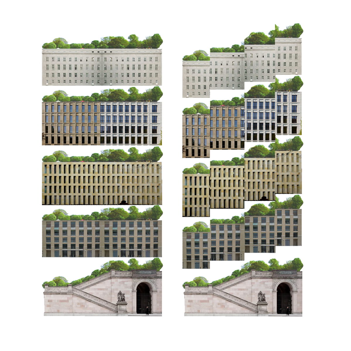 — Splitting the extruded form into six-storey blocks creates a stack of 'Kievs,‘ or Berlin city-blocks.' External spaces between these blocks break up the mass of the building into units of a more familiar scale.