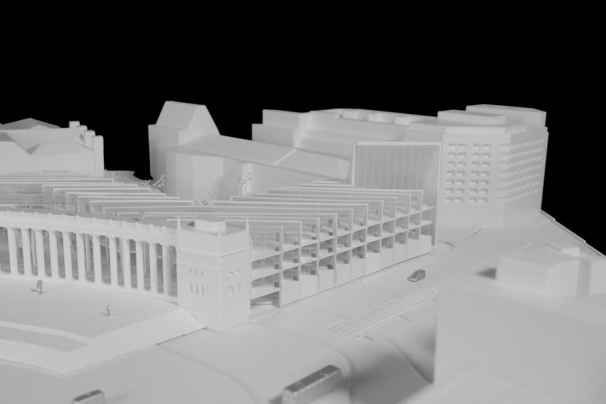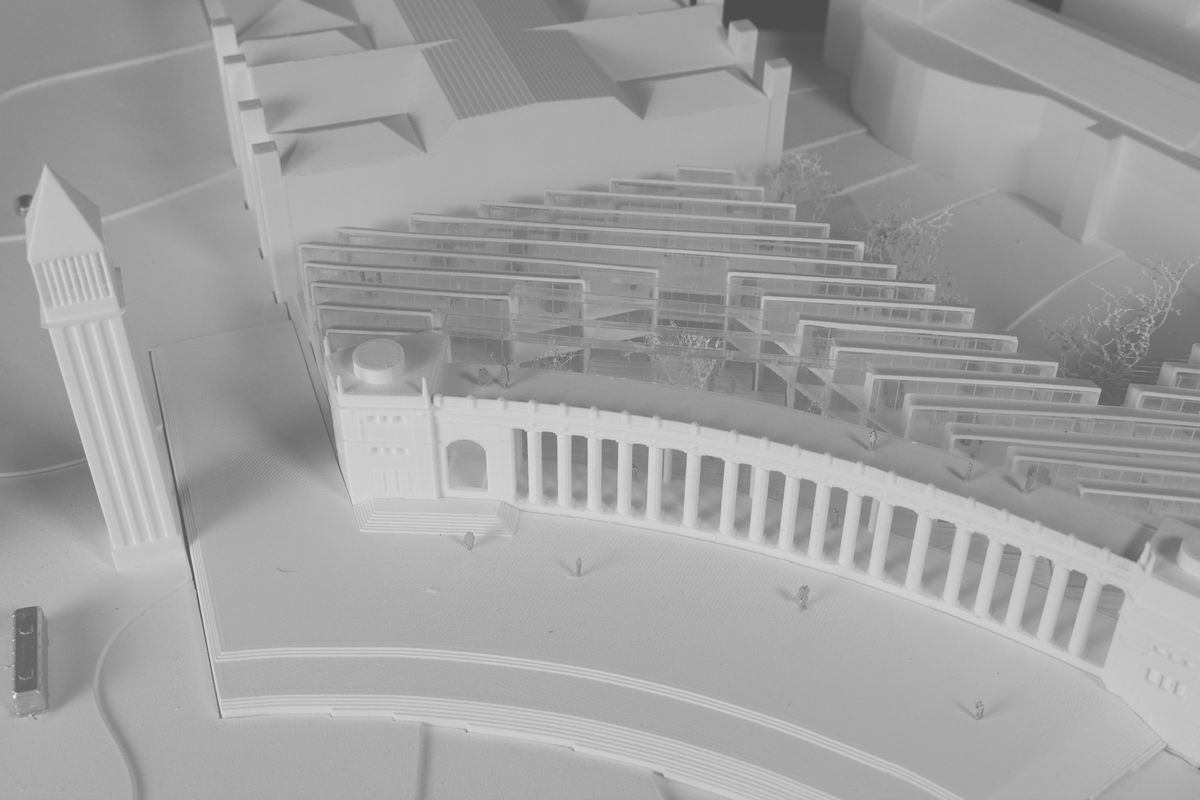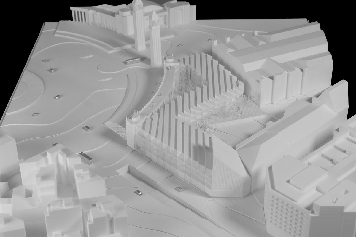 A PROJECT FOR BARCELONA — Designed to connect with its surroundings, the project transforms the site into an engaging public space. The building’s form carves out an open area between the colonnade and the structure, inviting pedestrian movement and interaction. Additionally, the proposal reconfigures the urban block structure of Gran Via, introducing a courtyard at its core.