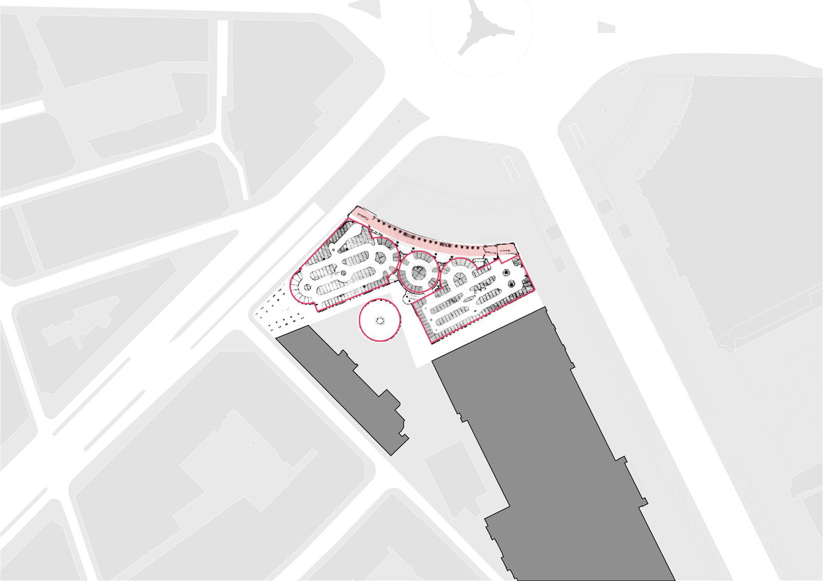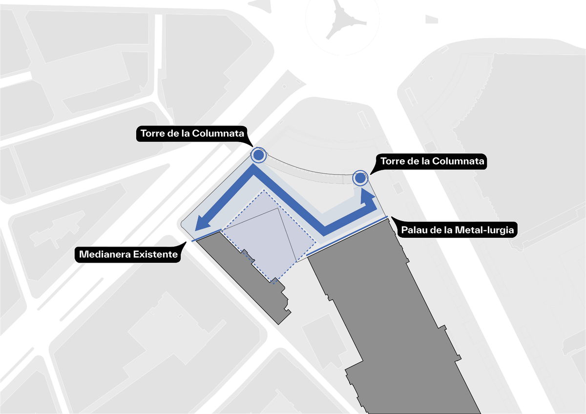 CONNECTING PAST AND PRESENT — The project establishes a dialogue between past and present, revitalising the site while preserving its historical elements. Anchored to the tower of Maria Cristina and aligned with the Palau de la Metal·lúrgia, the design extends towards the colonnade, reinforcing its presence within the urban fabric of Gran Via.
