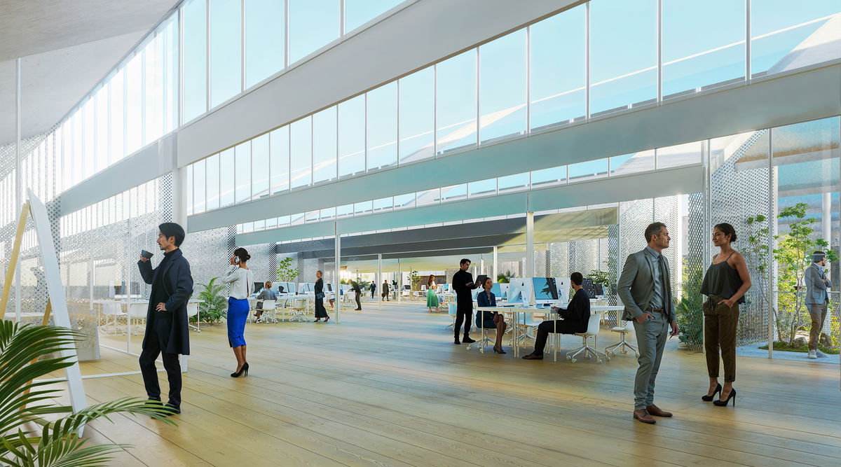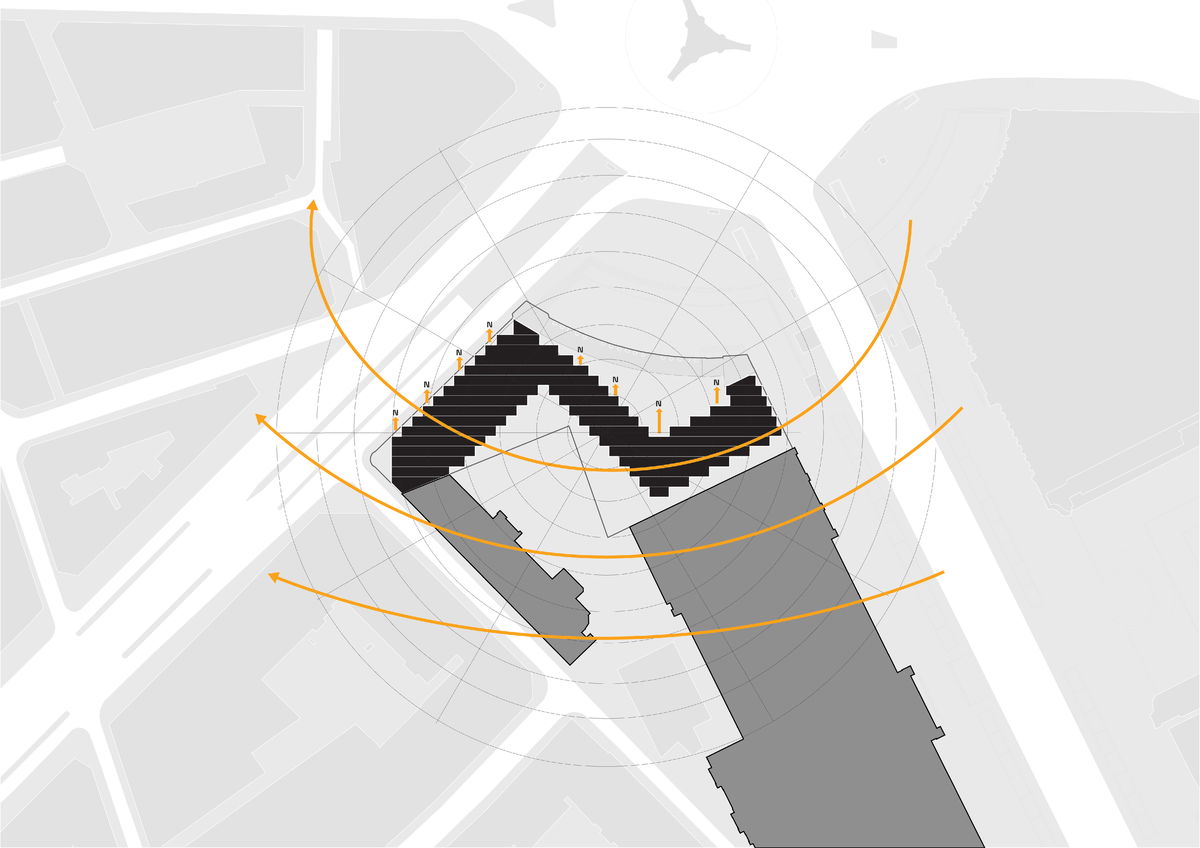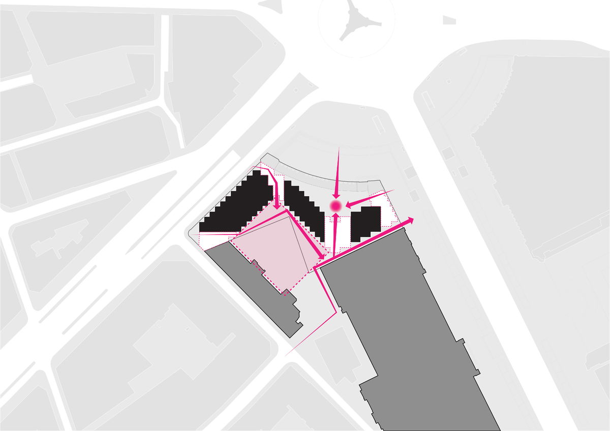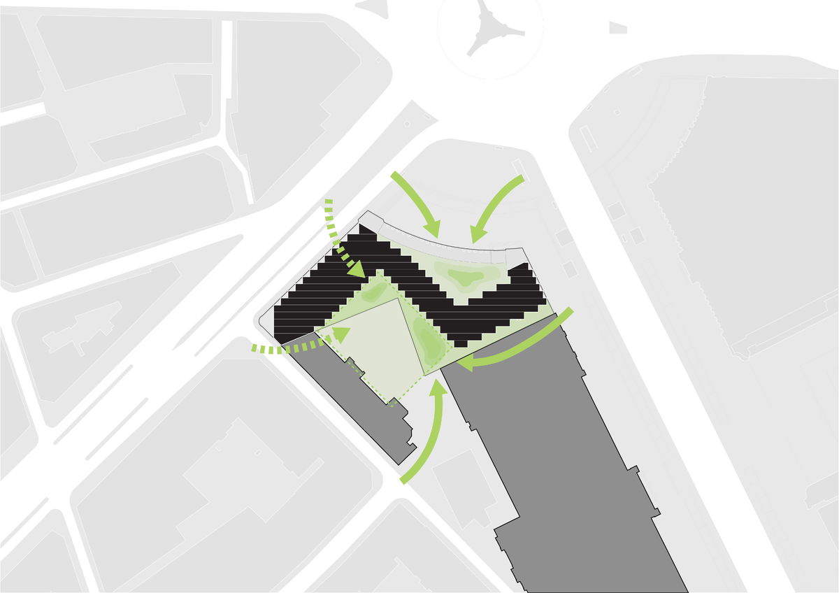 NEW URBAN CONNECTIVITY — At street level, the building opens at key points, improving circulation within the site and strengthening links with the surrounding city.