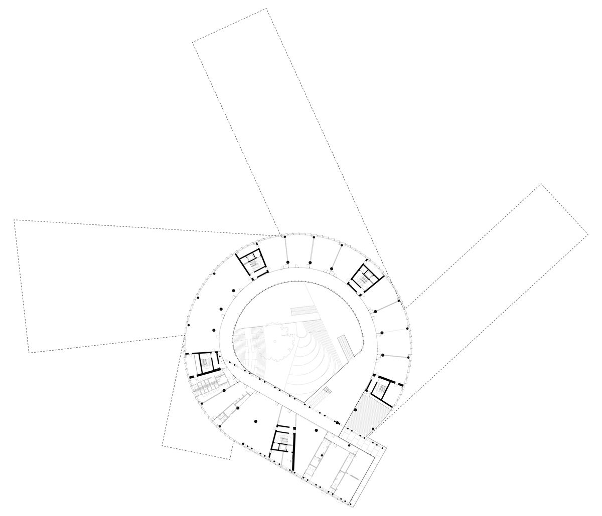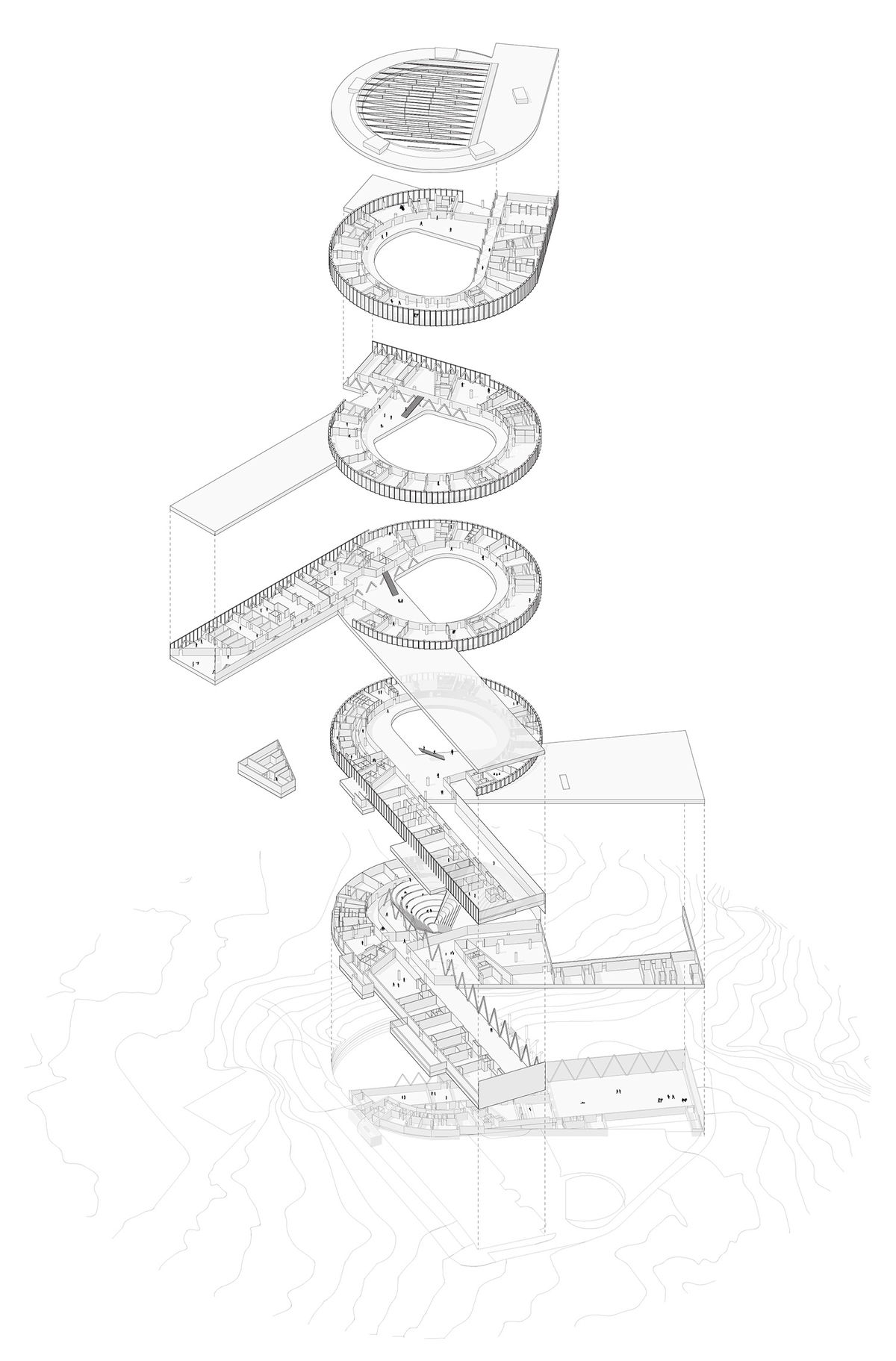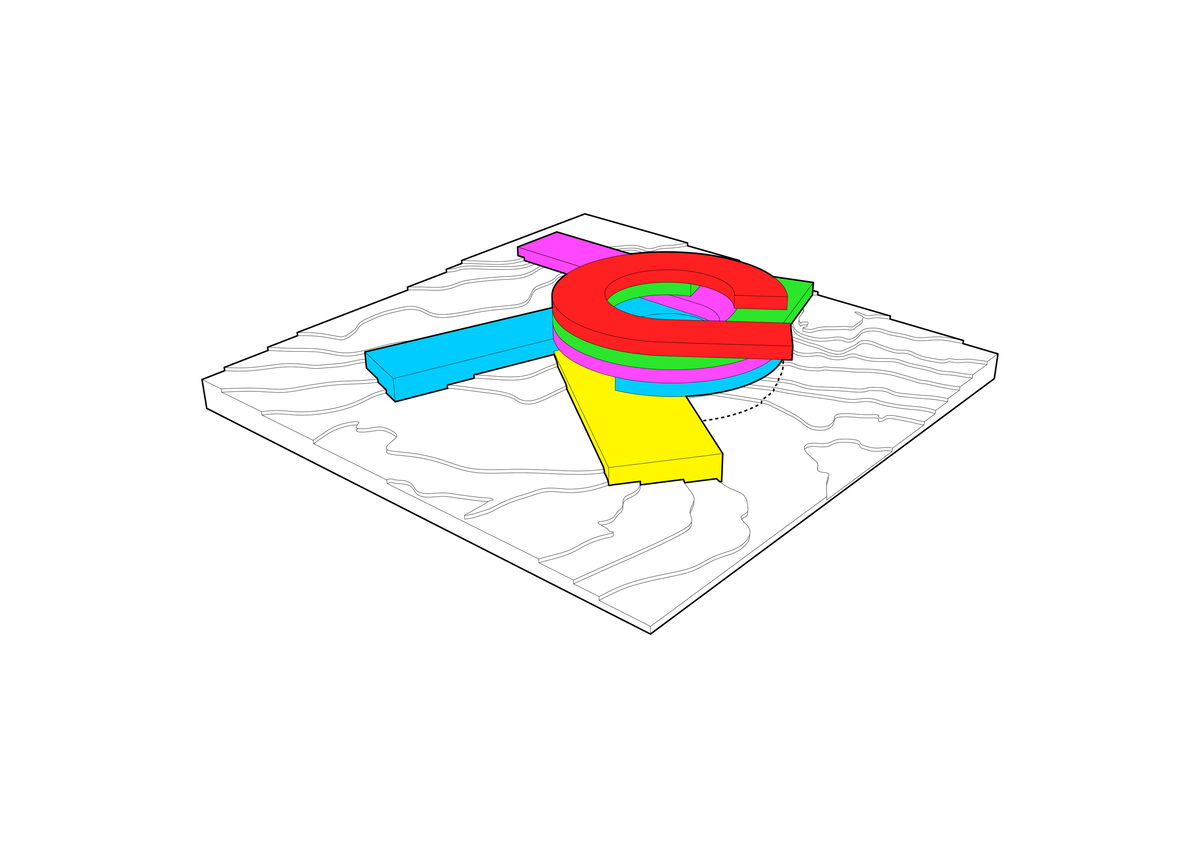 — A stack of five individual buildings wrap around a central public space: three buildings for each of the three specialties, one for food and faculty, and one for physical exercise and gatherings.