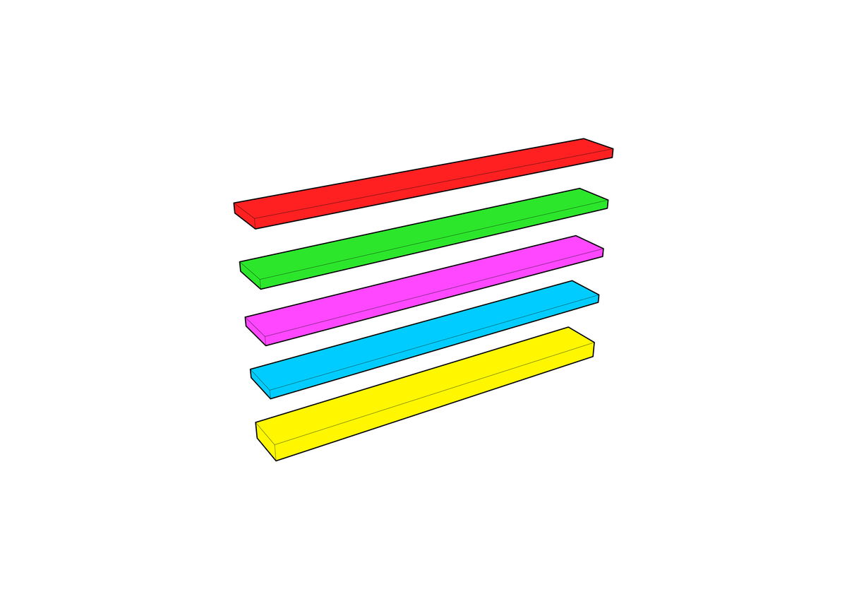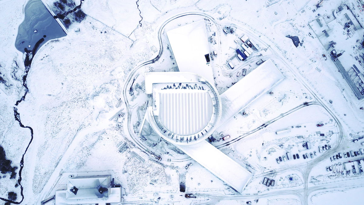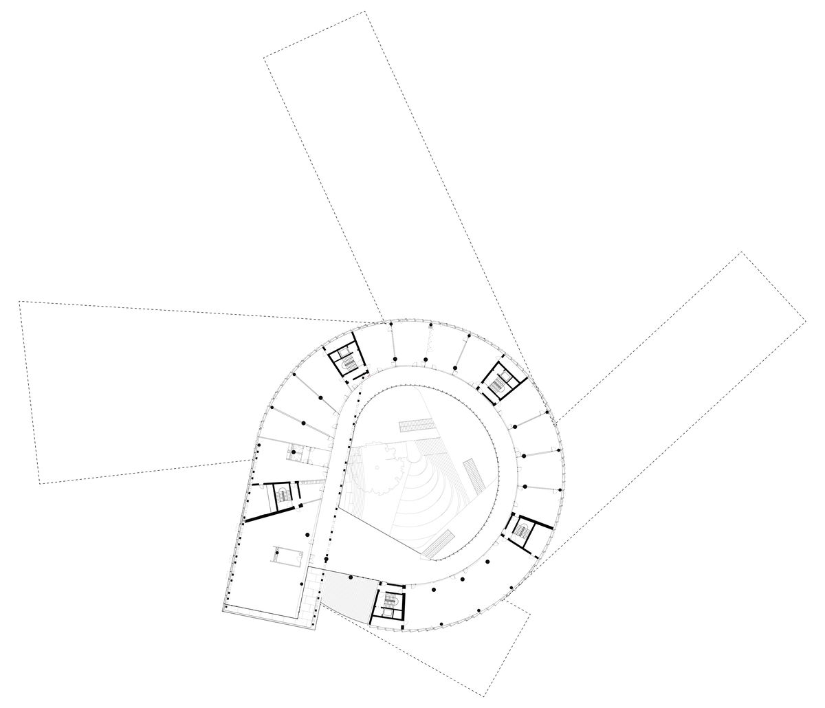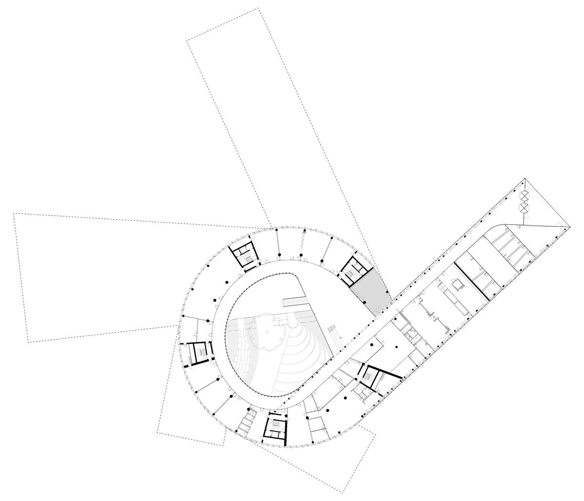 — A stack of five individual buildings wrap around a central public space: three buildings for each of the three specialties, one for food and faculty, and one for physical exercise and gatherings.