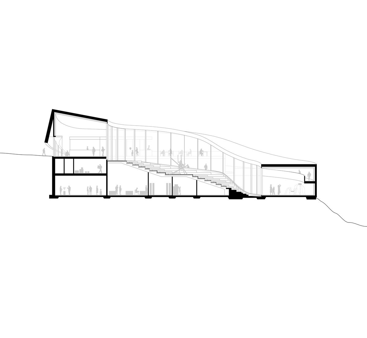 ADMINISTRATION & OUTREACH — Administration and outreach facilities are incorporated into a mezzanine level between the exhibition space and public foyer with a direct connection to more public functions at both ends: an auditorium to the west and a reading room to the east.