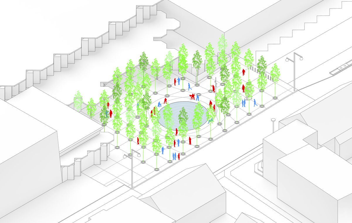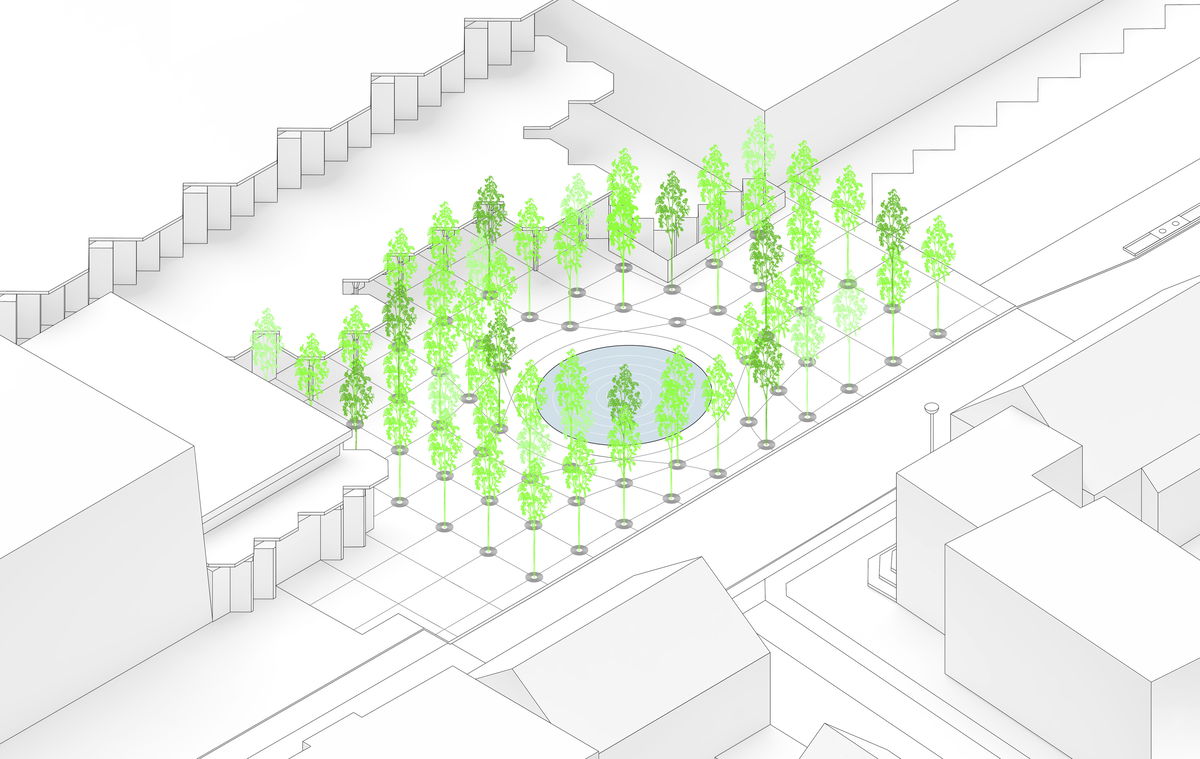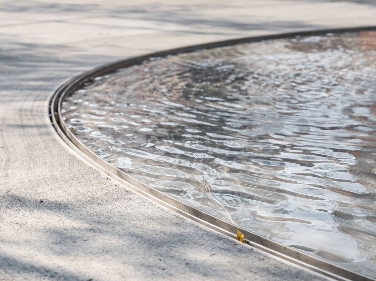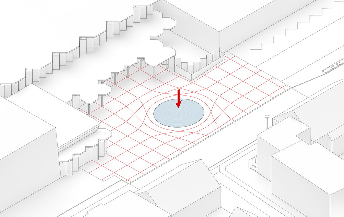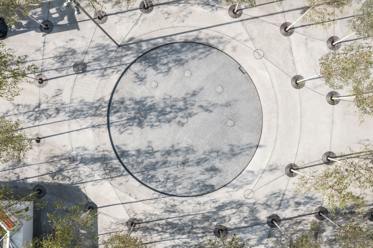 Sound Wave Pool — In the center of the modified grid system is a cymatic pool made of stainless steel, which becomes the new main attraction of the plaza.