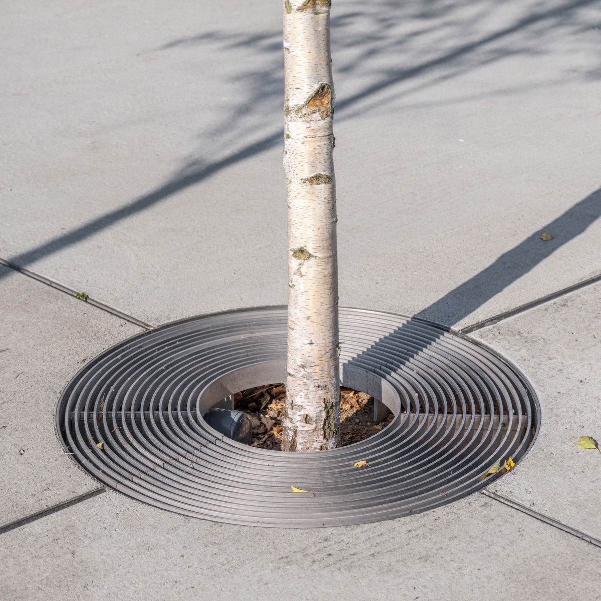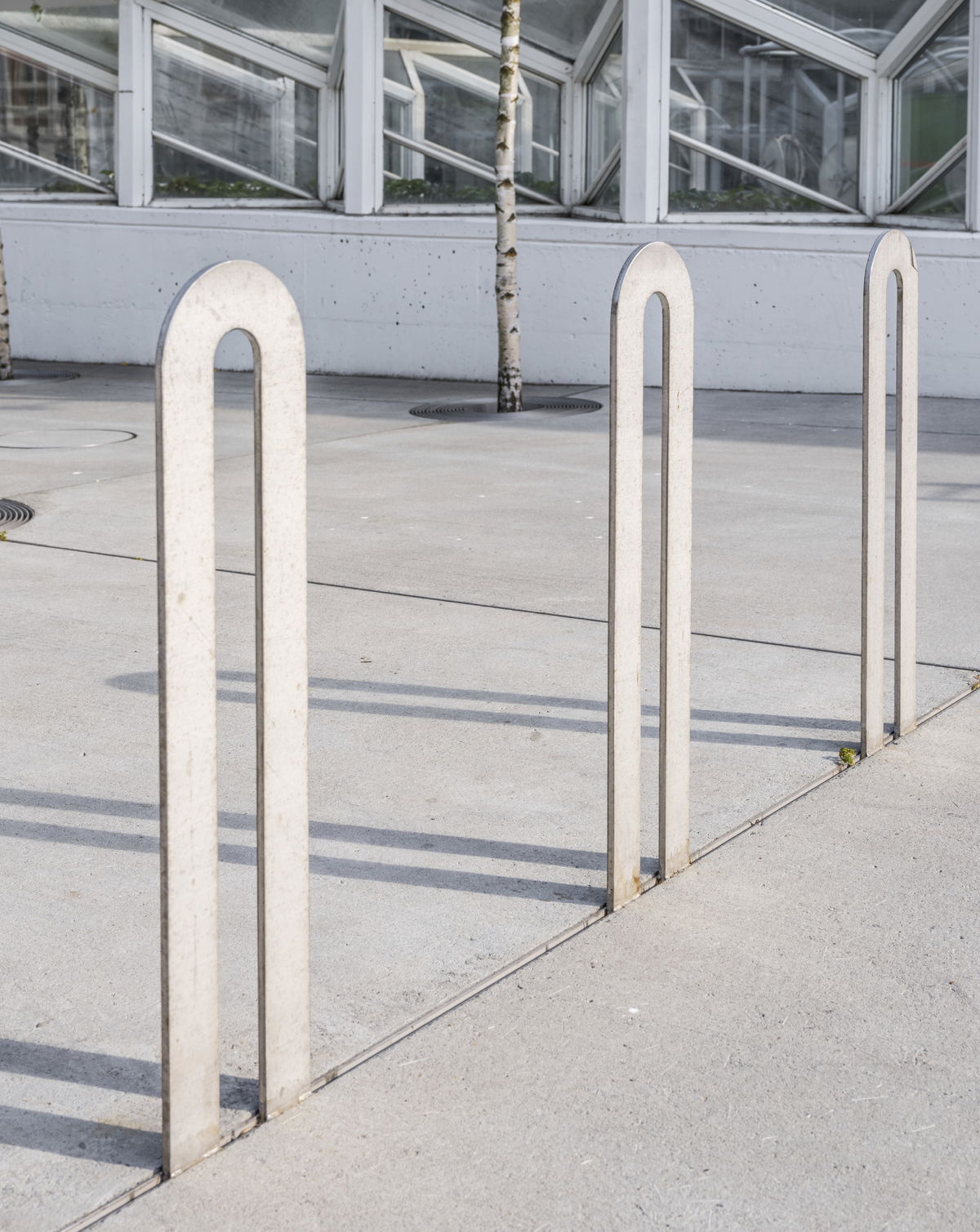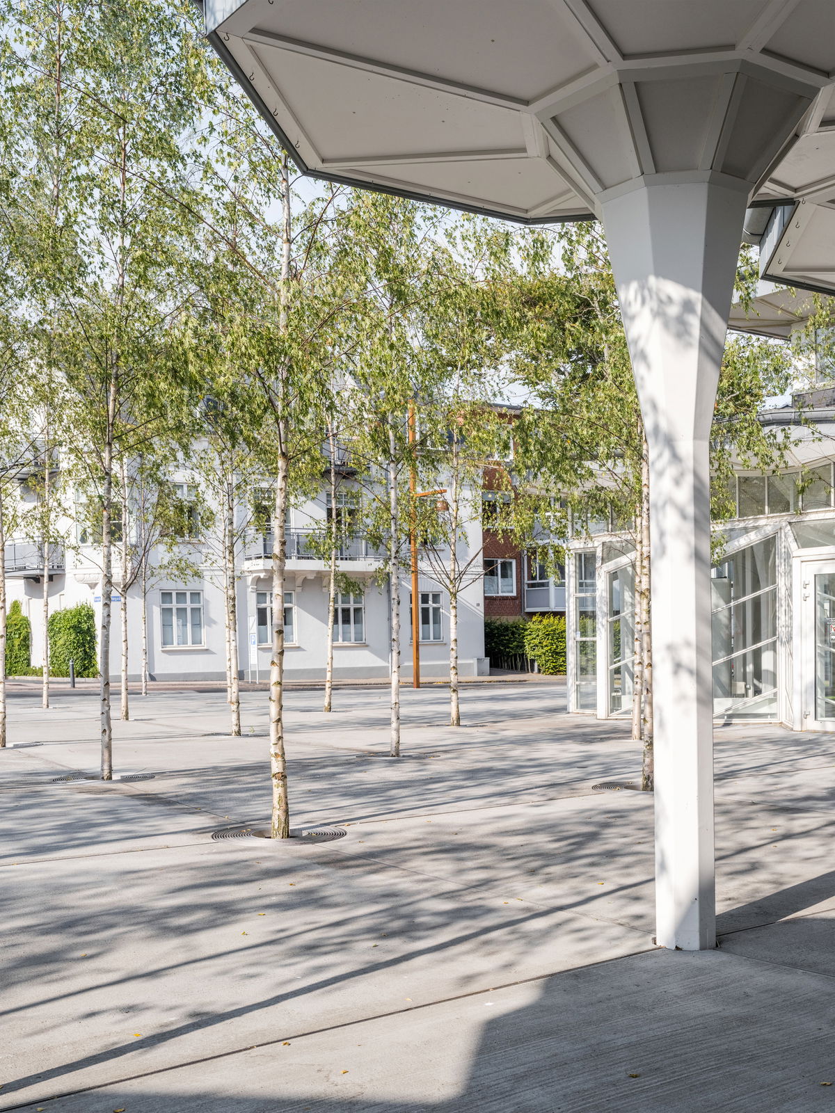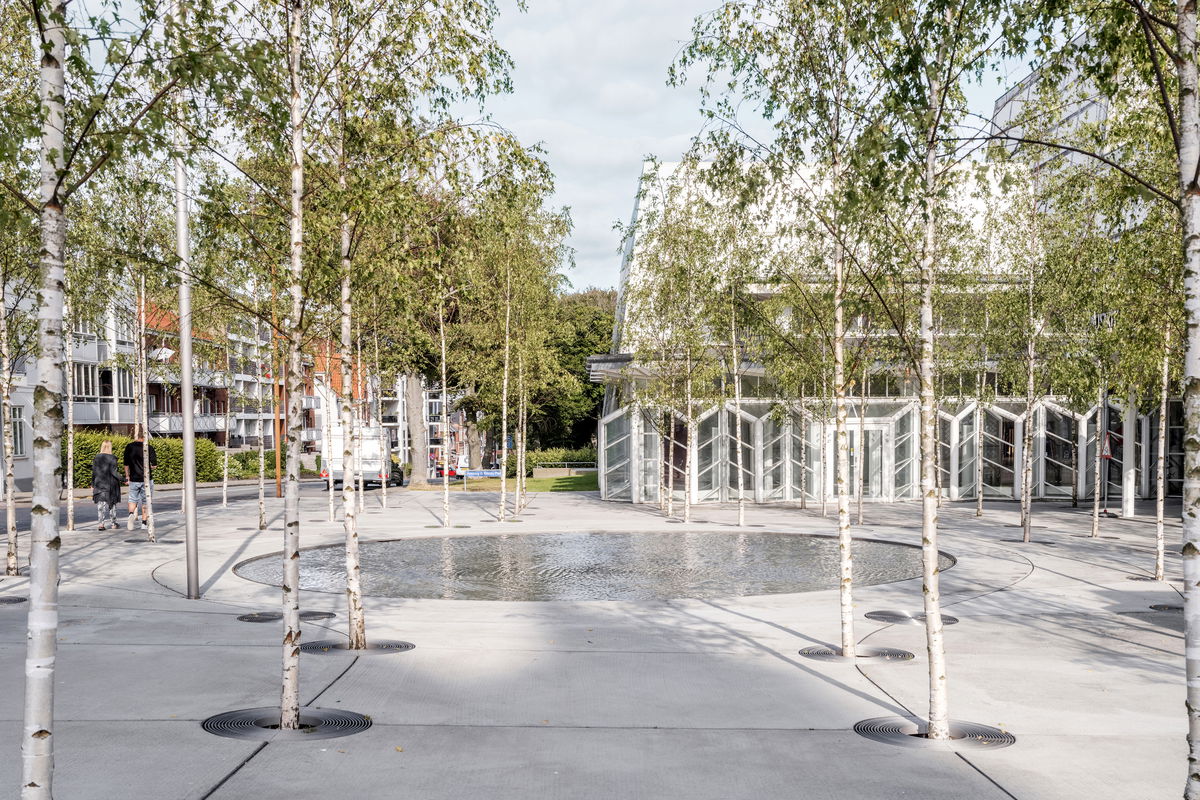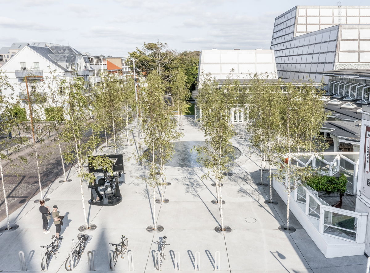 ”The new forecourt for Musikhuset Esbjerg and Esbjerg Kunstmuseum is composed of a number of architectural details designed specifically for the site. The curved steel lines, the circular gratings around the trees, the light posts, the bicycle racks, and the vibrating basin are all designed in 5 mm stainless steel, which stands in subtle contrast to the concrete's hand-brushed surface and the birch trees' white trunks and green crowns. Henning G. Kruses Plads represents a holistic urban 'work of art' on a smaller scale."Soren Martinussen - Associate & Project Leader, BIG