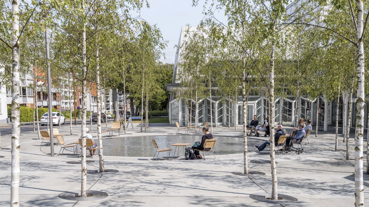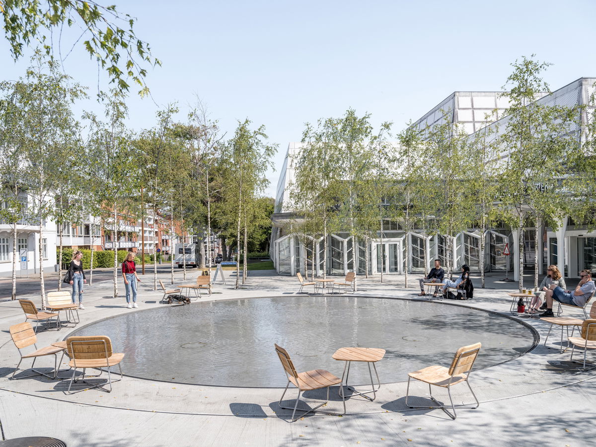 Henning G. Kruses Plads — The plaza provides an intimate public space with a 10 m circular basin, surrounded by birch trees. Music from inside Musikhuset Esbjerg creates vibrations and patterns in the water's surface.