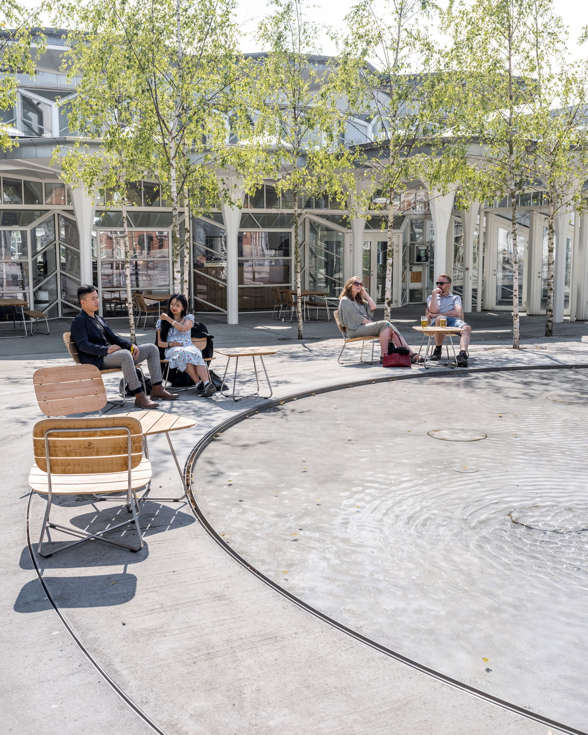Birch Trees — 55 pollen-free birch trees surround the pool, mimicking the white columns of the building and creating a new intimate spatial experience in the plaza.