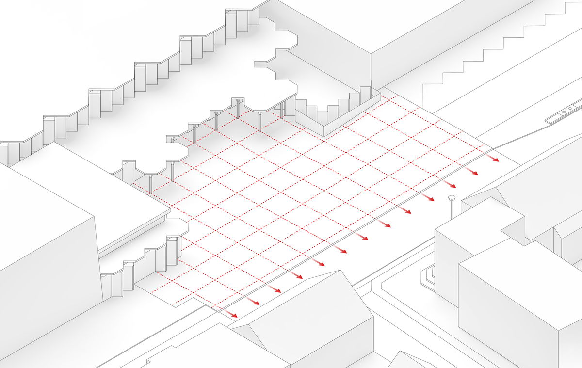 Grid Extension — The column structure inside Musikhuset Esbjerg is placed in a grid system. The grid system is extended to the plaza.