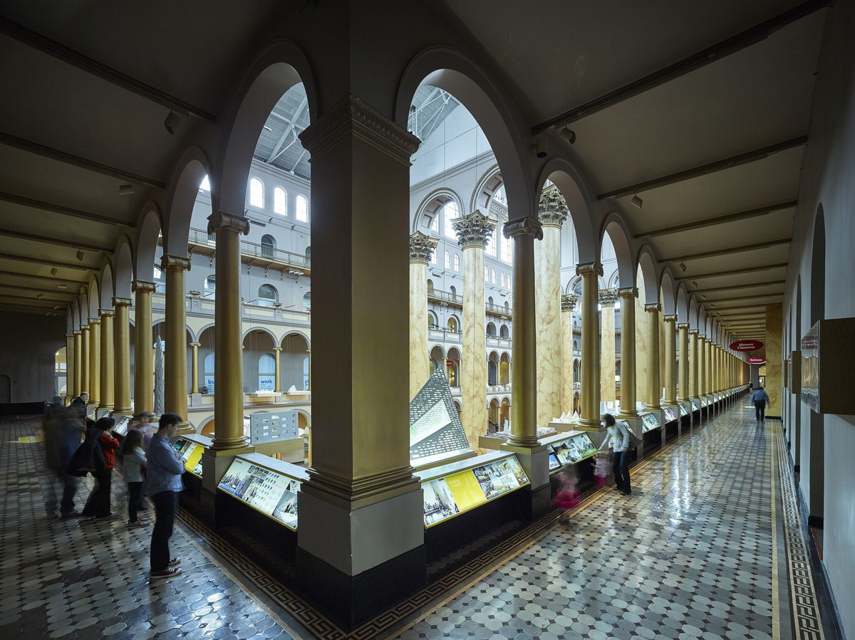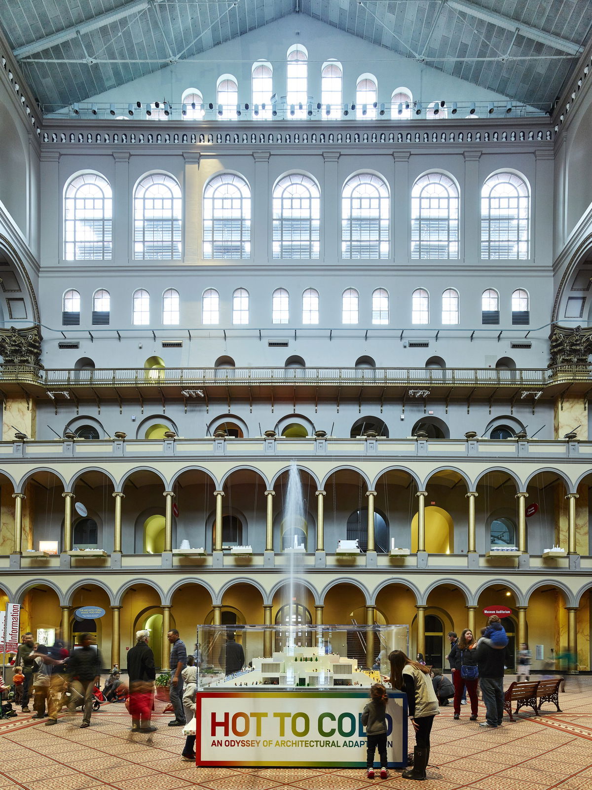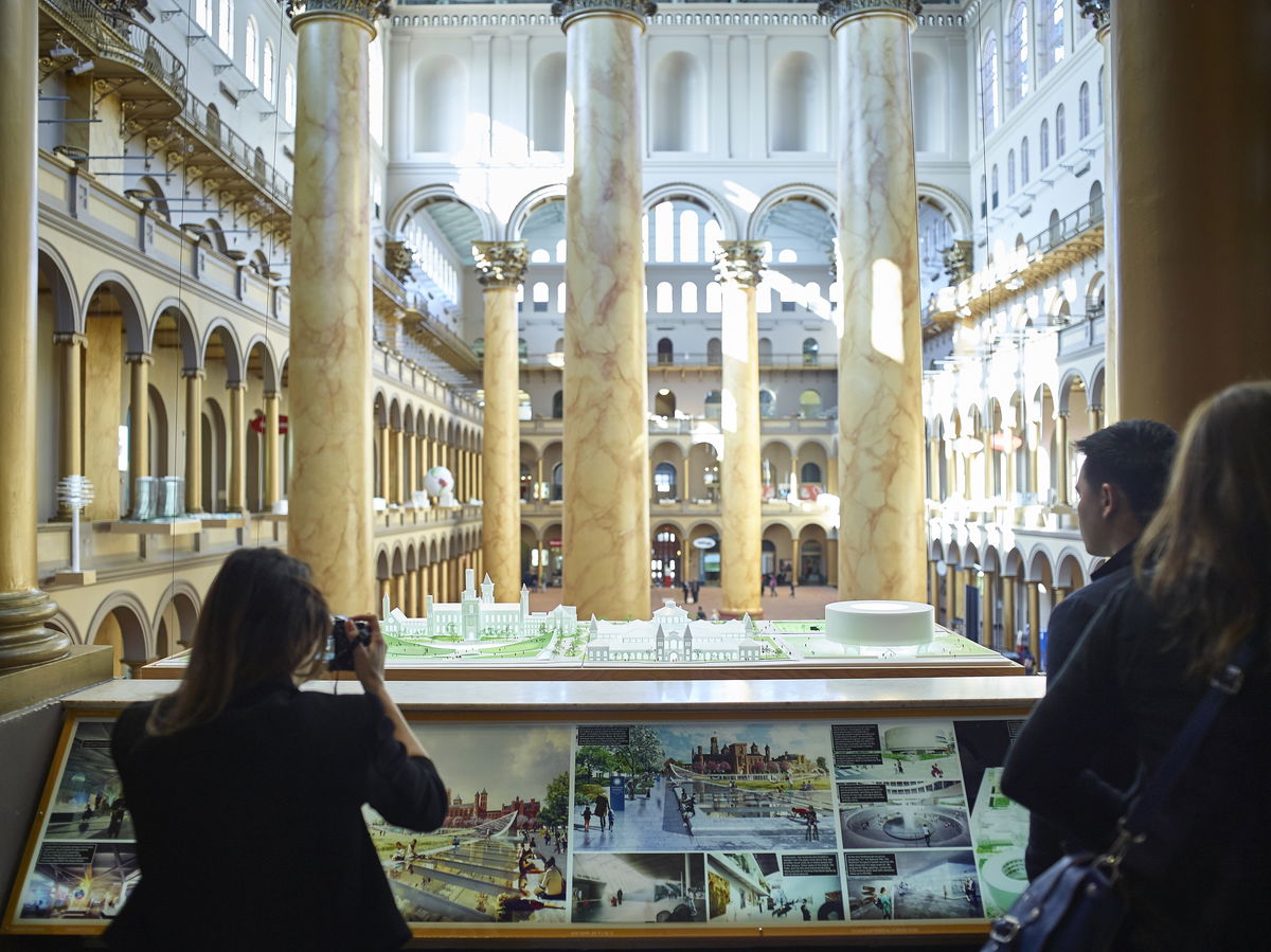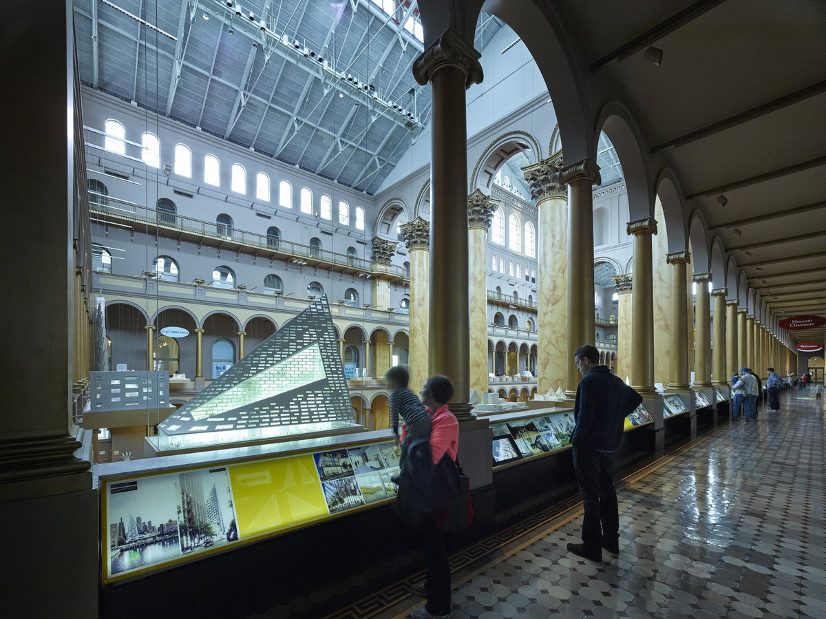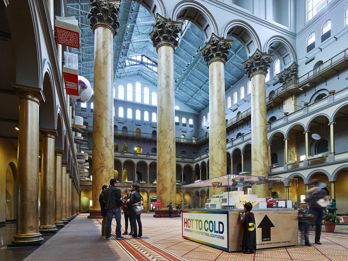 The Building Becomes the Design — The vast atrium of the National Building Museum framed by its double-story arcade is an urban room of epic proportions. Rather than cramming all the work into the three galleries, BIG turns the entire second-floor arcade into the exhibition design.