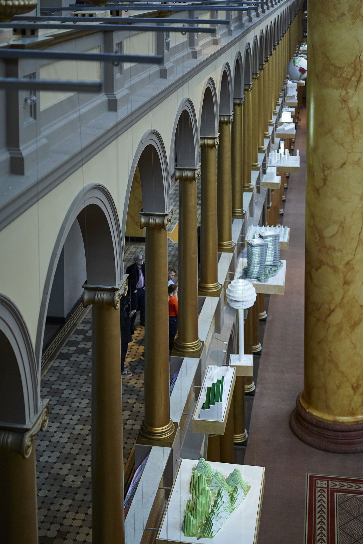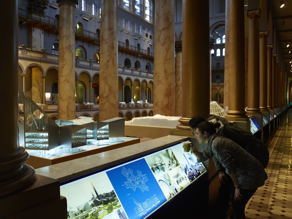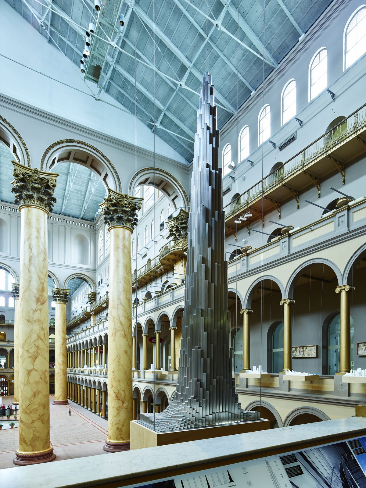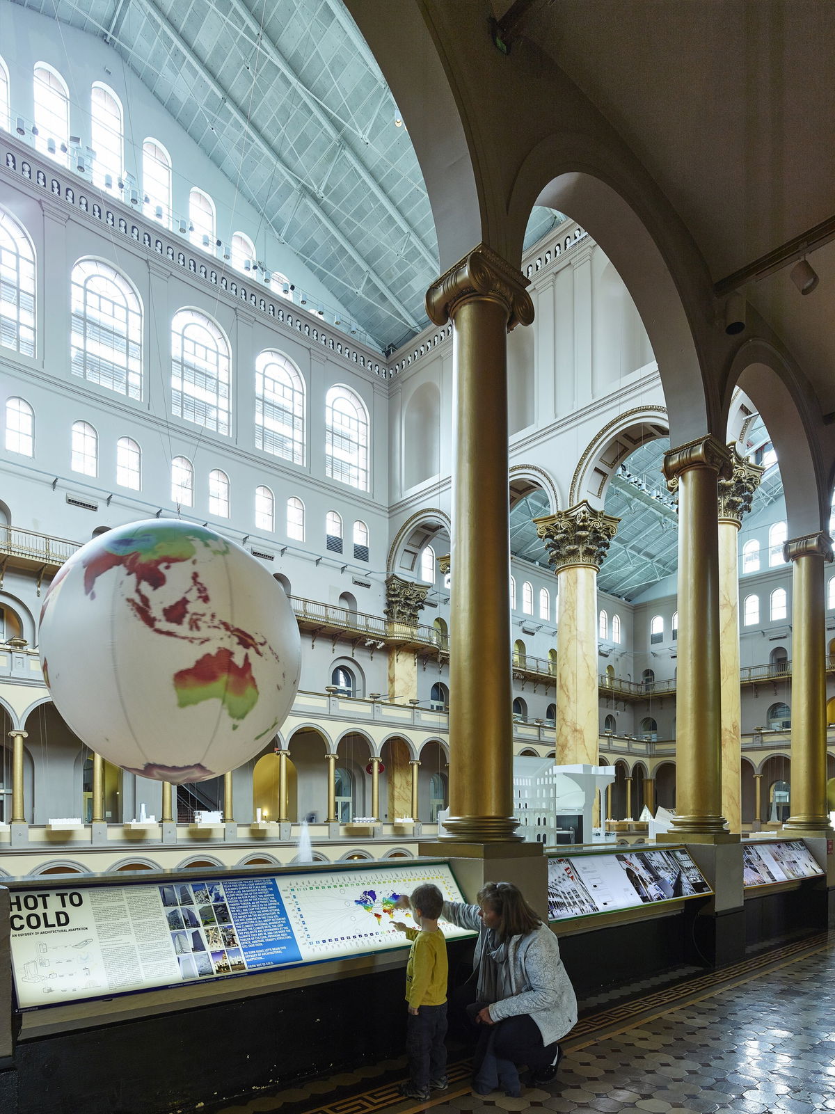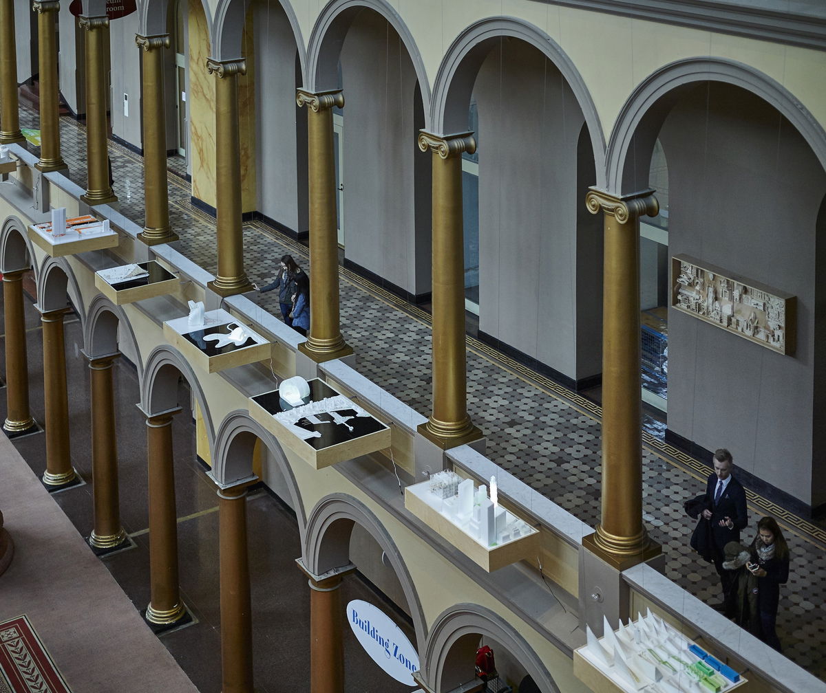 The Building Becomes the Design — The vast atrium of the National Building Museum framed by its double-story arcade is an urban room of epic proportions. Rather than cramming all the work into the three galleries, BIG turns the entire second-floor arcade into the exhibition design.