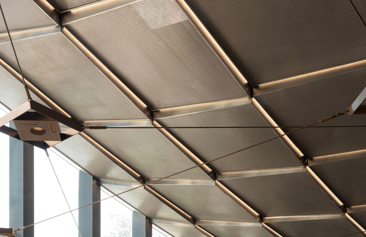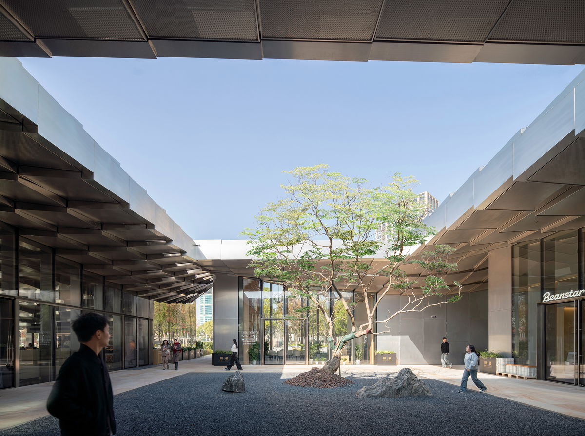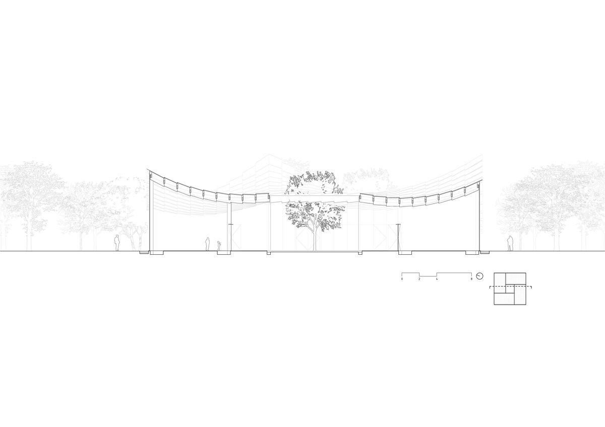 "Nestled under the grand camphor trees along the lake, our Jinji Pavilion provides a tranquil space for the community. It is envisioned as an extension of the surrounding canopy of foliage. A stylized roof of pixelated leaves gracefully drapes toward the ground, providing a protective canopy over the junction of paths and framing spectacular views of the lake. Perforated plates cast dappled shadows, imitating the pattern of leaves while providing optimal thermal performance, blending poetic beauty with functionality."Catherine Huang - Partner, BIG