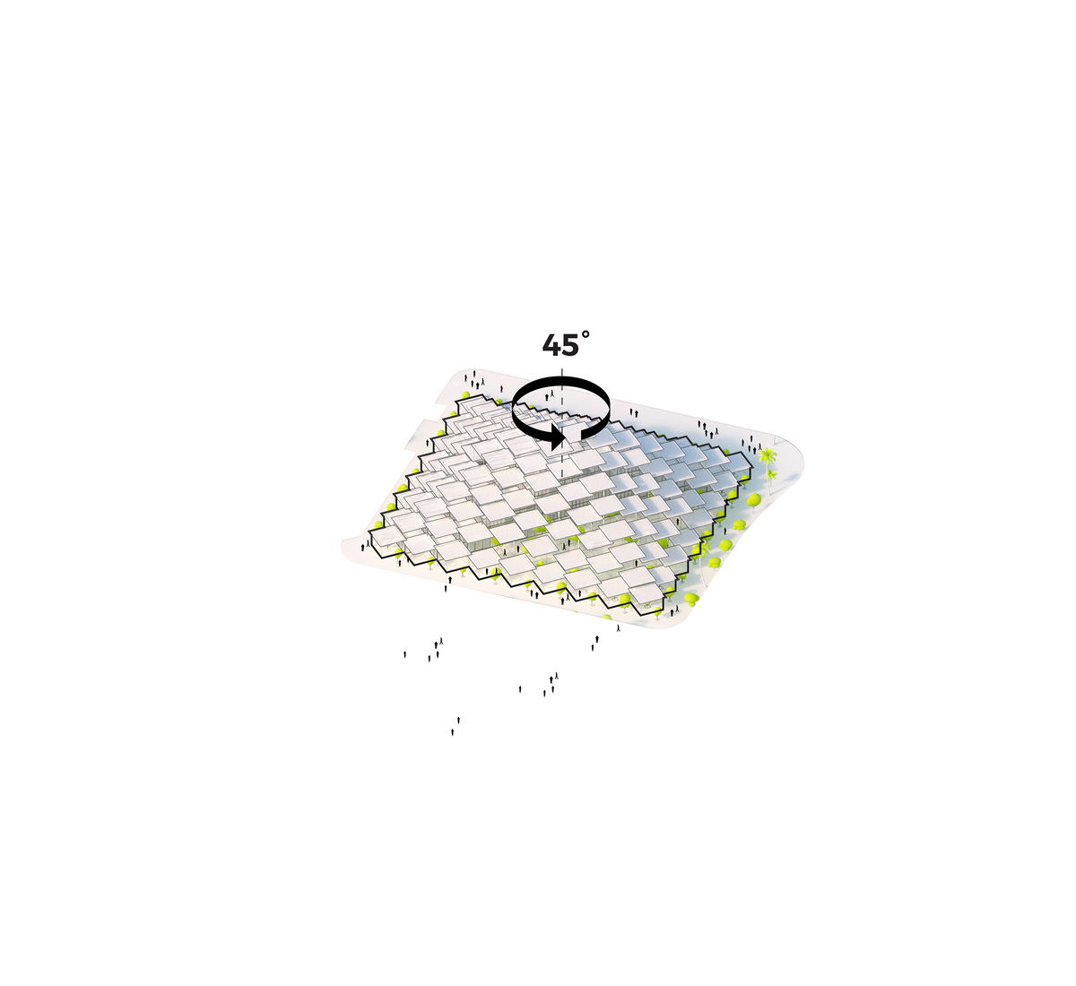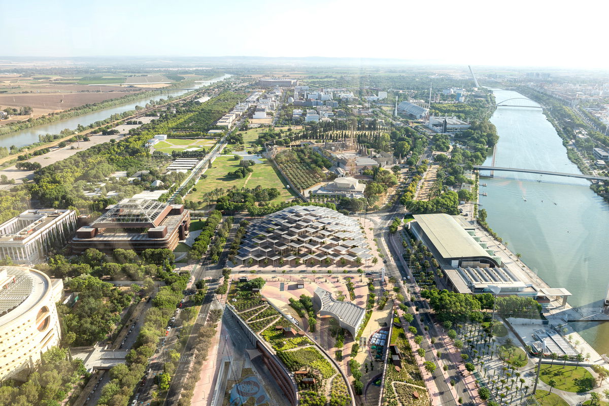 — BIG proposes the new Joint Research Centre to run diagonally across the orthogonal site which creates the opportunity to connect the JRC directly to the ‘Jardin Americano’ river-front promenade and the Torre Sevilla mall in a seamless continuous public space that is both plaza and promenade.