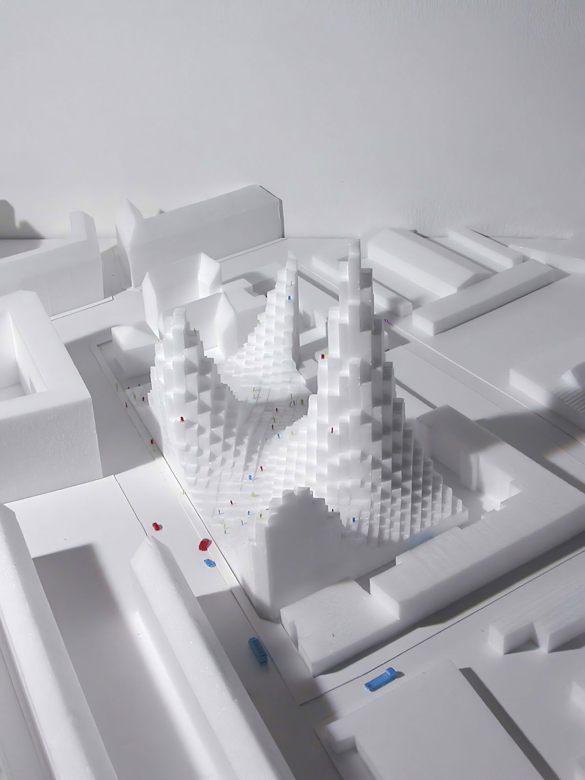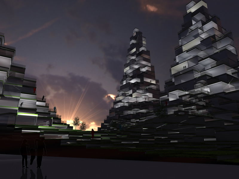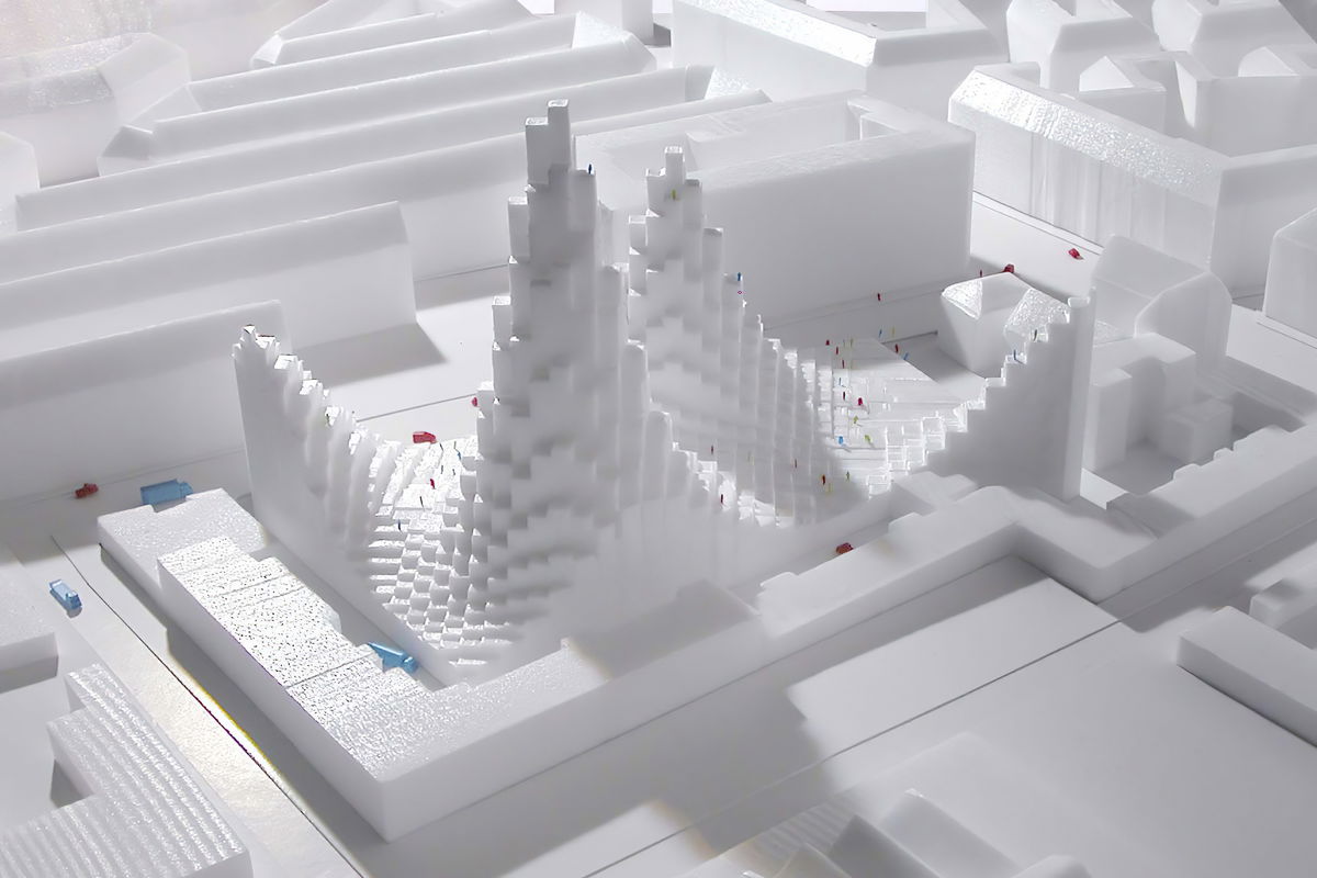TOPOGRAPHICAL MAP — The consideration to neighbors, lighting and views as well as demands of the spacial programme creates a topographical altitude map of the buildings. This way buildings are created that pull away from the street in regard to their heights and achieve various spacial depths for different programmes. The top side of the buildings become a pixel landscape of terraces and gardens.
