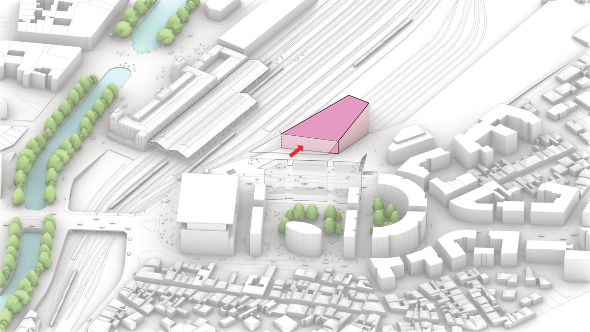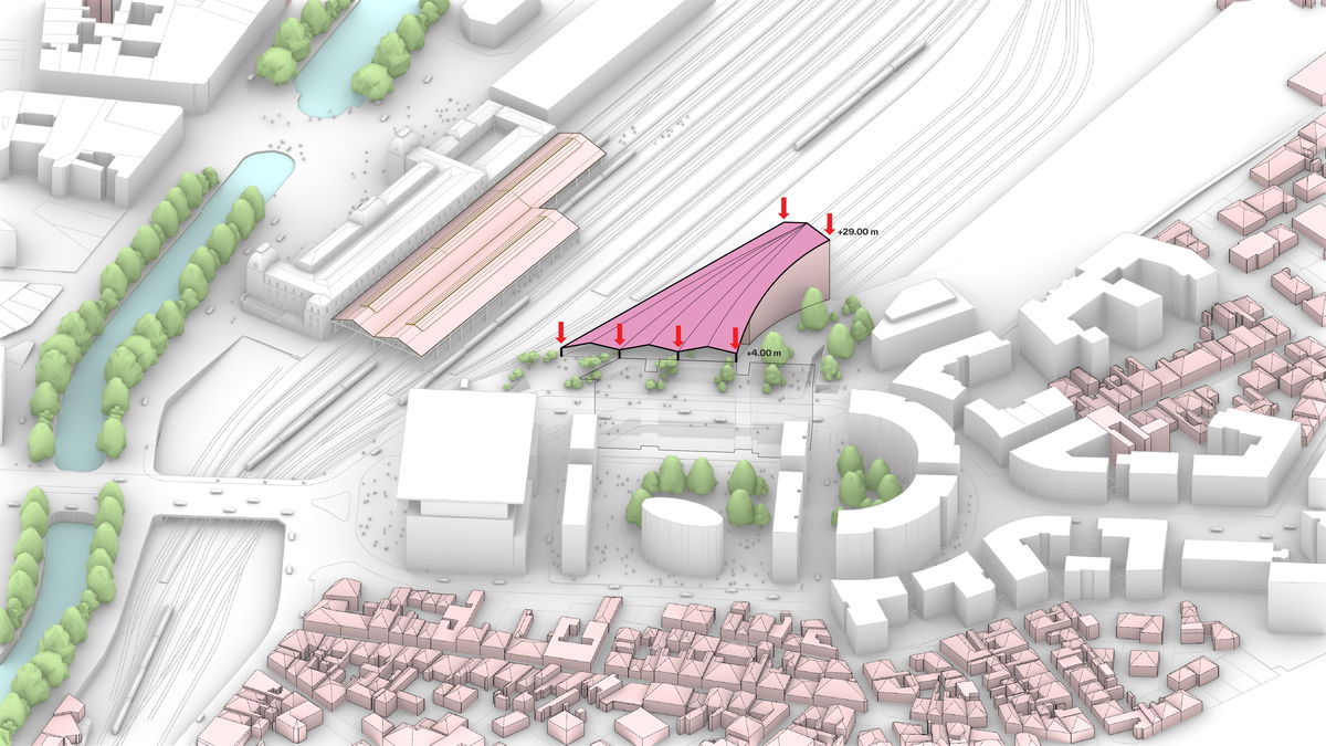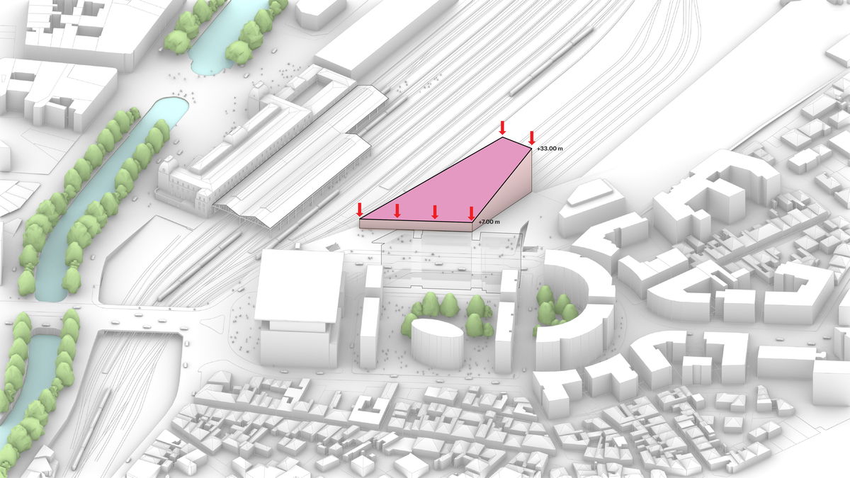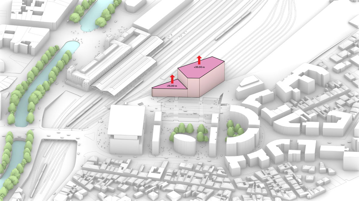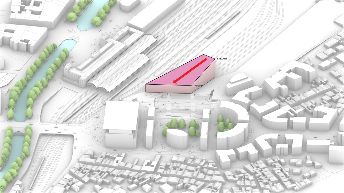 — The maximum envelope is divided in two, each with their respective height limit. The southern part facing the main entrance has a limit of 15 meters, while the northern part facing the tracks has a limit of 35 meters.