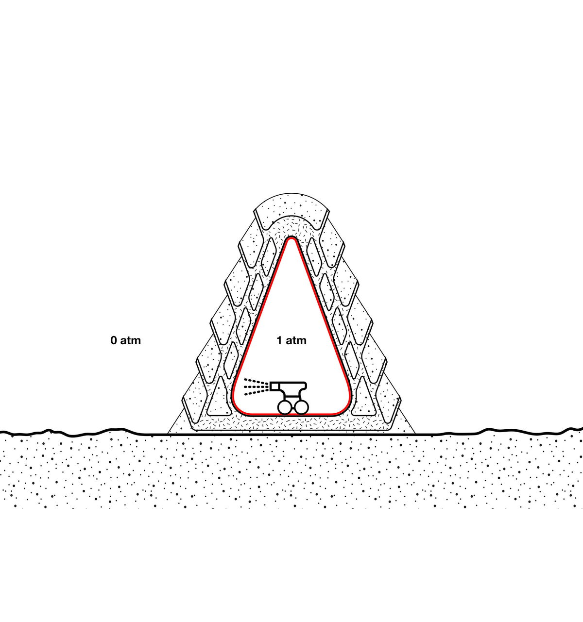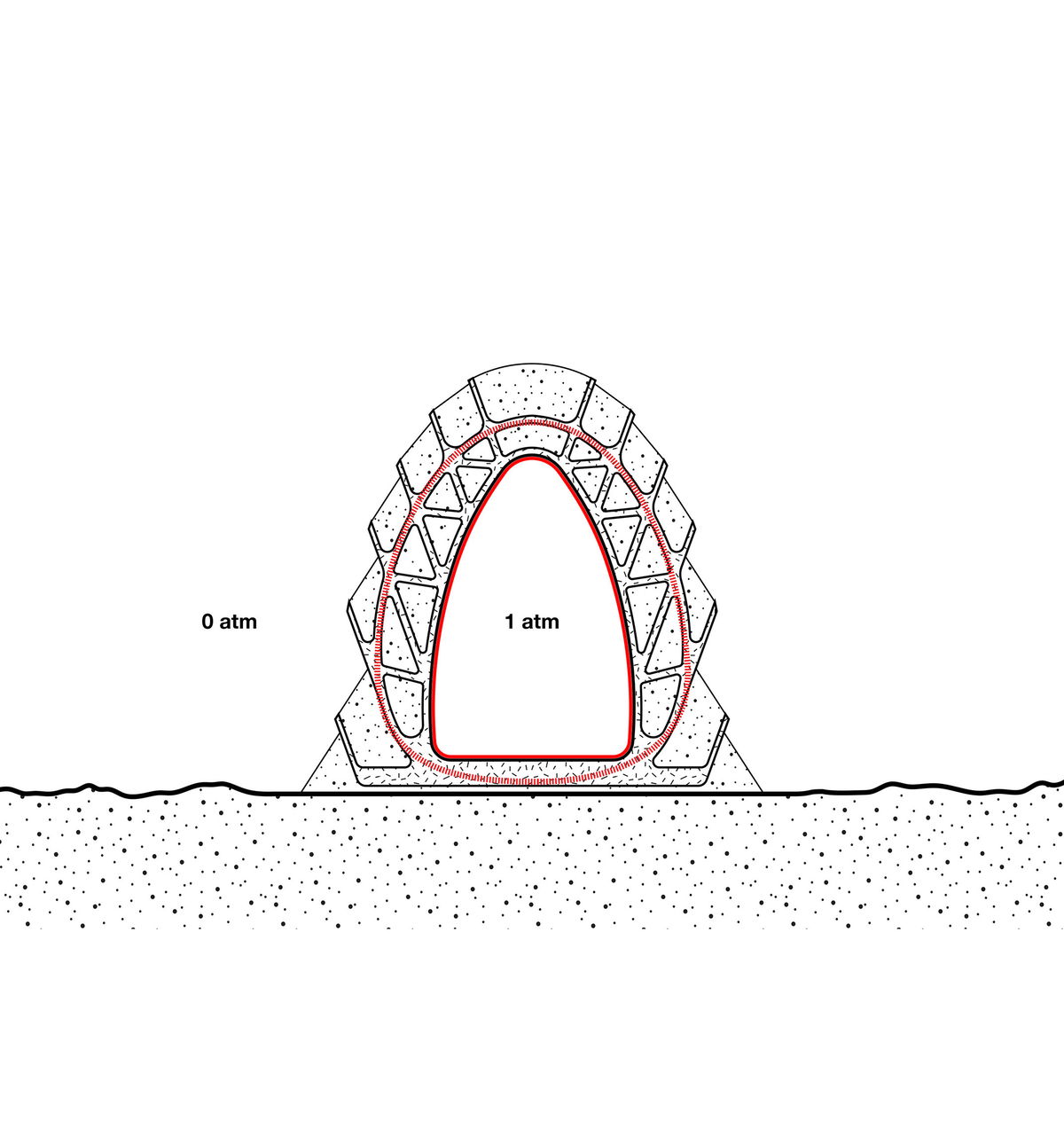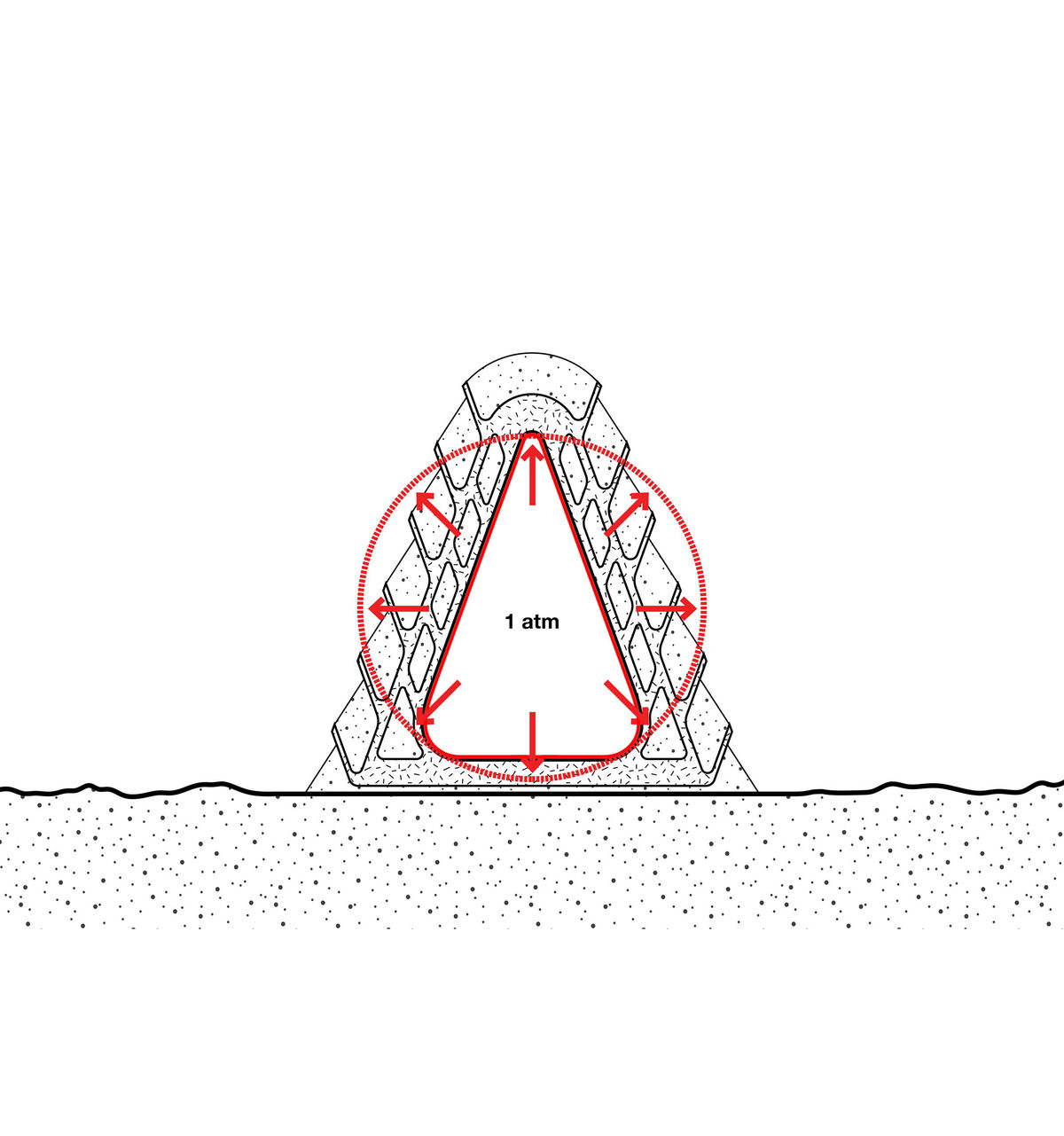 PRESSURE OPTIMIZATION — Exterior structural layer to adopt the rounded shape of a pressurized structure and negotiate between the ideal pressurized shape and the interior printable shape. Further geometry optimization to take place through digital force simulation and benchmark testing.