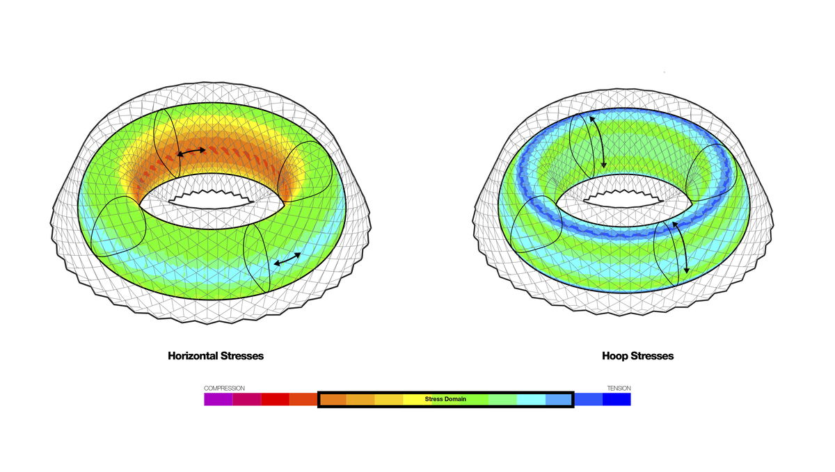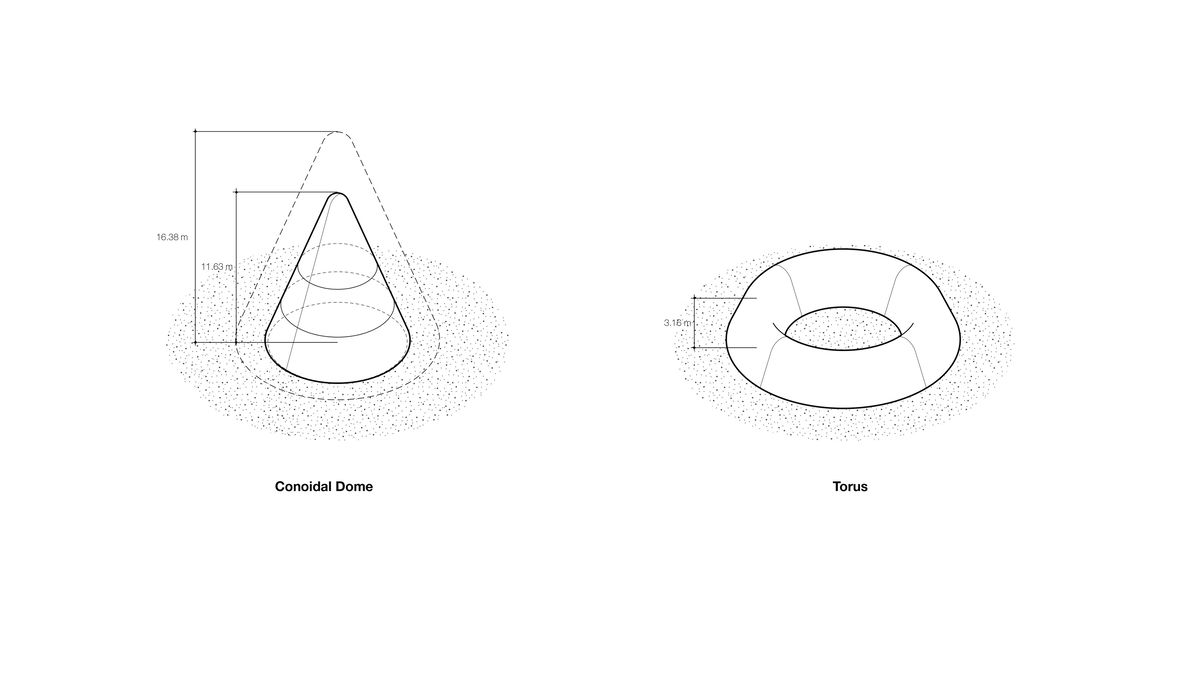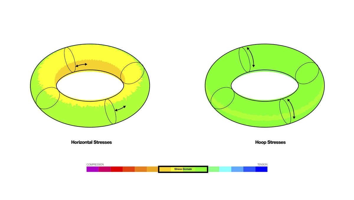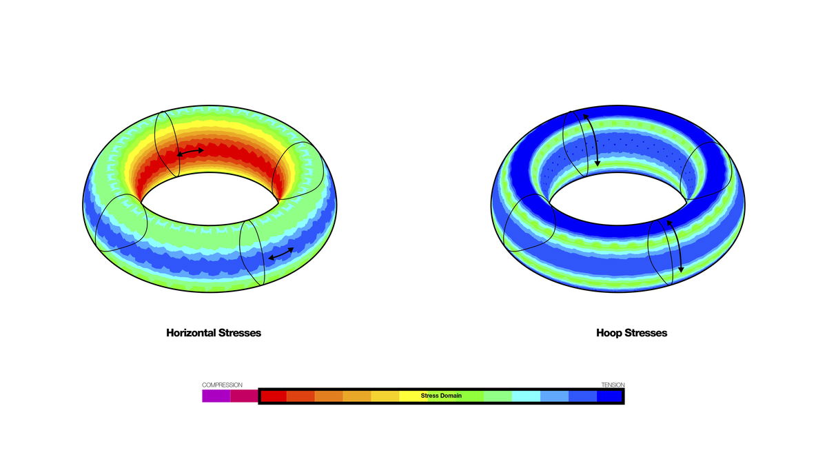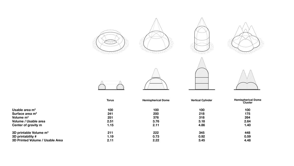 PRESSURE OPTIMIZATION — Exterior structural layer to adopt the rounded shape of a pressurized structure and negotiate between the ideal pressurized shape and the interior printable shape. Further geometry optimization to take place through digital force simulation and benchmark testing.