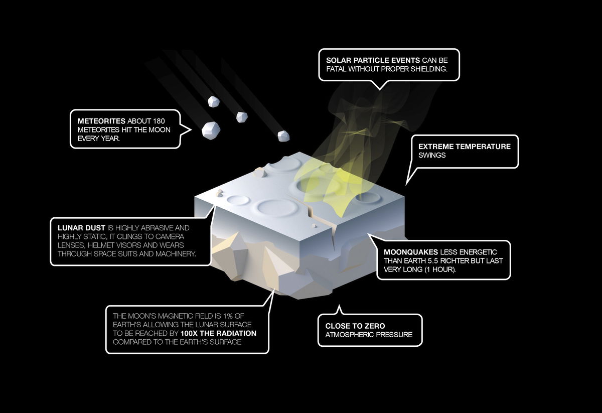 THERMAL SHIELD — On the lunar surface, temperatures can vary widely from a day temperature of 123 C, to a night time temperature of -247 C. 0.5 m to 1 m of regolith can mitigate temperature variation and settle it around -27 C.