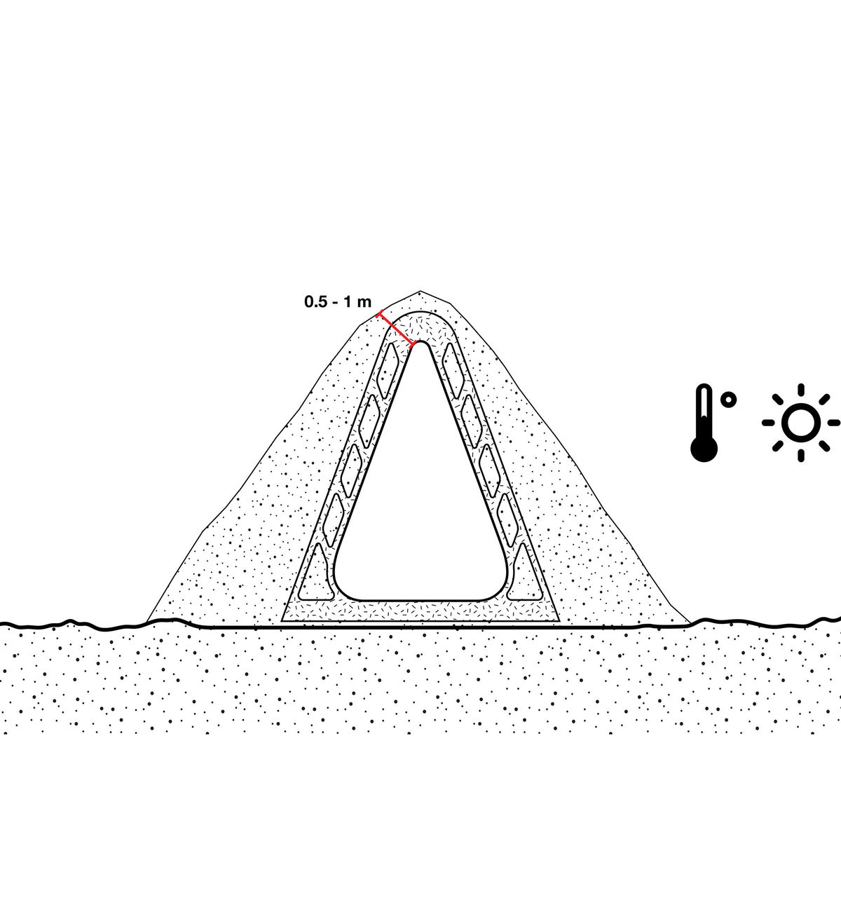 RADIATION SHIELD — Loose regolith on the exterior of the wall assembly will reduce the overall need for sintering. To block 100% of cosmic rays, it would require a 500 centimeter thickness of regolith.
