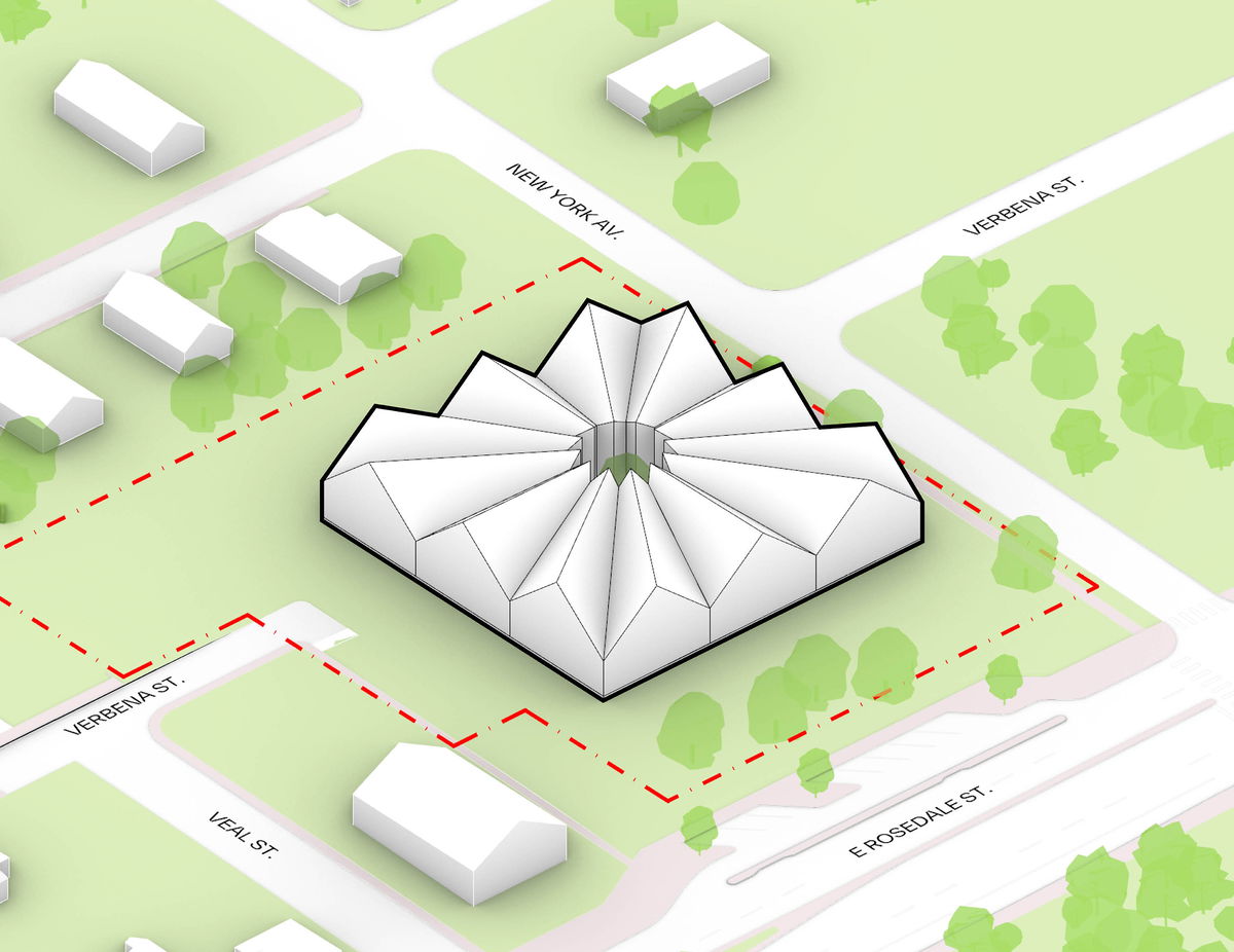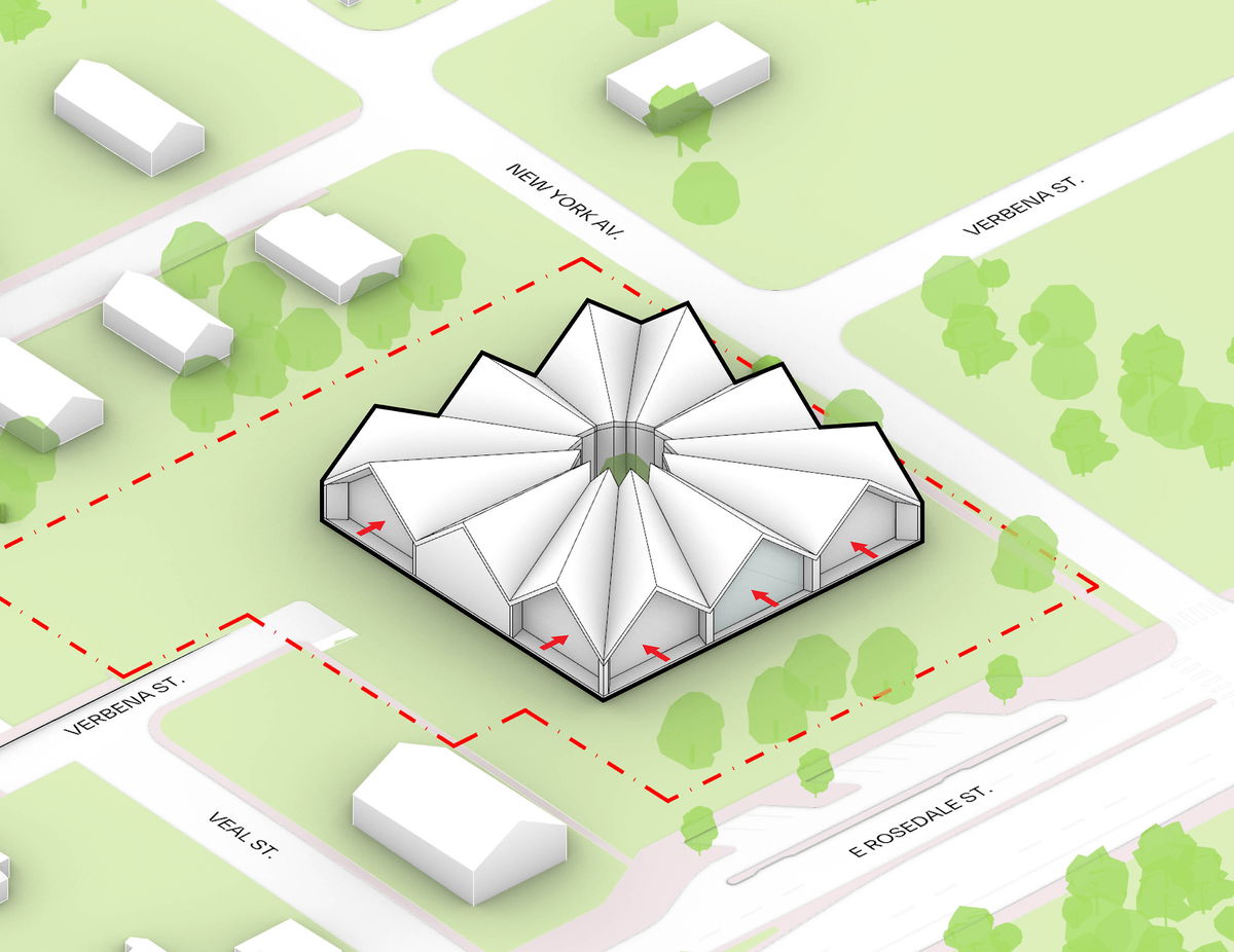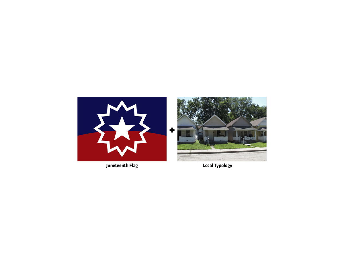 From Symbol to Form — The narrow residential typology is commonly found in African American communities throughout the southern United States. Their exterior characteristics include a gabled roof and a front porch. The museum’s architectural form combines this local typology with the Nova found on the Juneteenth Flag.