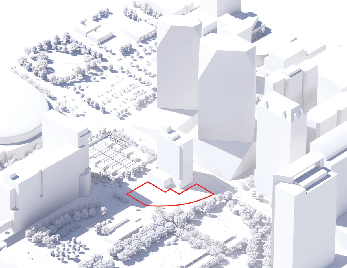 COMPACT SITE FOOTPRINT — The site is a compact, irregular shape with a long edge along Discovery Green. This is unique for Downtown Houston, which is full of large city block footprints for office towers.