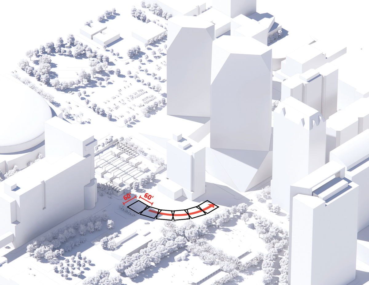 IDEAL PLANNING MODULE ARRAYED — A 60' x 60' footprint projects onto the site, an ideal dimension for perimeter office layouts and open floor plan opportunities. The module is arrayed along the site, taking advantage of the long park edge. The site constraints provide a unique opportunity to create a side core building, allowing for views to the park.
