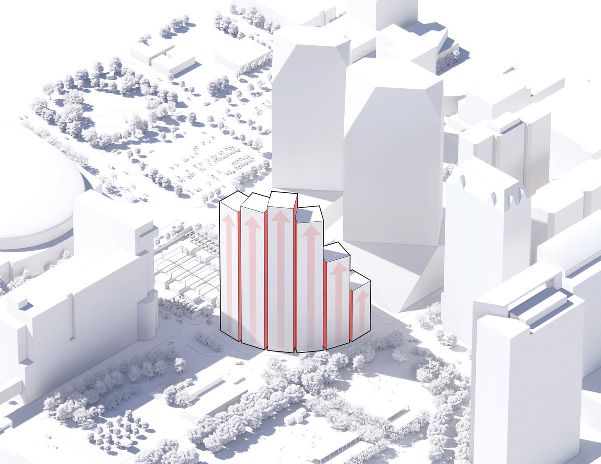 UNIQUE TOWER FORM — When extruded, the modules create a unique building form, unified while preserving the identity of the 6 individual towers. The breaks in the facade between towers expand the natural light in the building and add corner office opportunities.