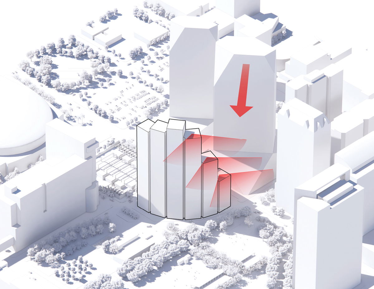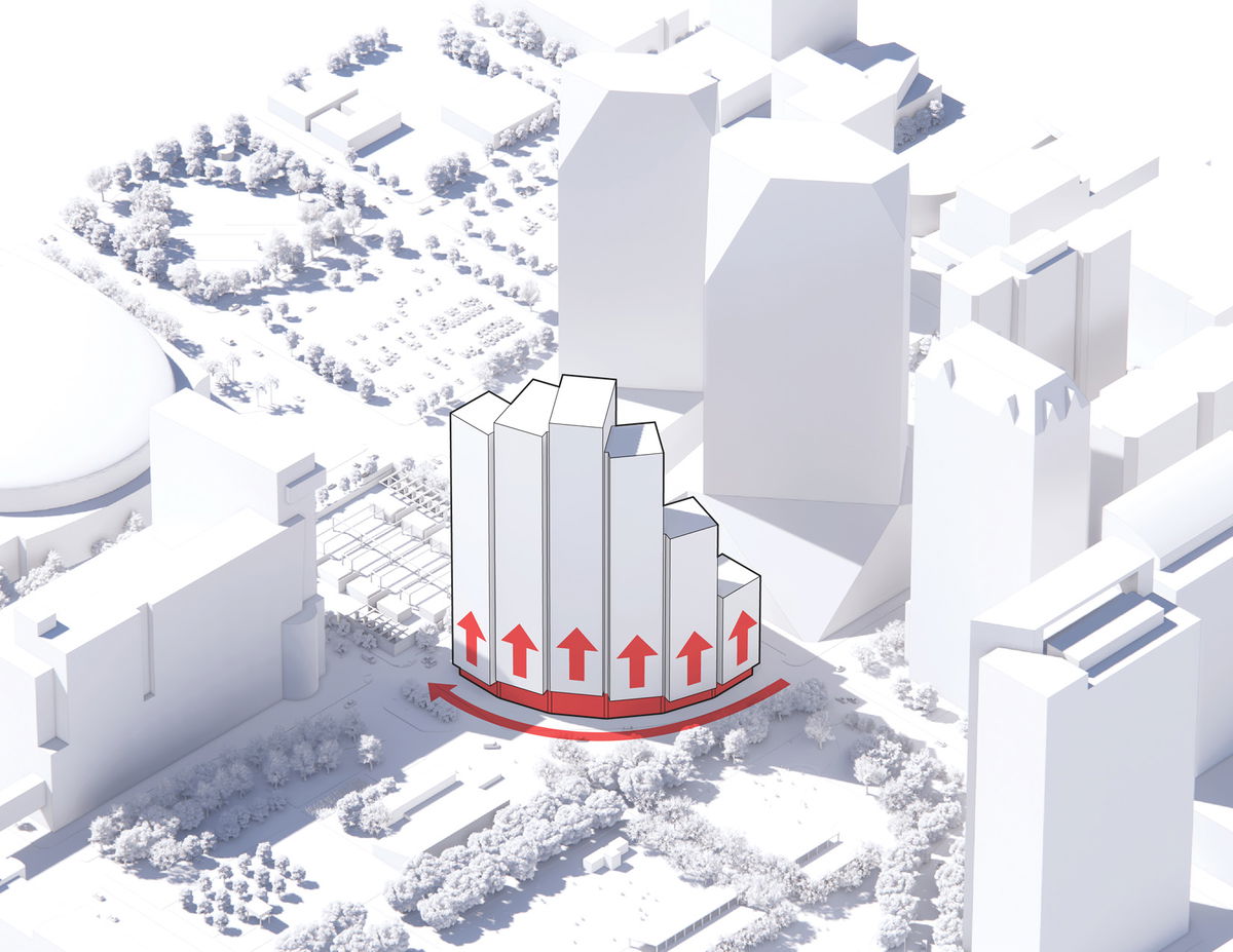 "On a site with a complex footprint and an existing hotel, we have designed six connected and pivoting towers to complete the framing of Houston’s Discovery Green. At ground level, the towers lift to unite the building with the park, while smaller retail volumes below offer a human-scale experience. The stepped tower volumes create three large terraces with views of downtown, adding a striking silhouette to the Houston skyline."Martin Voelkle - Partner, BIG NYC