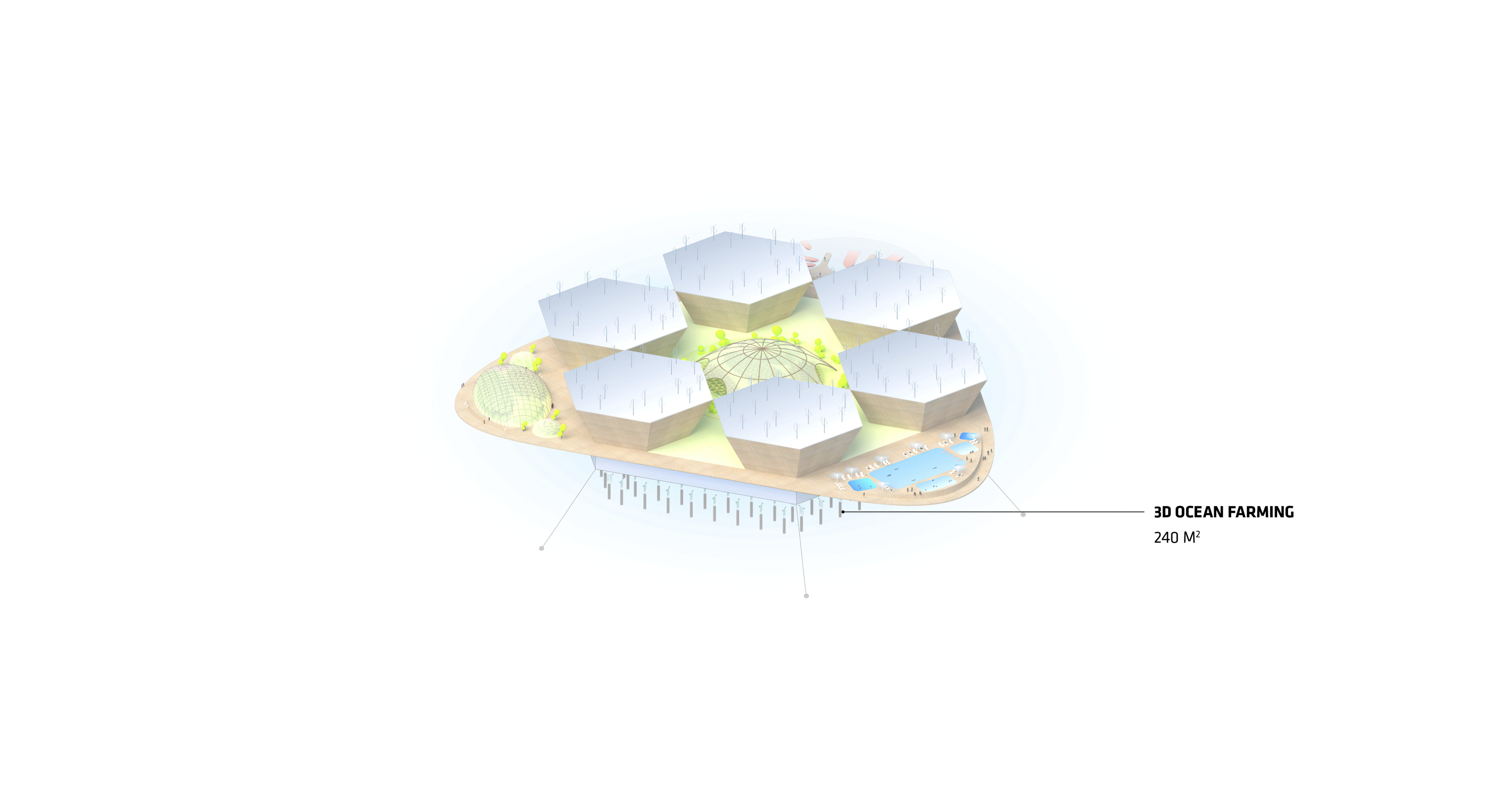 Below sea level, beneath the platforms, biorock floating reefs, seaweed, oysters, mussel, scallop and clam farming clean the water and accelerate ecosystem regeneration.