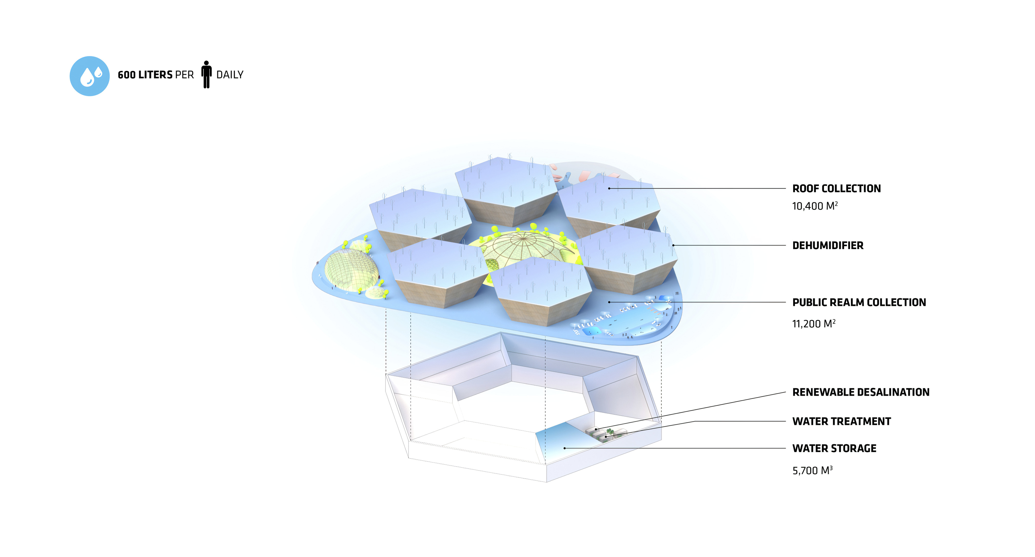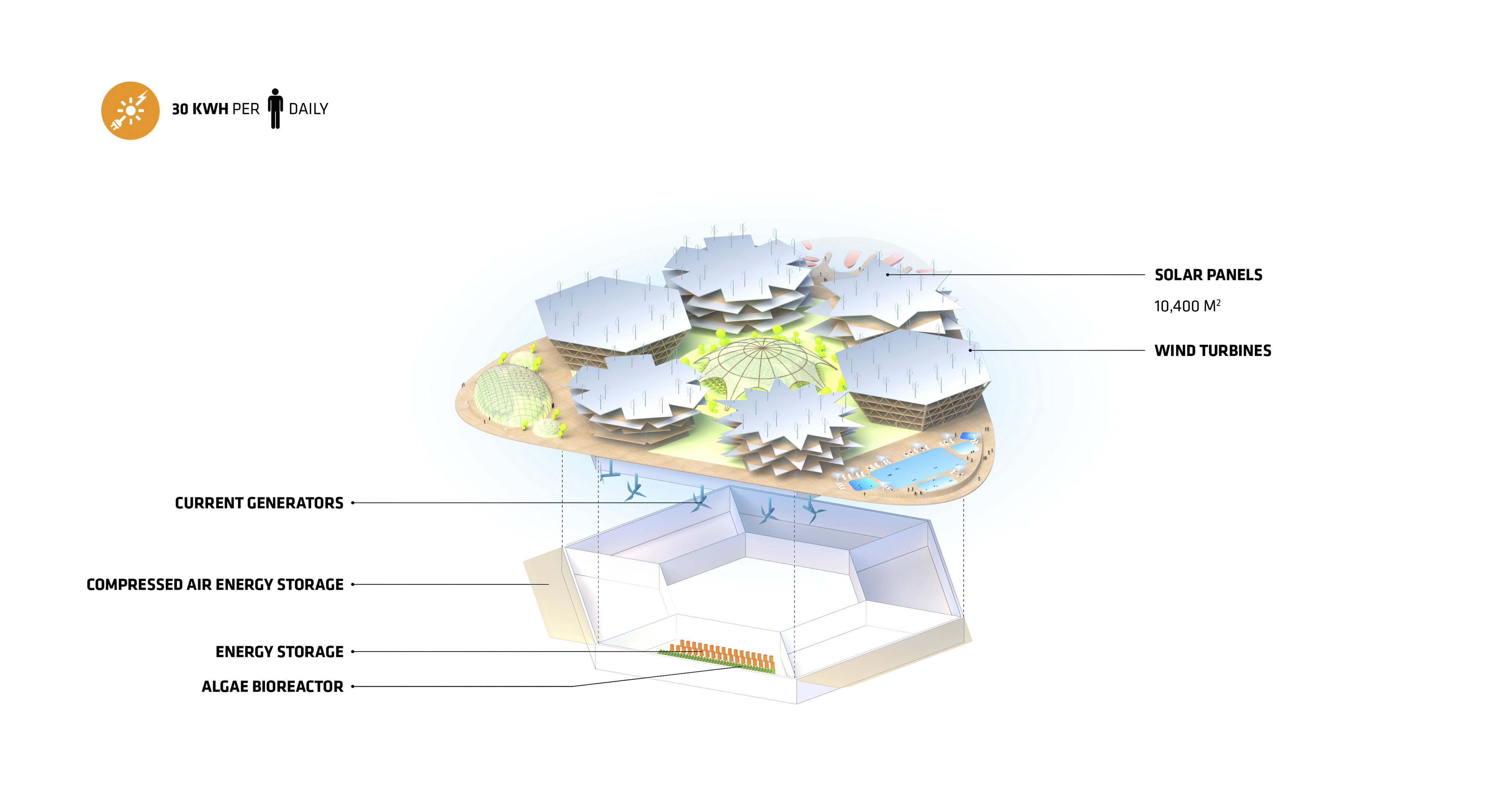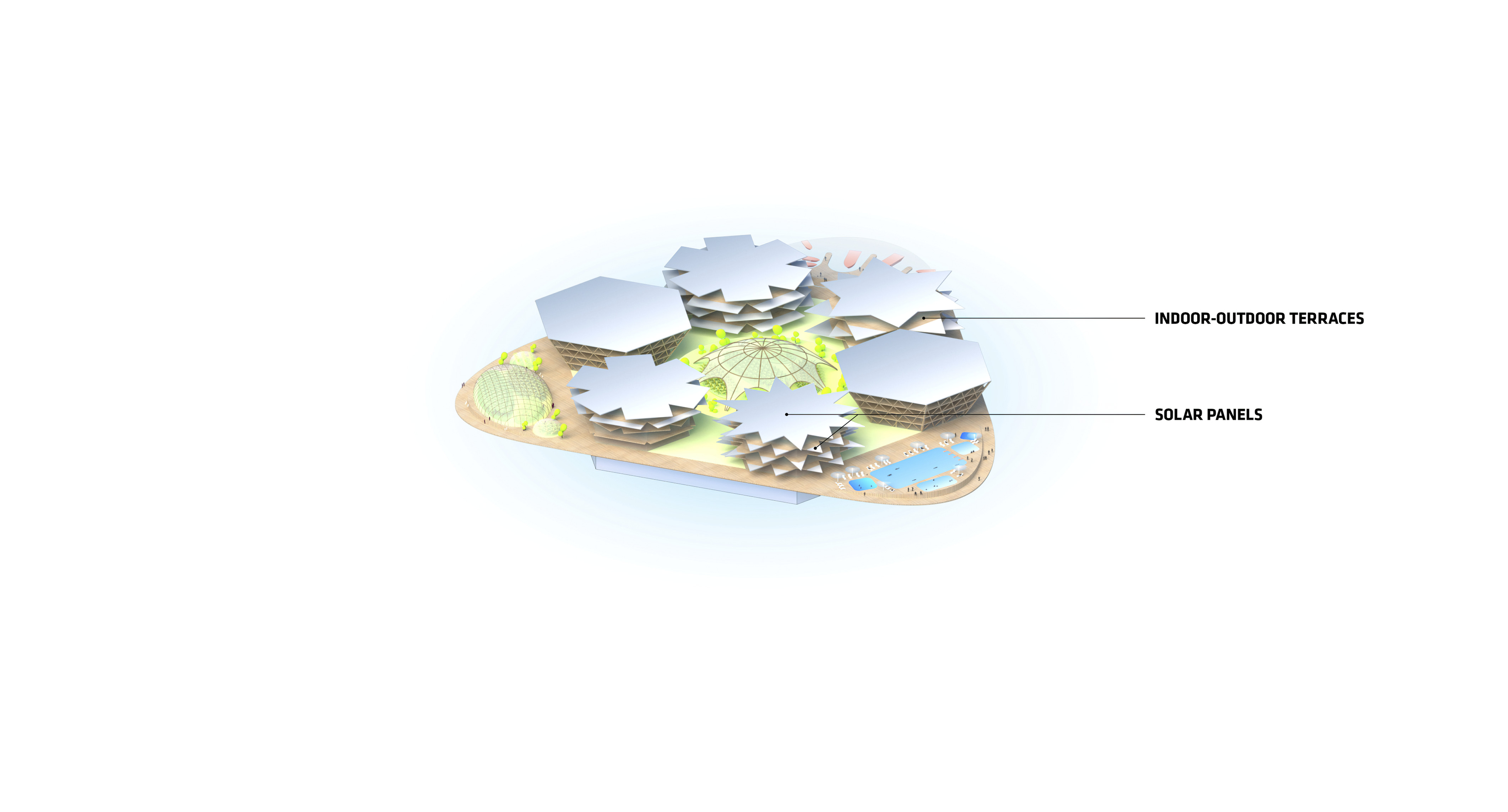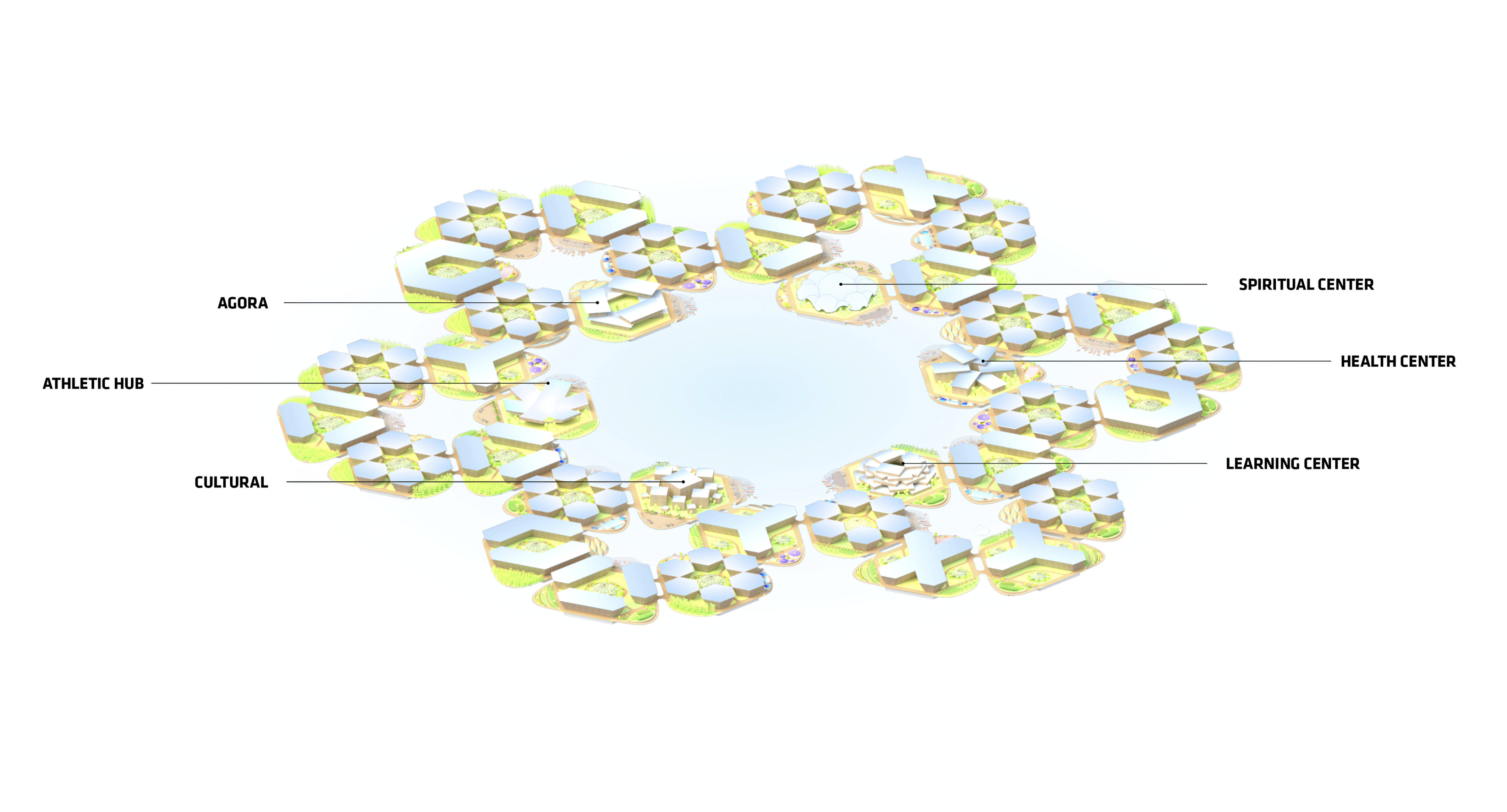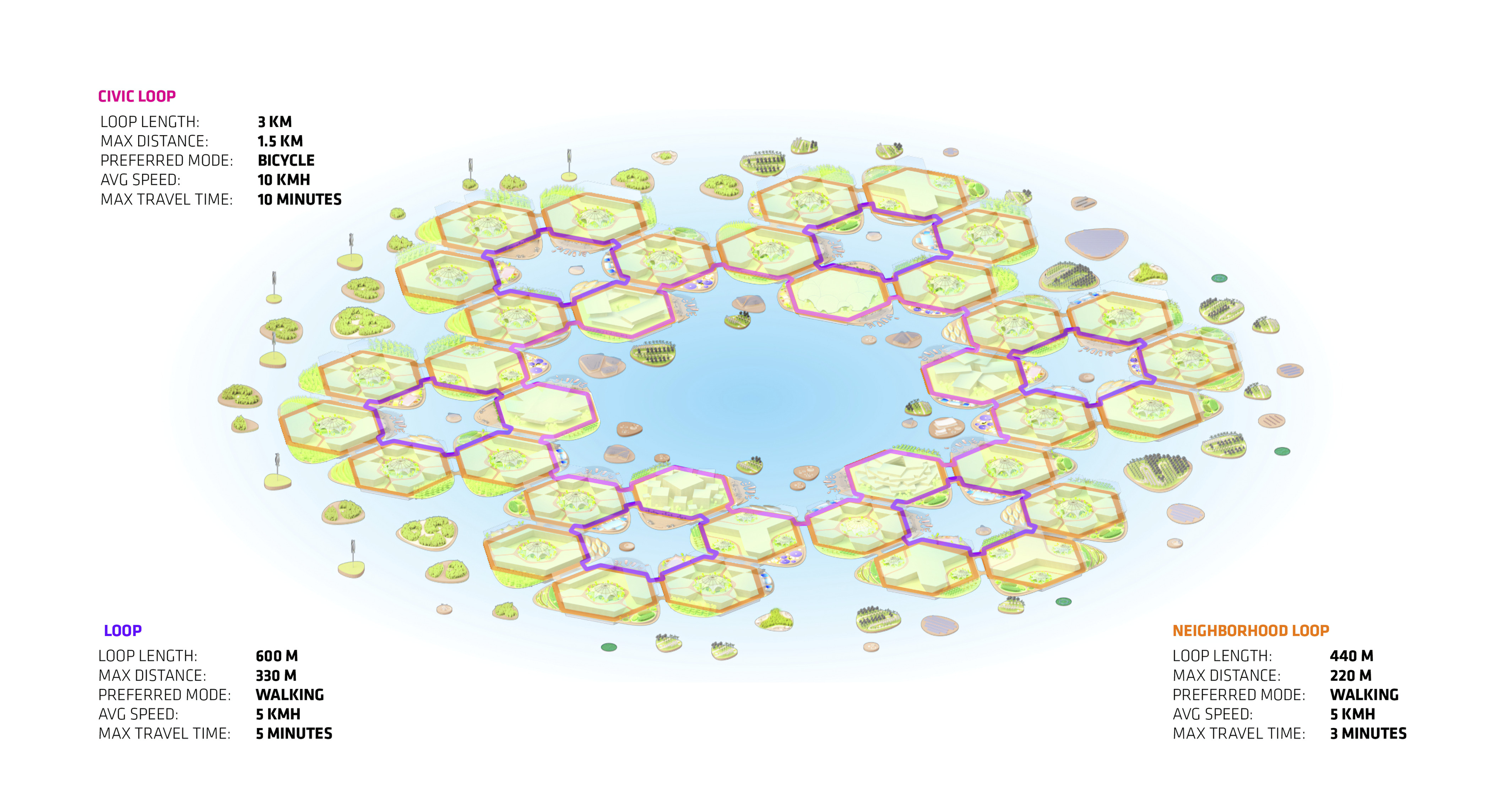 Social, recreational and commercial functions are placed around the sheltered inner ring to encourage citizens to gather and move around the village. Residents can easily walk or boat through the city using electric vehicles.
